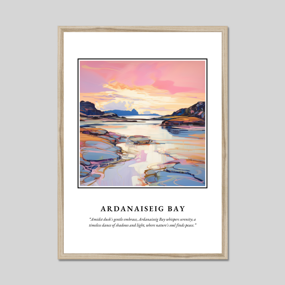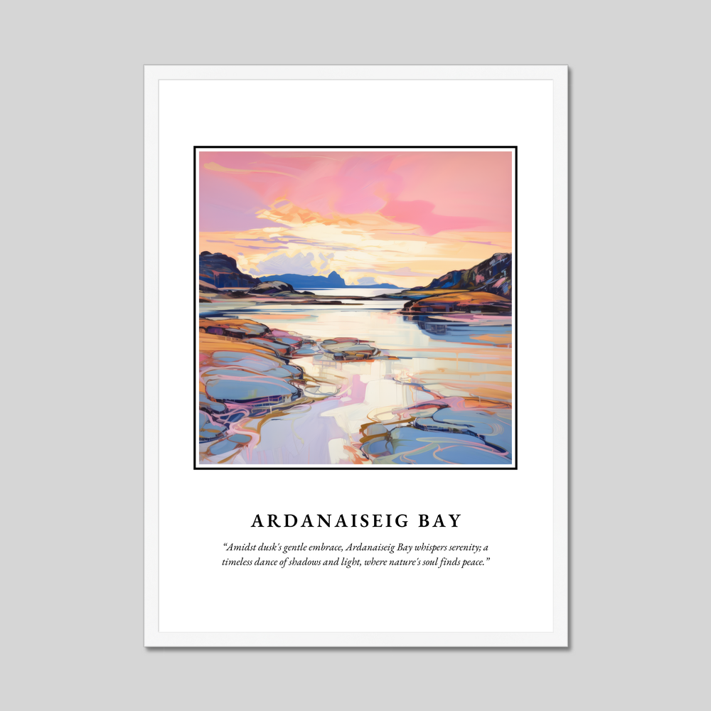 Enhancing the visual splendour is a poignant quote that reads, “Amidst dusk's gentle embrace, Ardanaiseig Bay whispers serenity; a timeless dance of shadows and light, where nature's soul finds peace.” This thoughtful inscription enriches the artistic narrative, offering more than just aesthetic pleasure—it invites reflection and stirring memories for anyone familiar with the bay's tranquil charm.