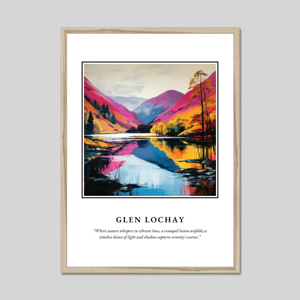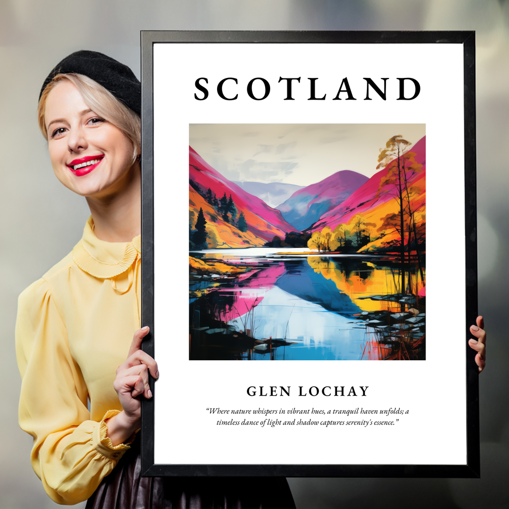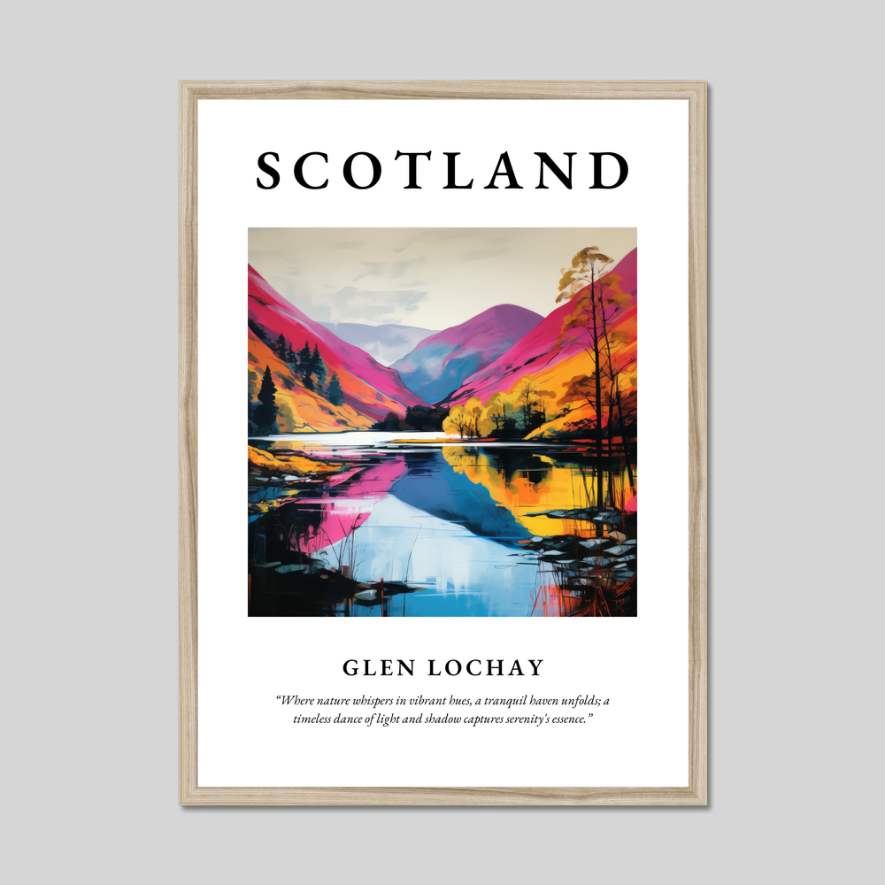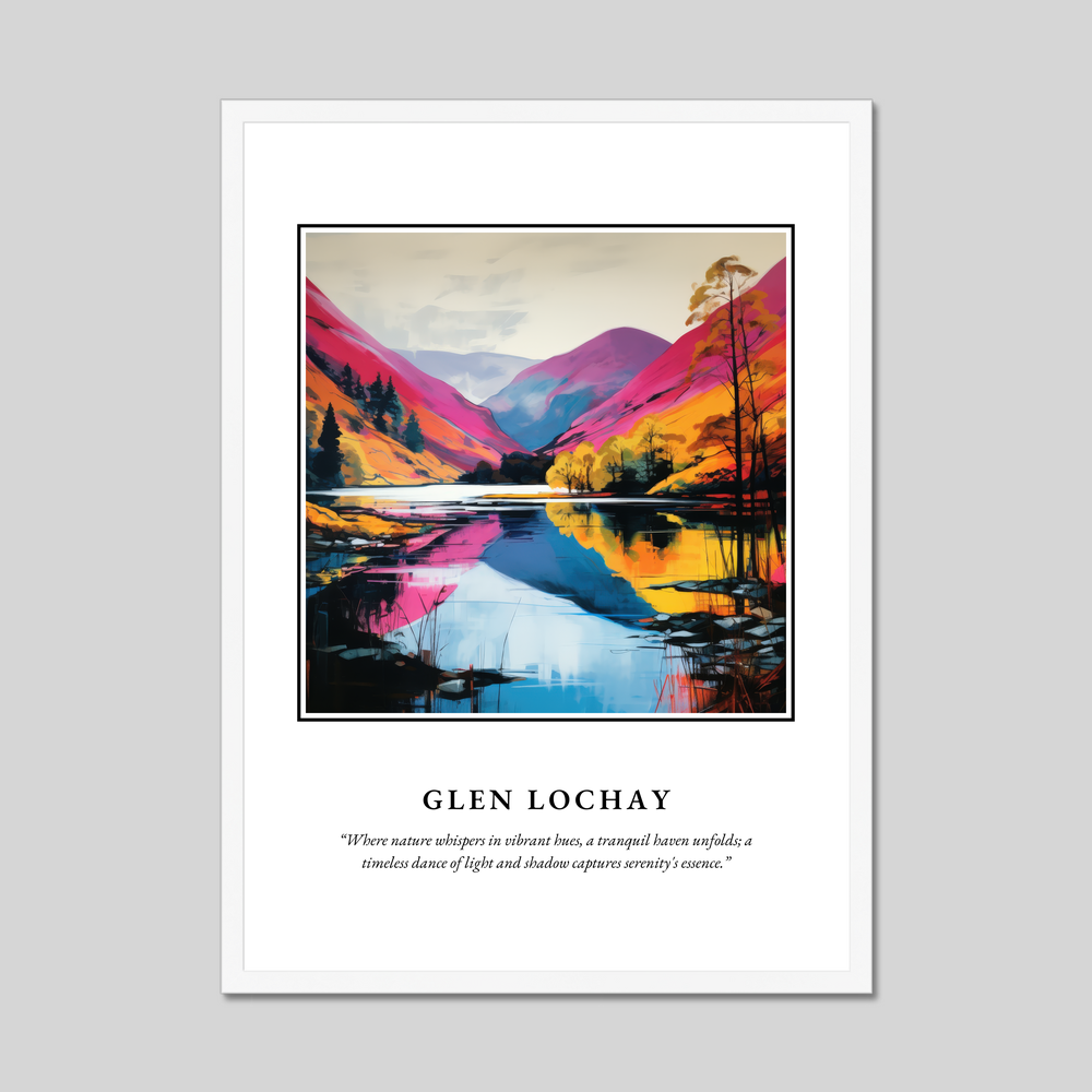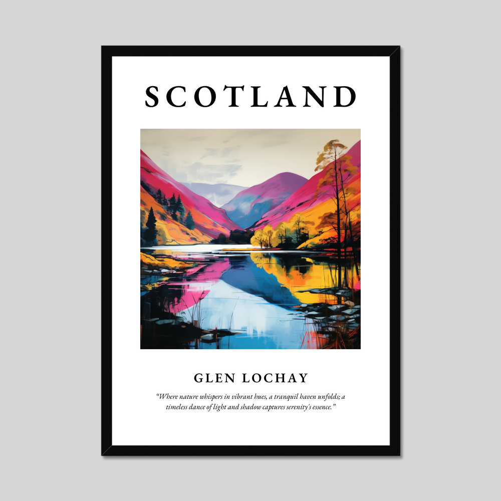 At the top, "SCOTLAND" leaps out in bold lettering, commanding attention and setting the stage for the striking imagery below. The heart of this artwork lies in a brilliant reimagining of Glen Lochay—a symphony of colours where pinks, yellows, and blues converge to reimagine the serene beauty of the natural world. The poster is anchored with the evocative quote, “Where nature whispers in vibrant hues, a tranquil haven unfolds; a timeless dance of light and shadow captures serenity's essence,” encapsulating the calm and allure this piece radiates.