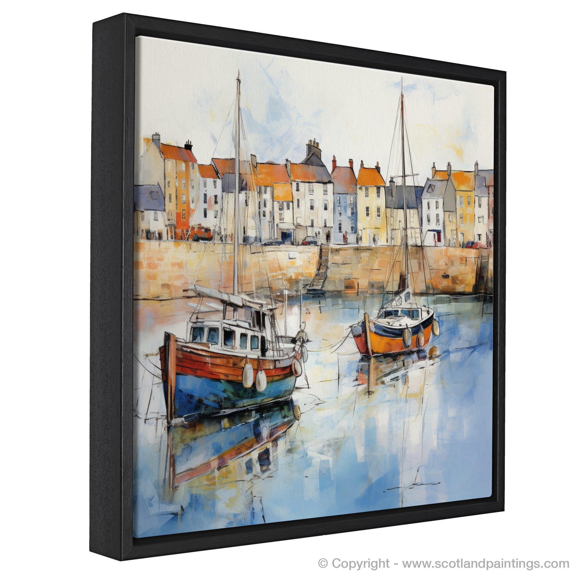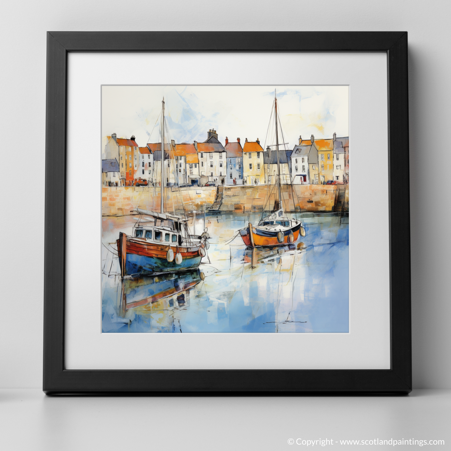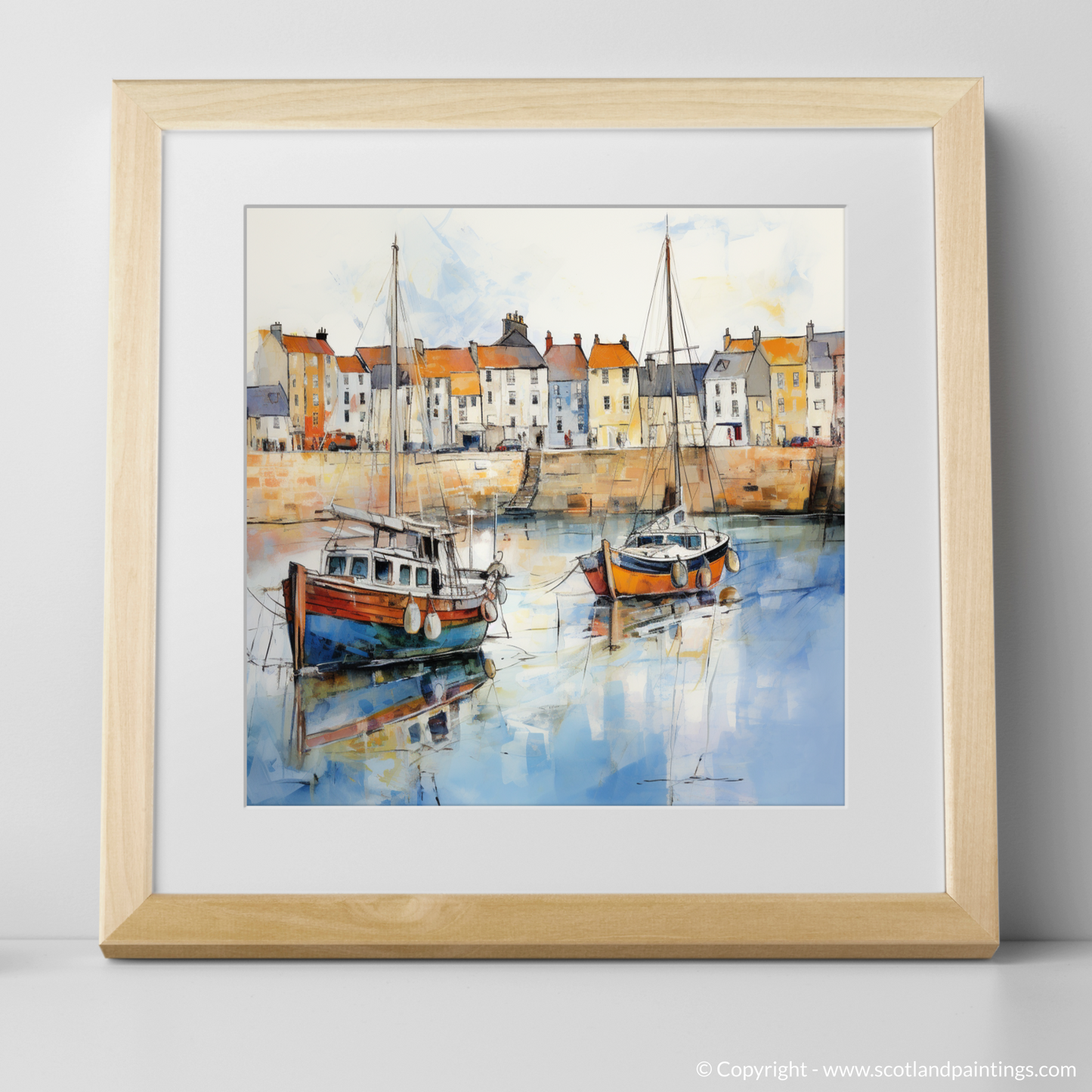As if captured through the dreamy mists of time, this evocative impressionist print invites the viewer to a serene moment in Anstruther, Fife, a charming village nestled along the Scottish coast. The artwork presents a vivid yet soft portrayal of the village's waterfront, where the calm waters gently cradle an array of fishing boats. Dominating the foreground are two boats, one a rich cobalt blue punctuated by orange buoy accents, the other a muted brown and white, both tethered securely, and reflecting tranquilly on the water's glassy surface.