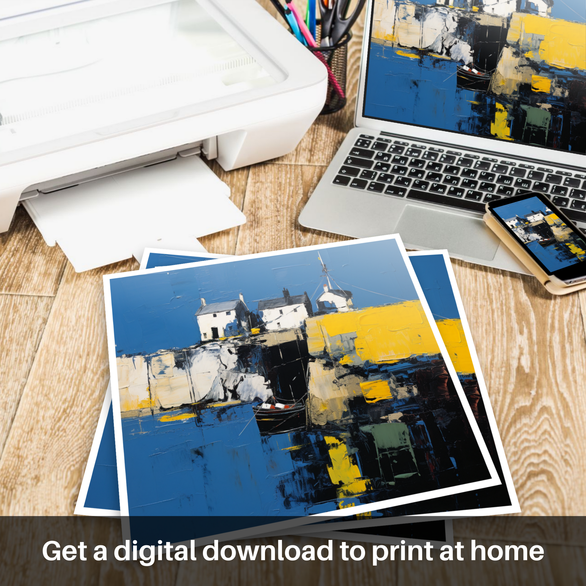 Let the bold strokes and vivid contrasts of this abstract impressionist illustration invite you on a picturesque journey to the historic Portsoy Harbour, located in the serene Aberdeenshire landscape. A harmonious blend of cerulean and sapphire hues forms the essence of the sea and sky, showcasing the tranquil life of this Scottish harbour through a dance of colour and texture.