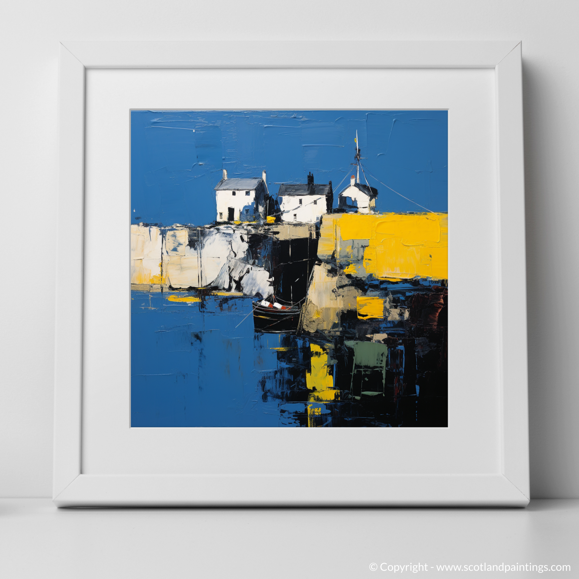 Striking splashes of golden and ochre tones emerge, reminiscent of the rugged coastline's natural flora and the golden glow of a setting sun casting its warmth upon the harbour. The painting's captivating palette is a testament to the raw beauty of this coastal region and serves as a bold centrepiece for any lover of maritime Scotland.