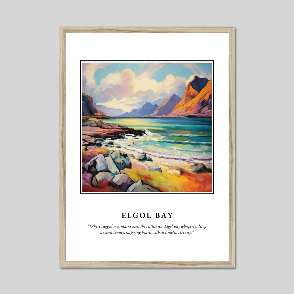 The accompanying quote – “Where rugged mountains meet the restless sea, Elgol Bay whispers tales of ancient beauty, inspiring hearts with its timeless serenity” – perfectly encapsulates the enchanting spirit of this mystical location. Whether you have visited this remarkable bay or dream of exploring its shores, this artwork serves as a portal to cherished memories and aspirations.