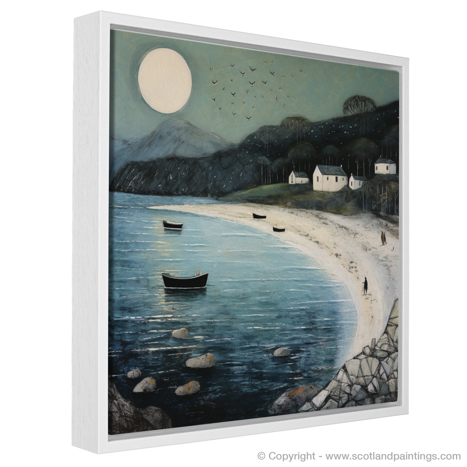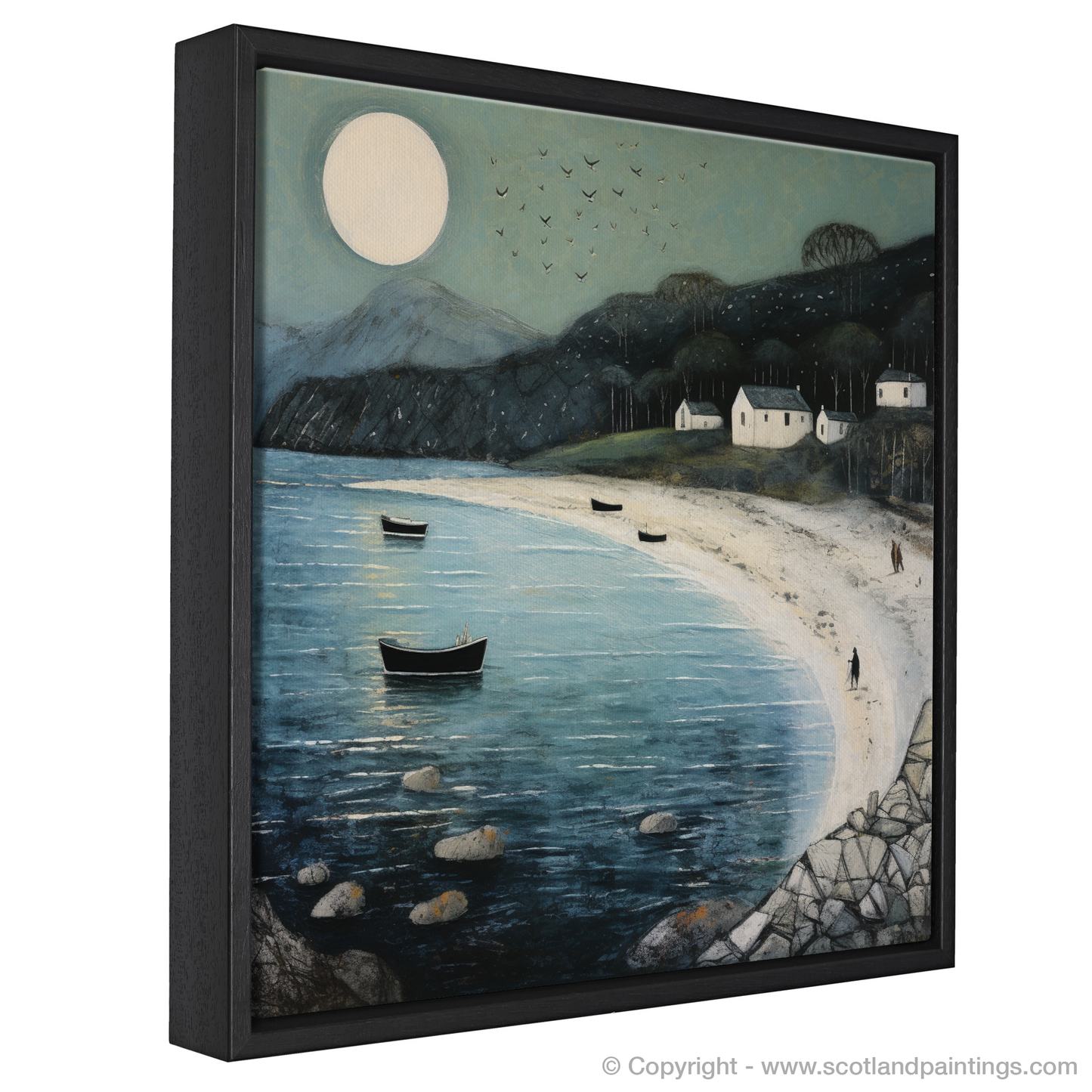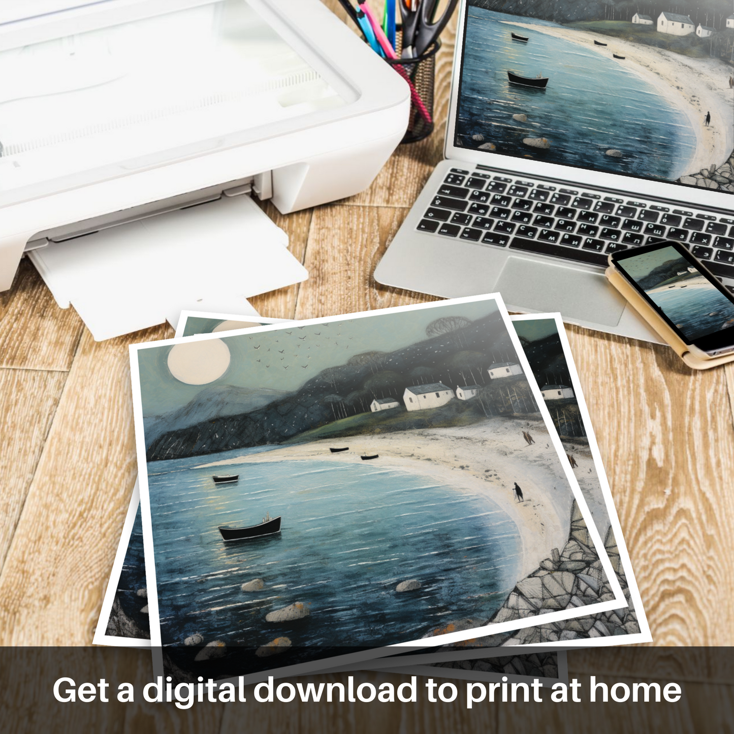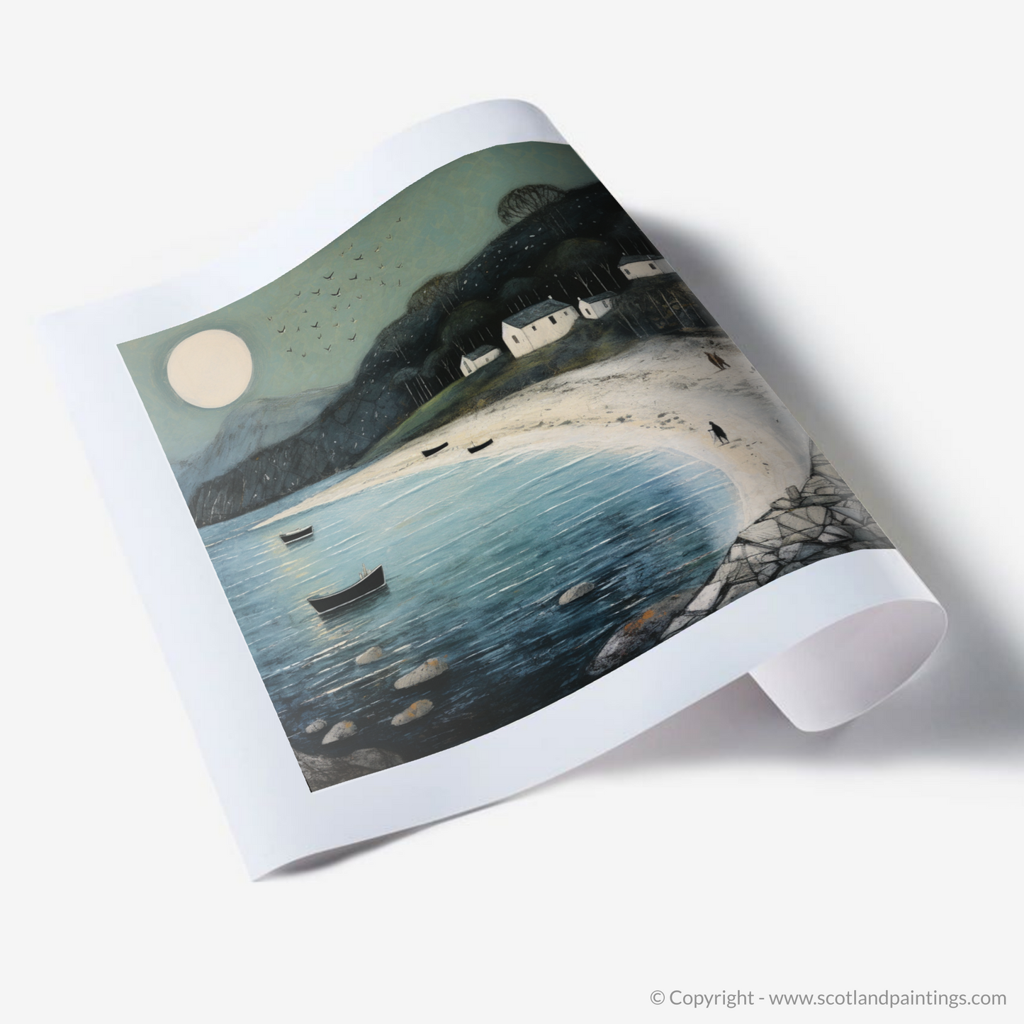 Cast your gaze upon this evocative portrayal of a serene beach scene, embodying the untouched charm of the Scottish coastline. The calming expanse of Calgary Bay unfolds in a palette of hushed blues and dusky greens, capturing the whimsical essence of Naive Art. An almost celestial sphere bathes the landscape in a soft, pearlescent glow, revealing a dusk that dances gently over land and sea.