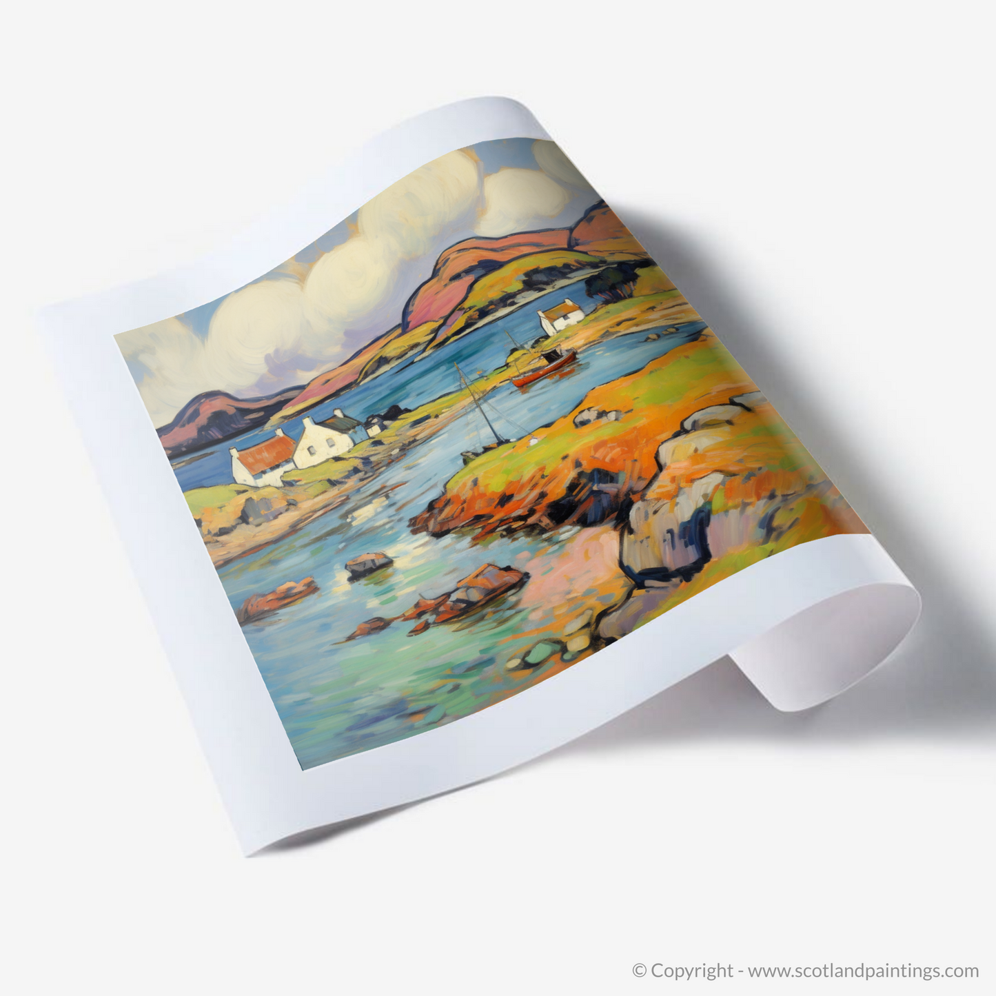 This print, a part of the 'Scottish Islands' collection, captures the untamed spirit of the Hebridean landscapes while paying homage to the unrestrained joy and led by emotion inherent in Fauvist works. It is a tribute to nature's palette, an idyllic blend of serenity and vivid expression, perfect for anyone wishing to bring the lyrical beauty of the Scottish Isles into their space.