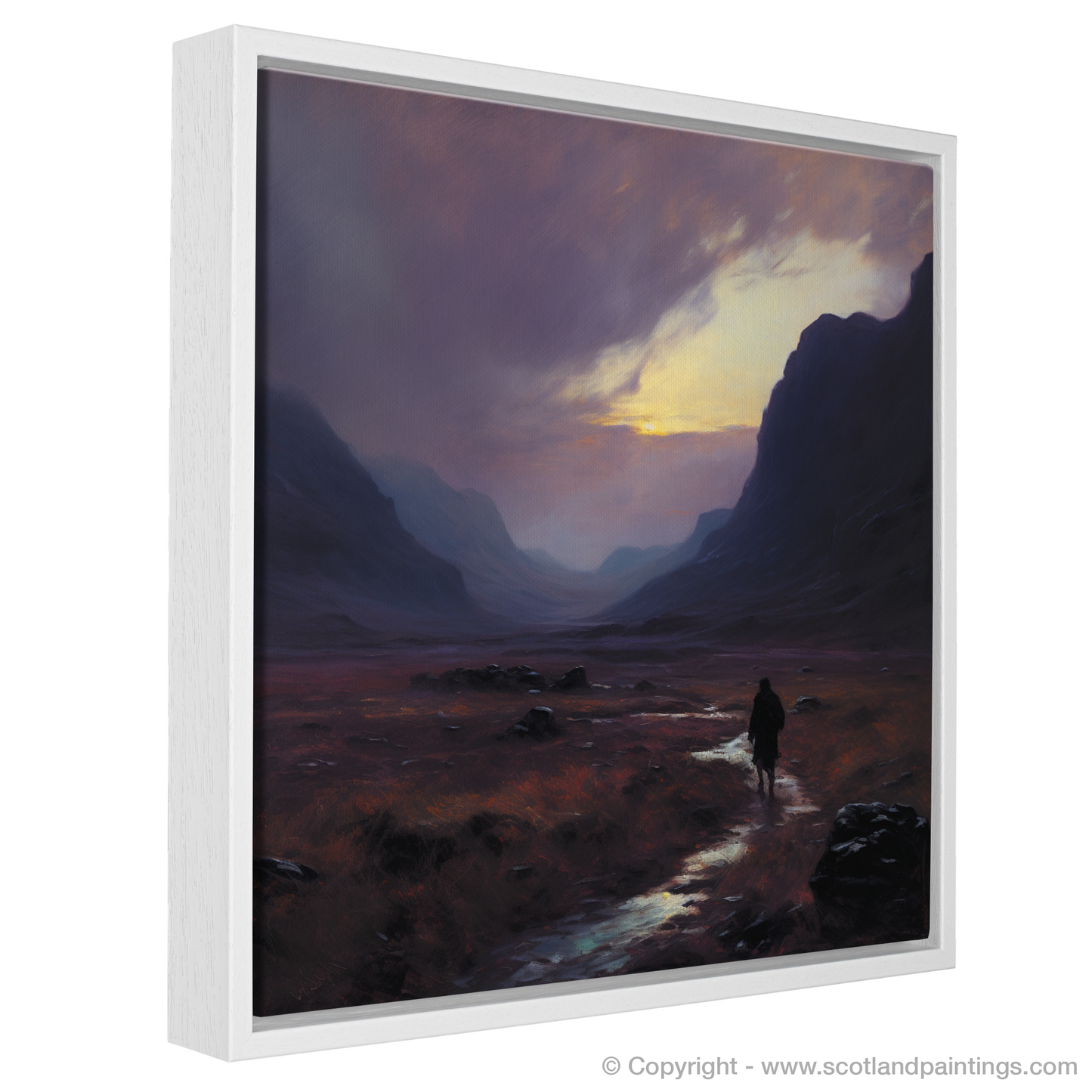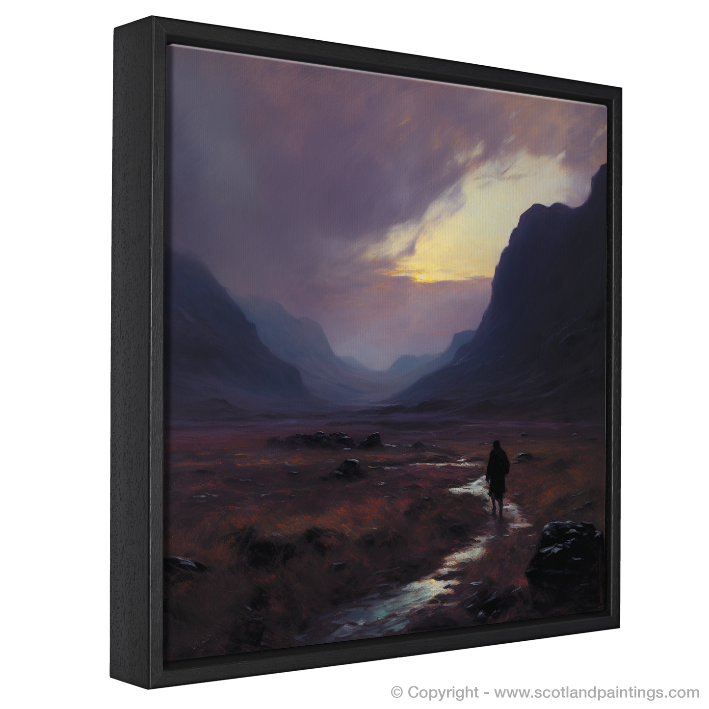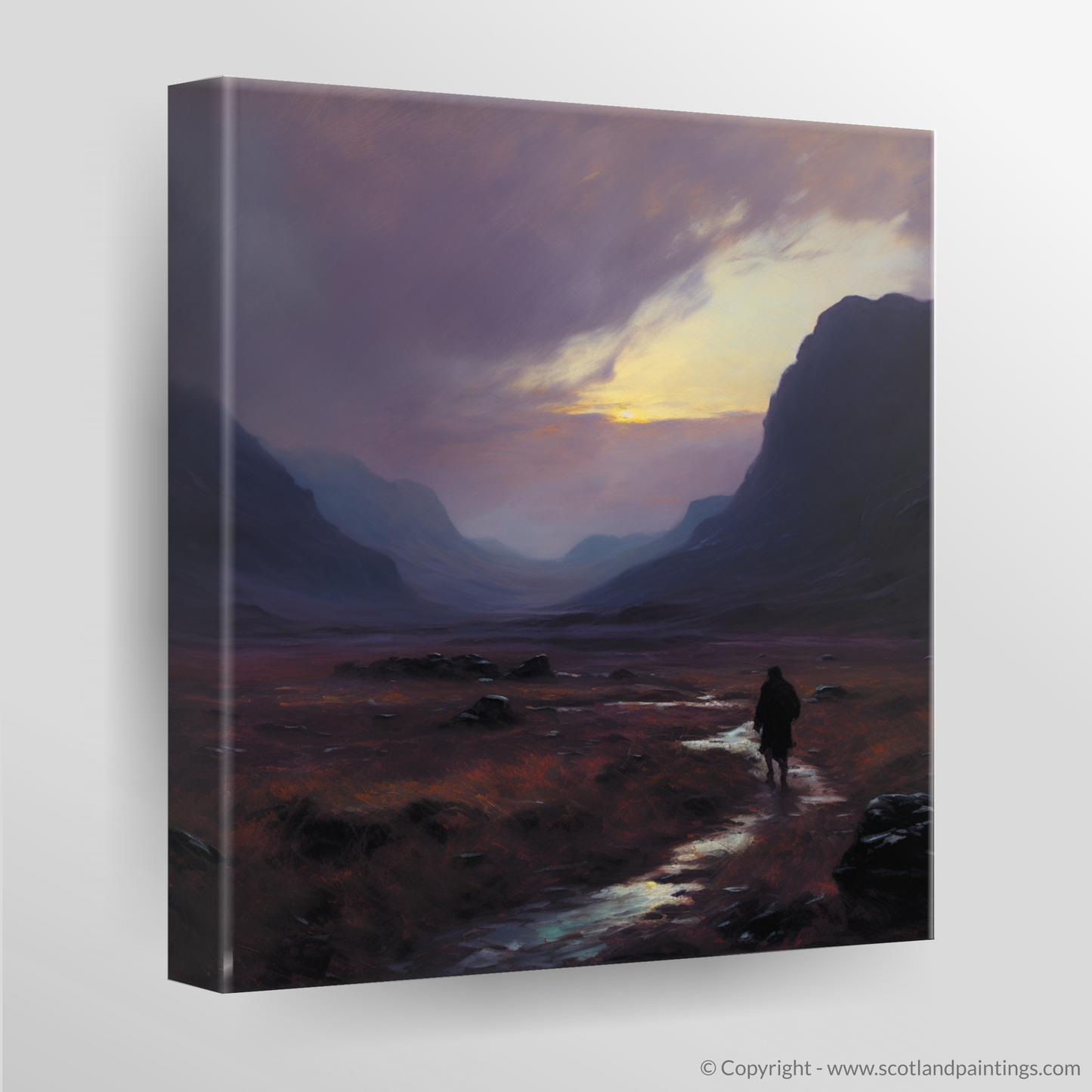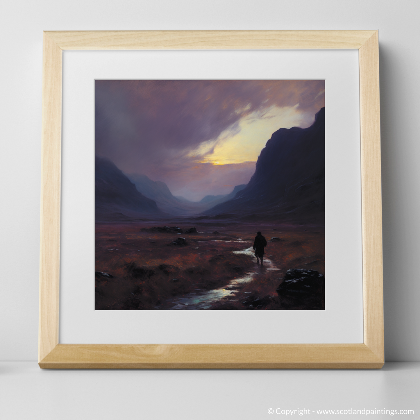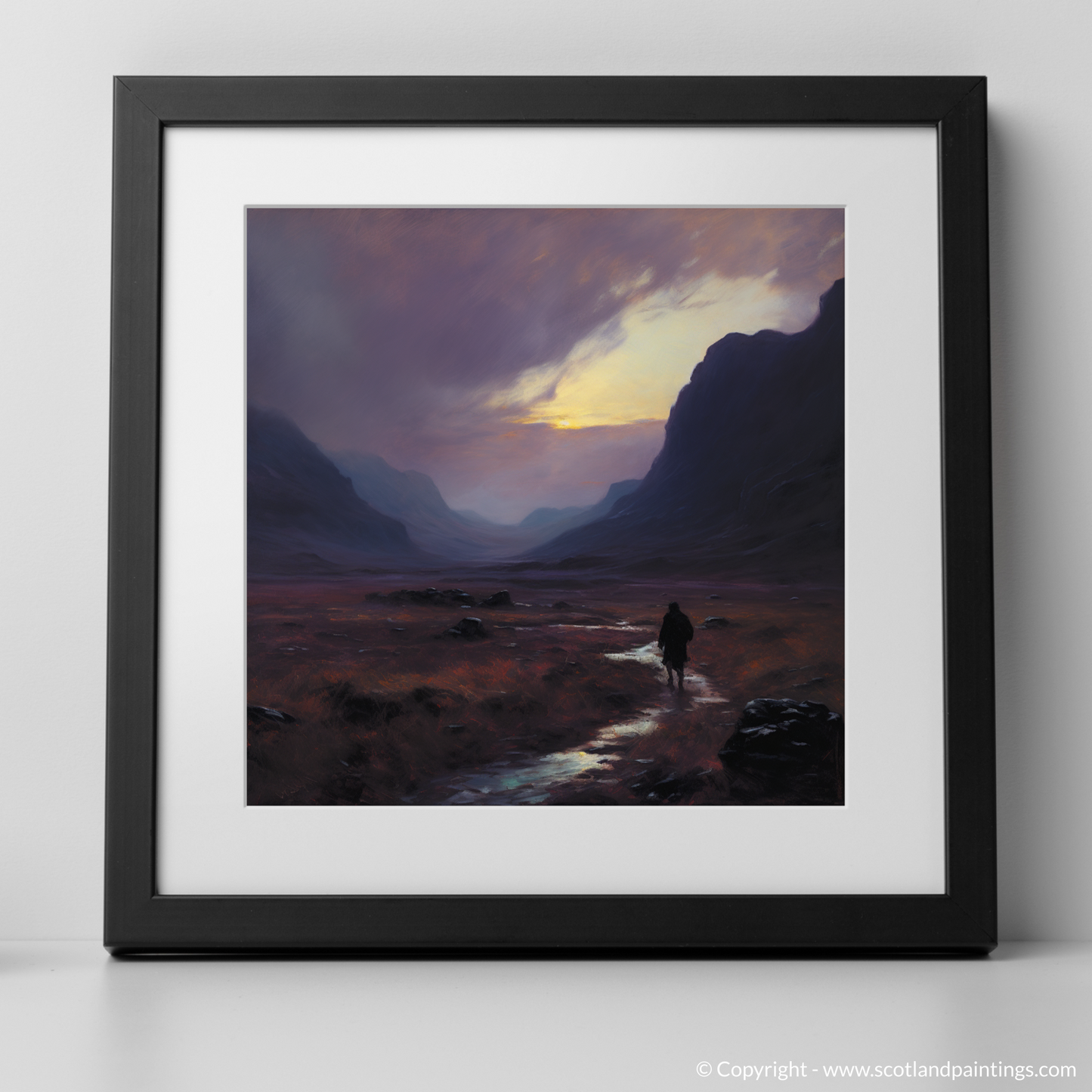 Capturing the ephemeral beauty of twilight spectacles, this evocative print invites the viewer into a serene yet stirring rendition of Glencoe at dusk. In the grips of waning light, the landscape is bathed in a rich tapestry of purples and mauves, as the daylight retreats beneath a grand display of amber and gold that graces the setting sun's sky.