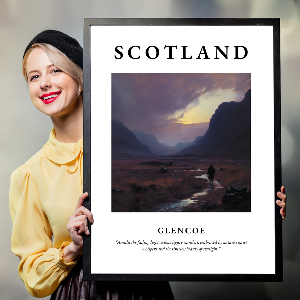 The poster features the word “SCOTLAND” in bold, eye-catching letters, above a mesmerising Art Nouveau painting of Glencoe. The painting beautifully captures the serene landscape bathed in the gentle hues of twilight, where a lone figure wanders amidst nature's quiet whispers. The scene is imbued with a dreamlike quality, inviting you to lose yourself in its timeless beauty. Beneath the painting, a poignant quote reads: “Amidst the fading light, a lone figure wanders, embraced by nature's quiet whispers and the timeless beauty of twilight.”