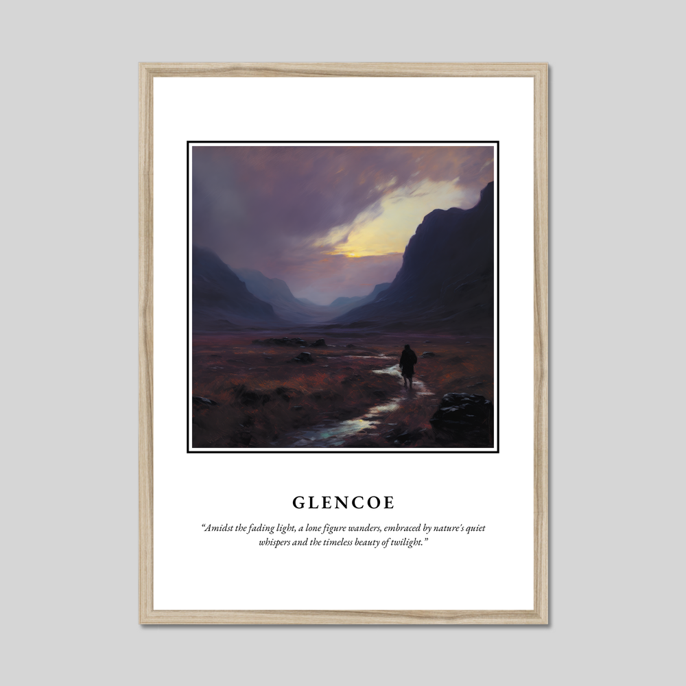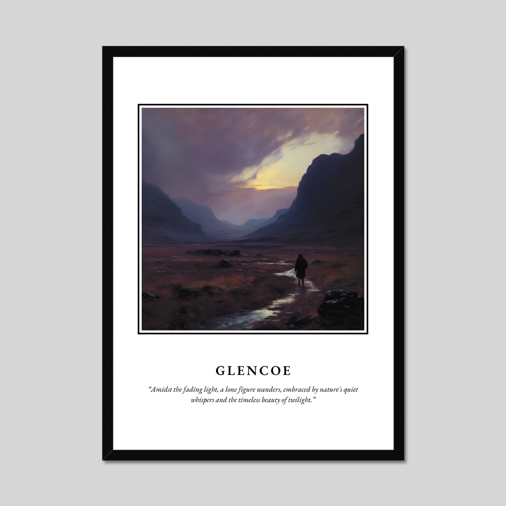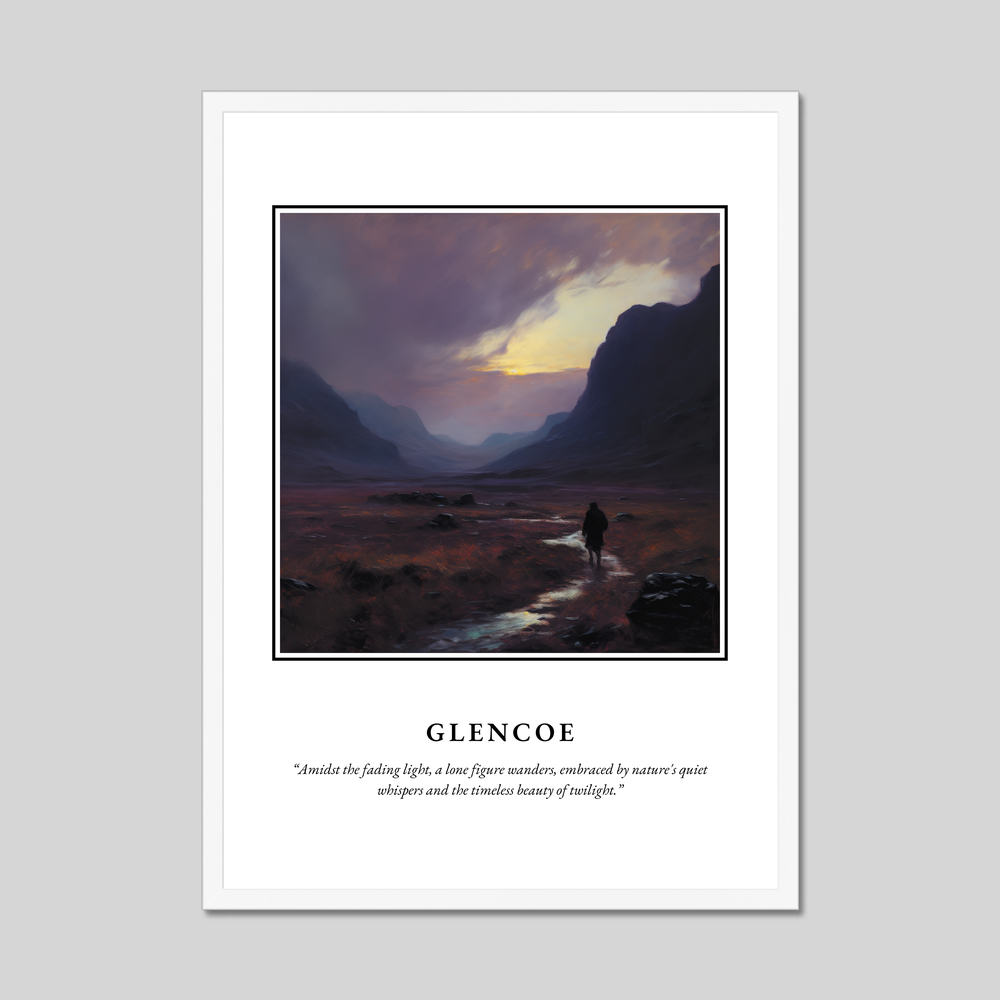 Glencoe, located in the heart of the Scottish Highlands, is renowned for its awe-inspiring vistas and dramatic landscapes. Known as the 'Glen of Weeping,' it carries a profound history and a mystique that lures visitors from around the world. The poster's ethereal depiction echoes the melancholy beauty of this iconic location, where rugged mountains and tranquil valleys create a harmonious juxtaposition that captures the soul.