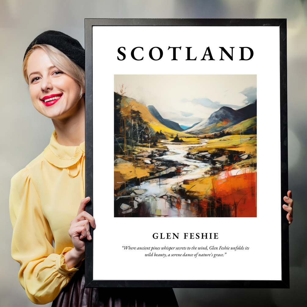 At the top, the word "SCOTLAND" proudly asserts itself in big, bold lettering, inviting viewers to explore the vibrant world of Scottish beauty. Beneath, a mesmerising Pop Art painting of Glen Feshie dazzles the eye. The bold colours and dynamic contrasts breathe new life into this serene landscape, capturing the raw allure of nature’s splendour. The scene is completed with the poetic quote: “Where ancient pines whisper secrets to the wind, Glen Feshie unfolds its wild beauty, a serene dance of nature's grace.”