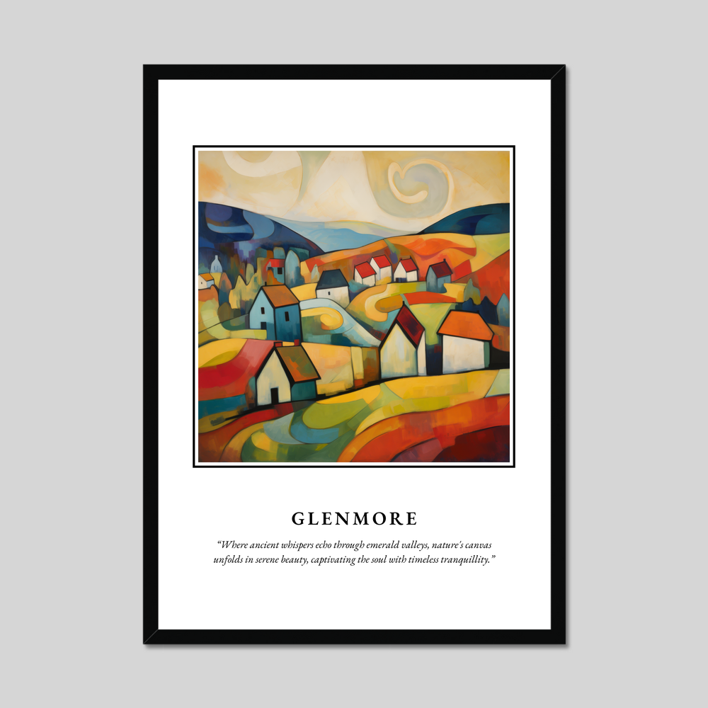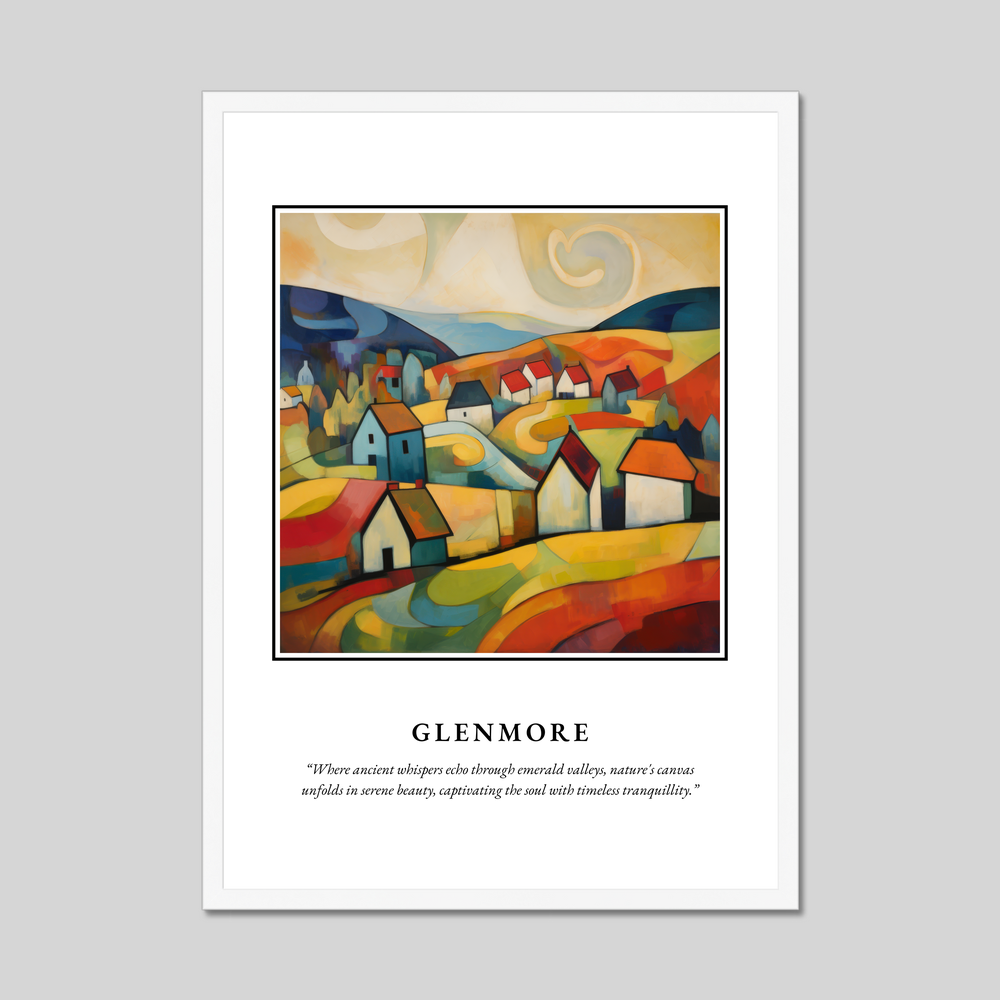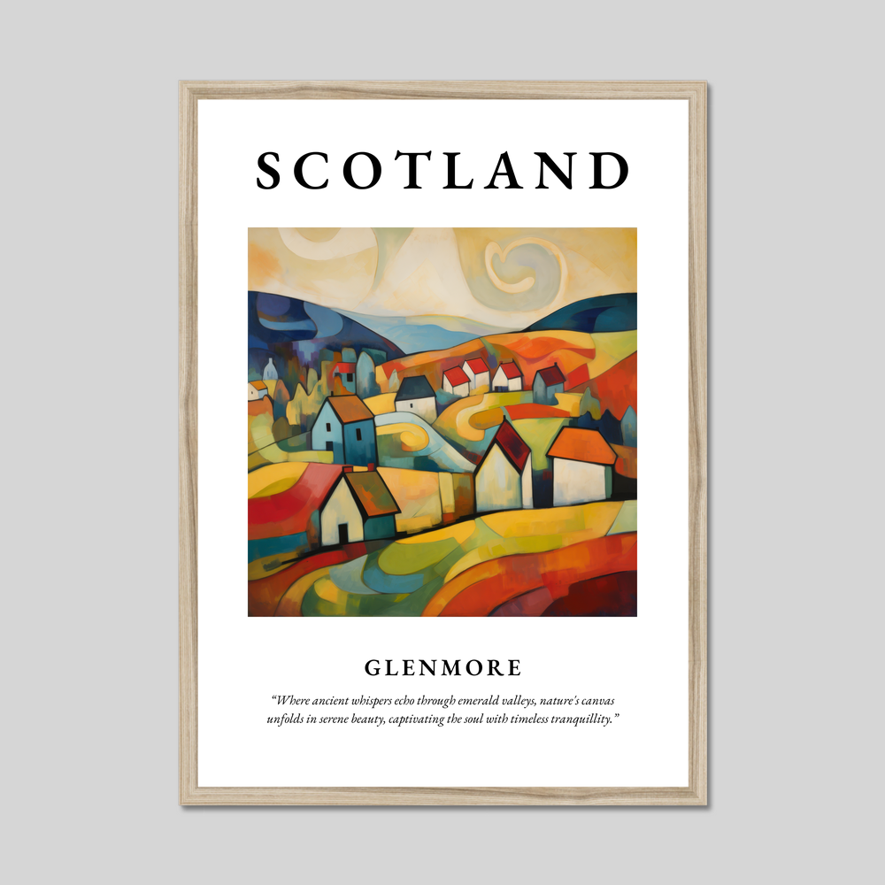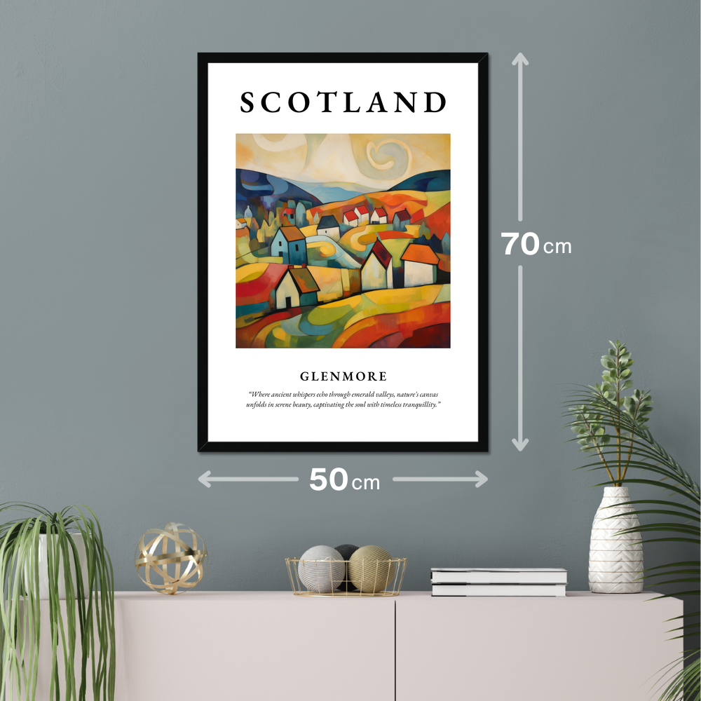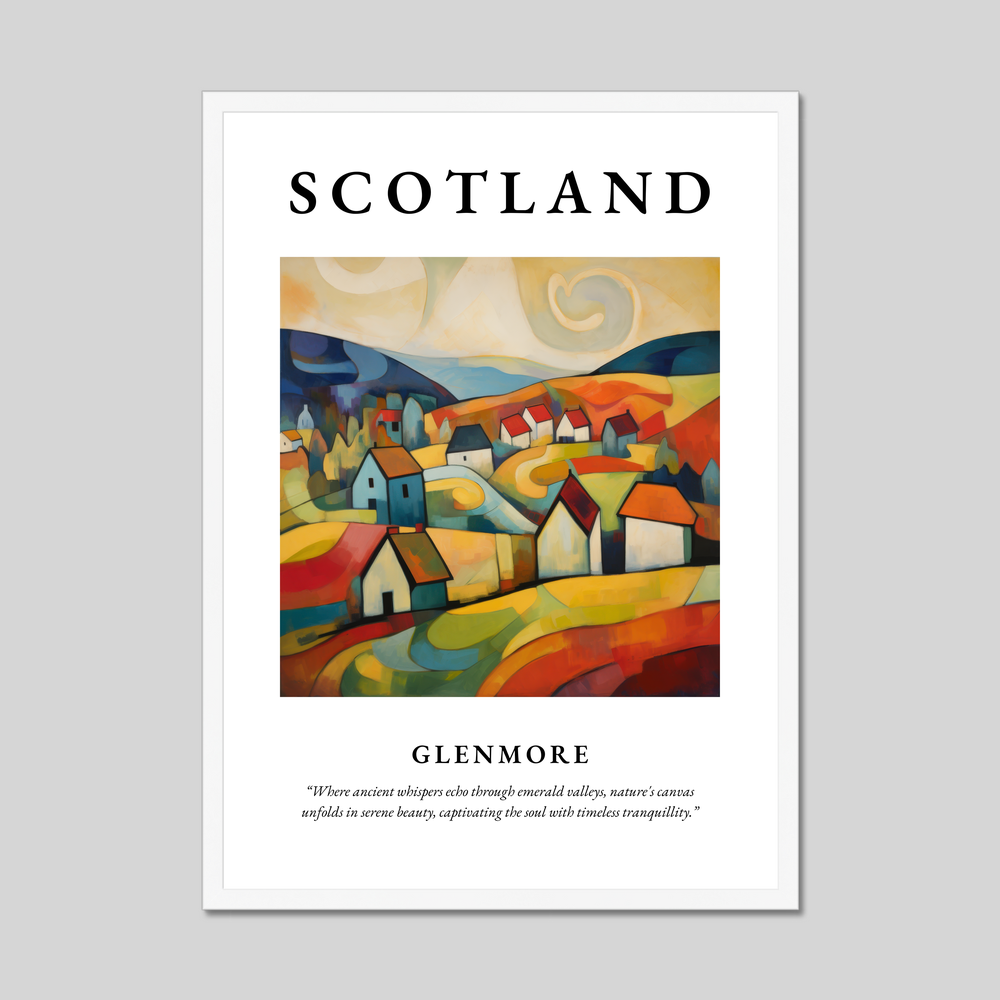 Adorning the top in big bold letters is “SCOTLAND,” inviting you to dive into a realm where artistry meets nature. The heart of this poster is an enchanting abstract painting of Glenmore, where vibrant swirls of colours dance together, depicting a whimsical landscape filled with rustic cottages and rolling hills. The abstract style brings a touch of modern sophistication, capturing the emotion of the land rather than just its likeness. Beneath this captivating artwork lies a poetic quote: “Where ancient whispers echo through emerald valleys, nature's canvas unfolds in serene beauty, captivating the soul with timeless tranquillity.”