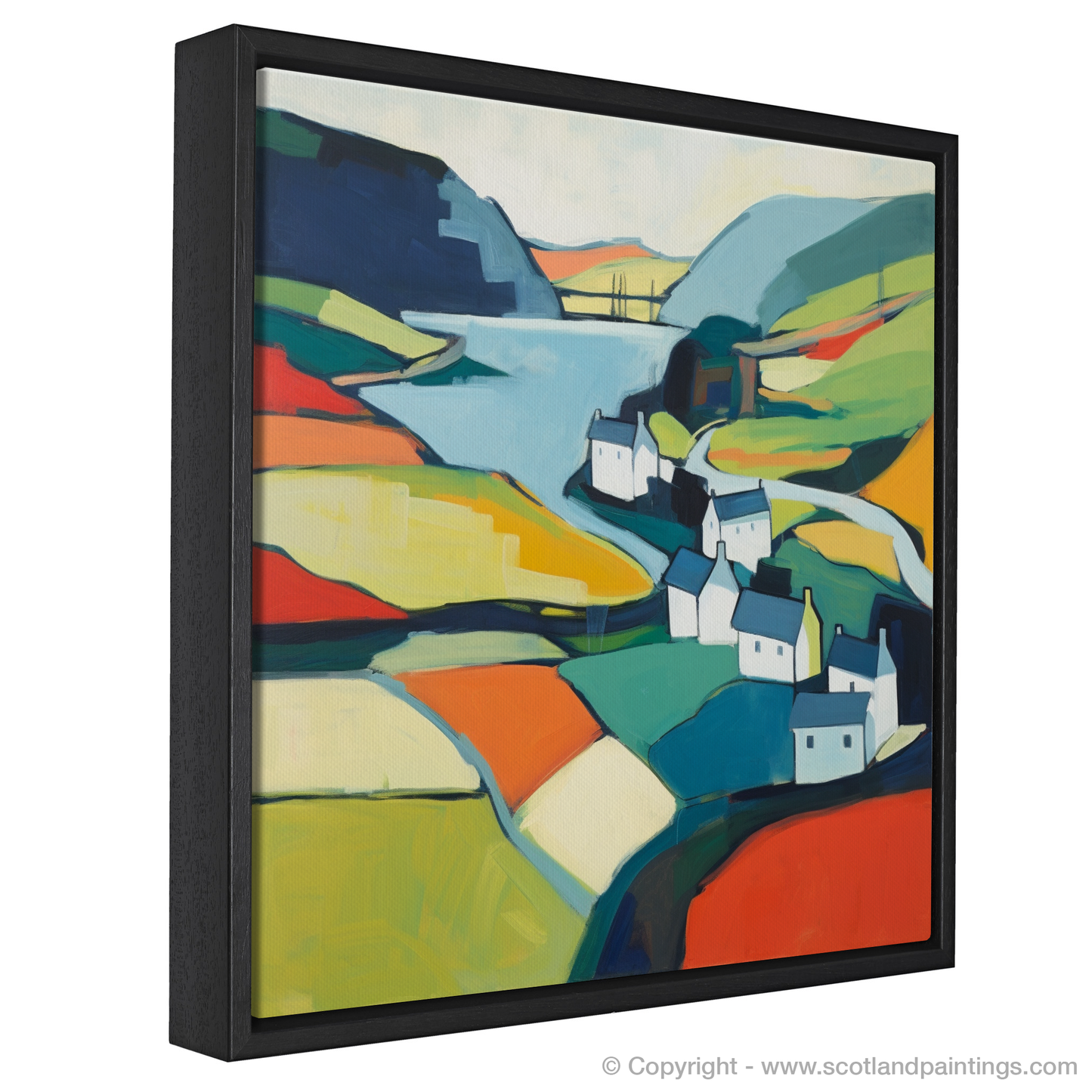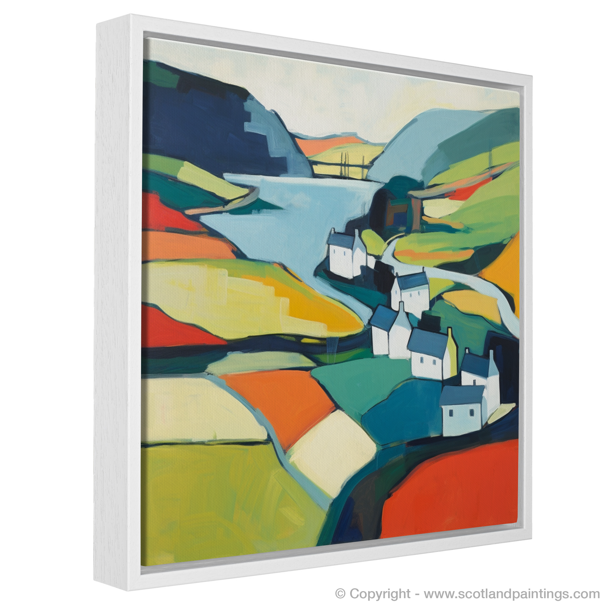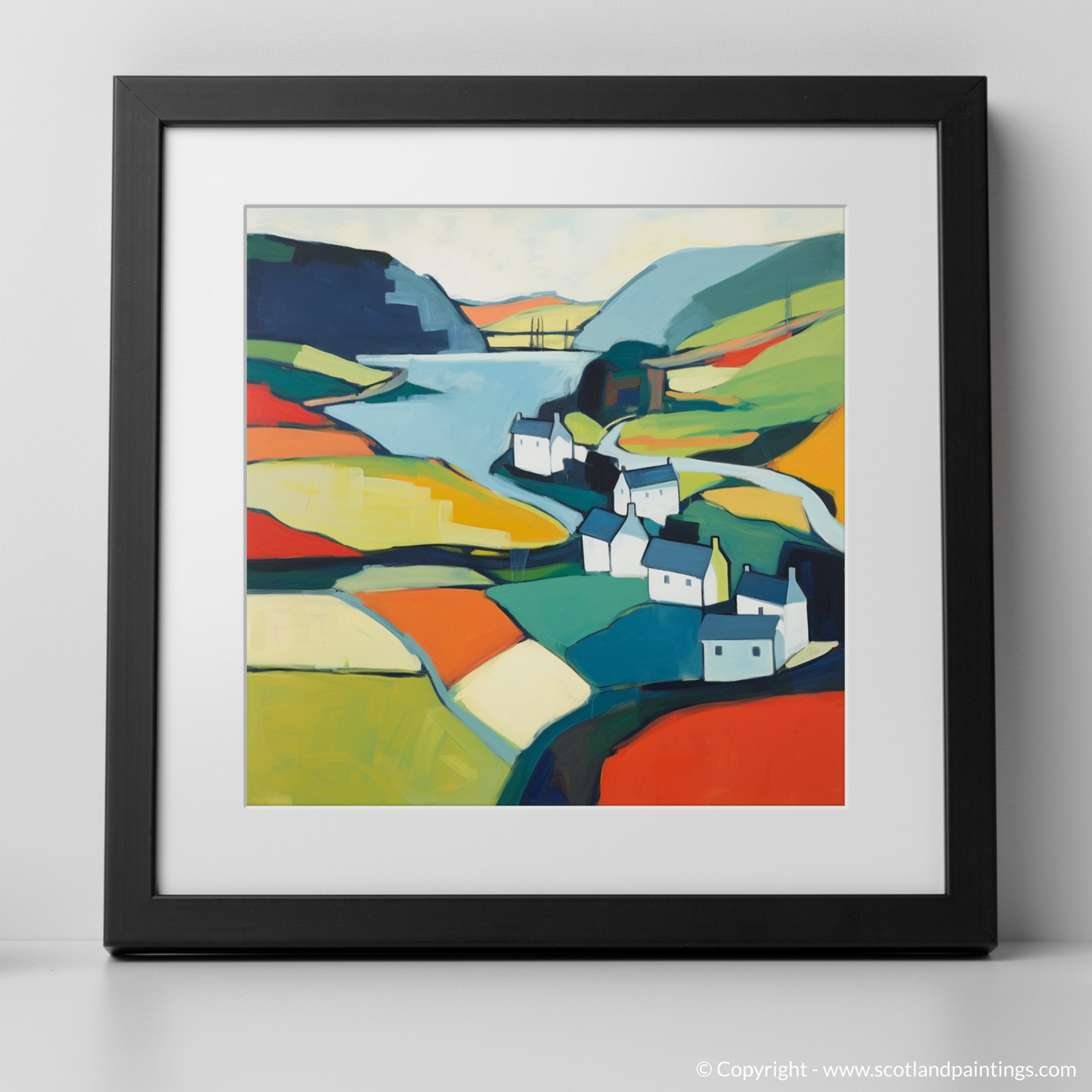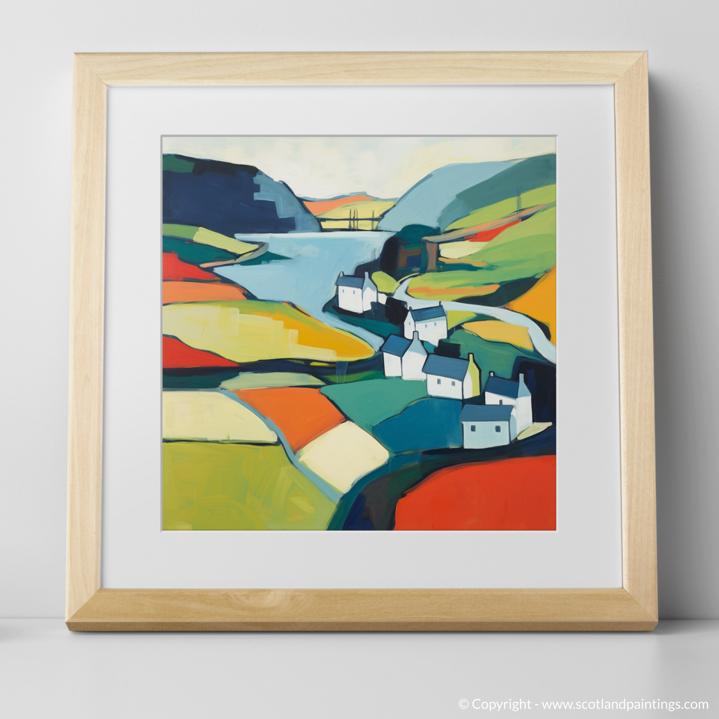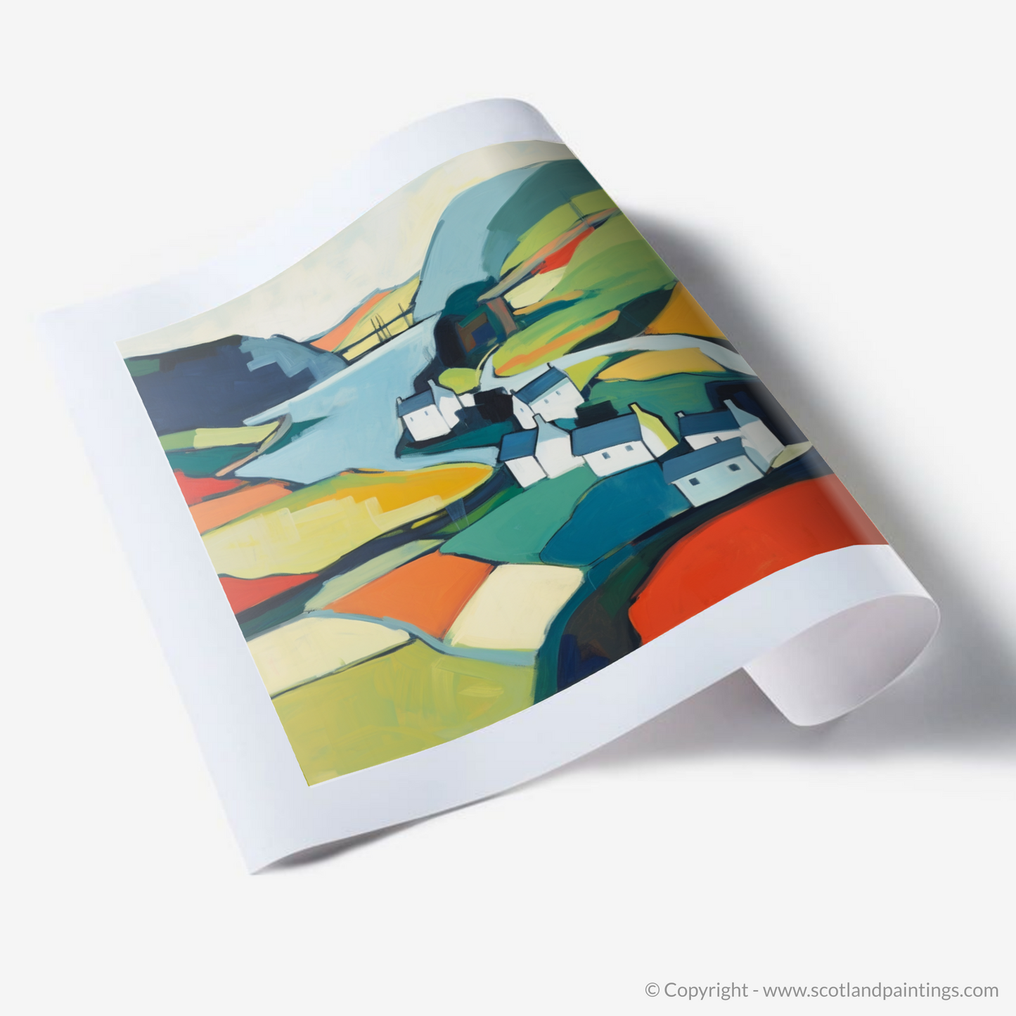 This evocative abstract rendering captures the essence of Glenmore in the Scottish Highlands through a bold interplay of colours and simplified forms. The artwork features a palette that harmonises earthy greens, vivid yellows, and deep blues, which rhythmically converge to form a captivating landscape. Rolling hills and open fields are composed of sweeping brushstrokes, their fluidity implying the movement of natural terrain. At the focal point of the print, a cluster of stark white houses stands out against the kaleidoscopic backdrop, their geometric shapes offering a serene contrast to the undulating contours of the surrounding countryside. The loch, depicted in serene hues of blue, adds an element of tranquillity and depth, reflecting the sky above and anchoring the composition in place. Bridges, hinting at human connection within this abstract world, traverse the water in simple, elegant lines.