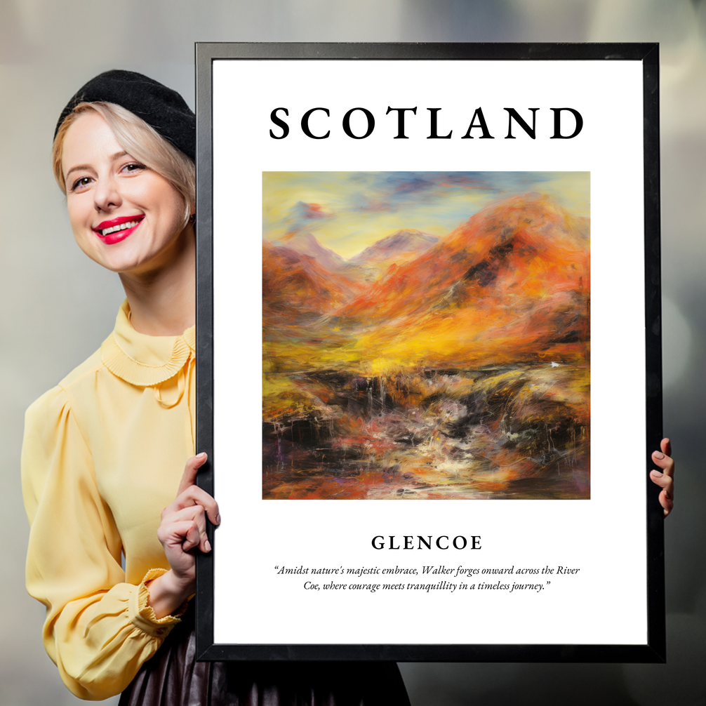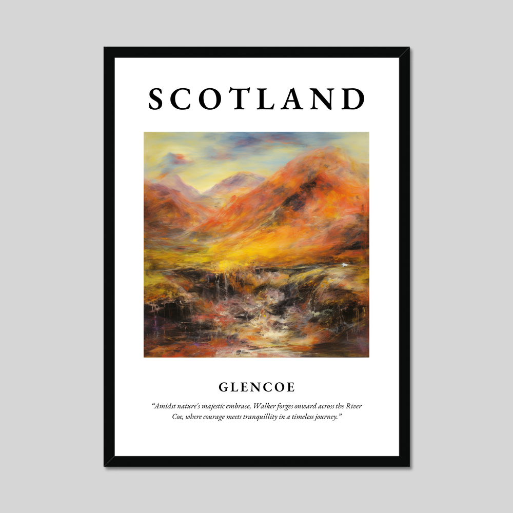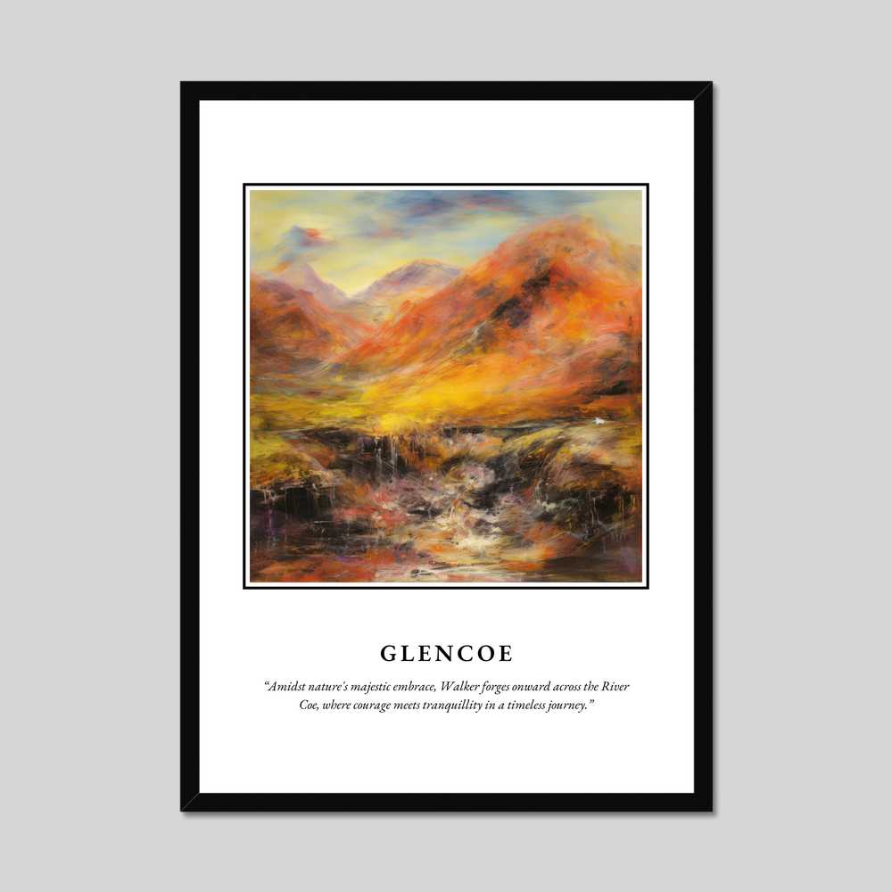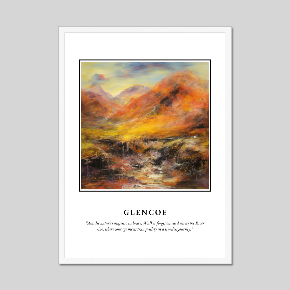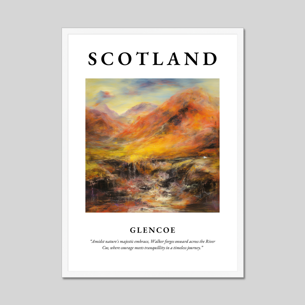 The bold "SCOTLAND" heading draws you into a mesmerising scene dominated by vibrant swirls of orange, yellow, and red, evoking the raw, untamed beauty of Glencoe. Below, a poetic quote evokes the spirit of adventure: "Amidst nature's majestic embrace, Walker forges onward across the River Coe, where courage meets tranquillity in a timeless journey."