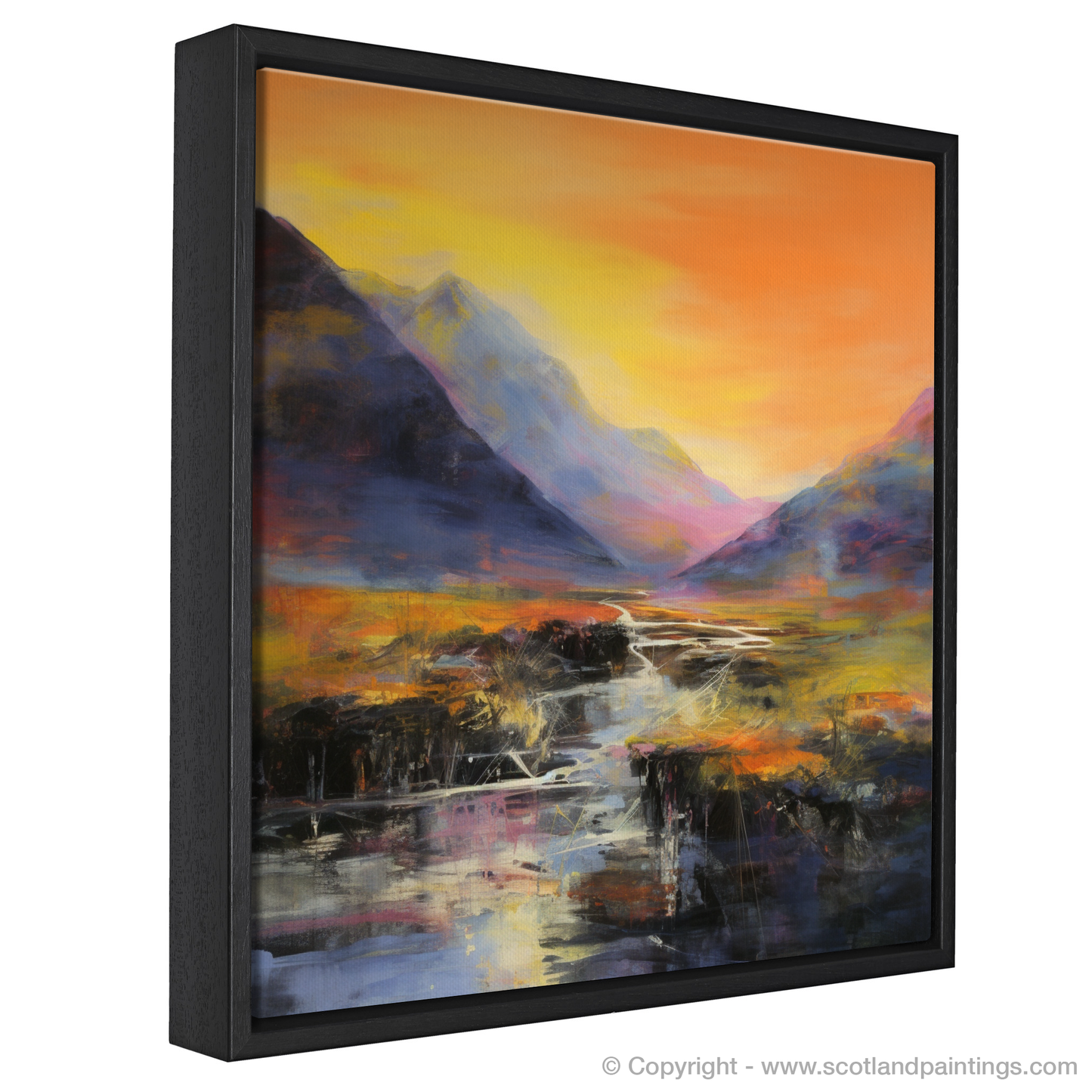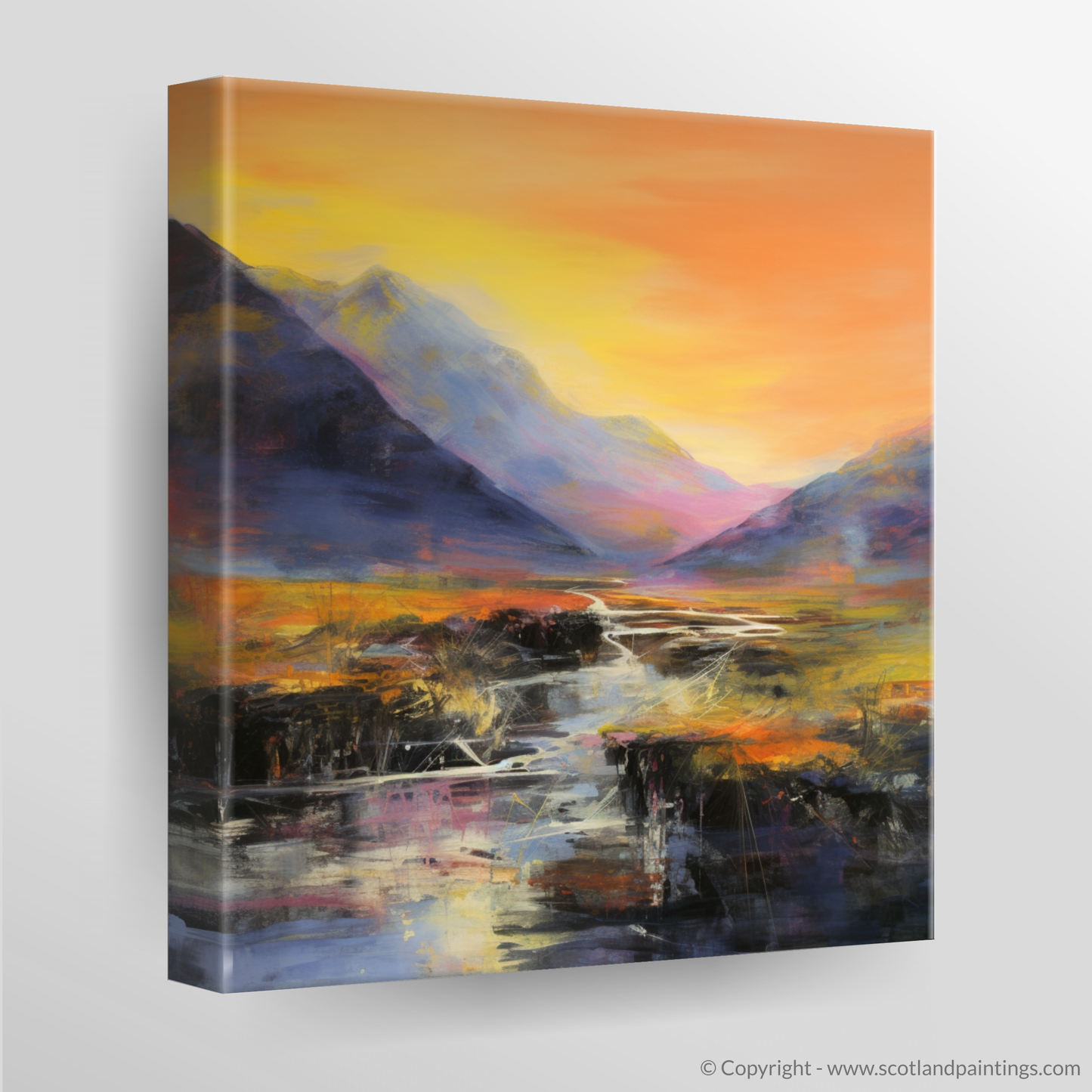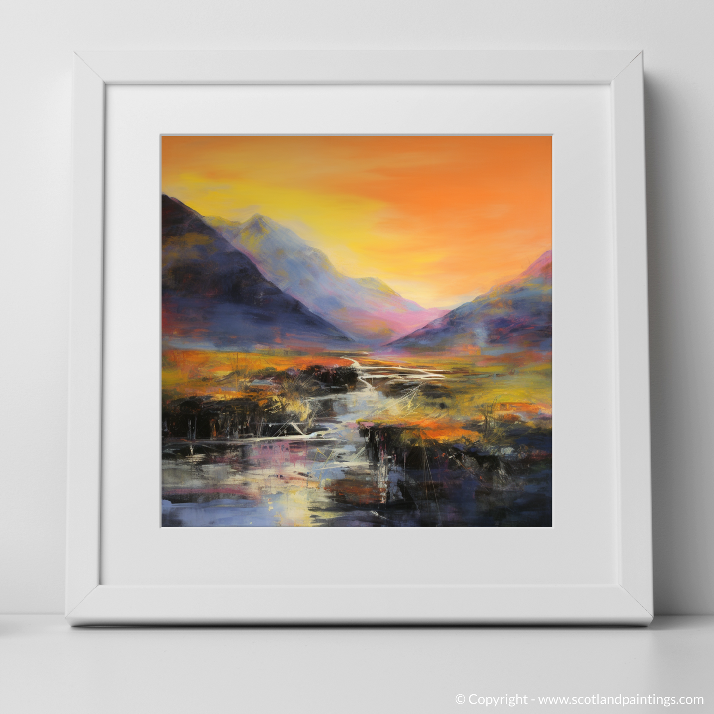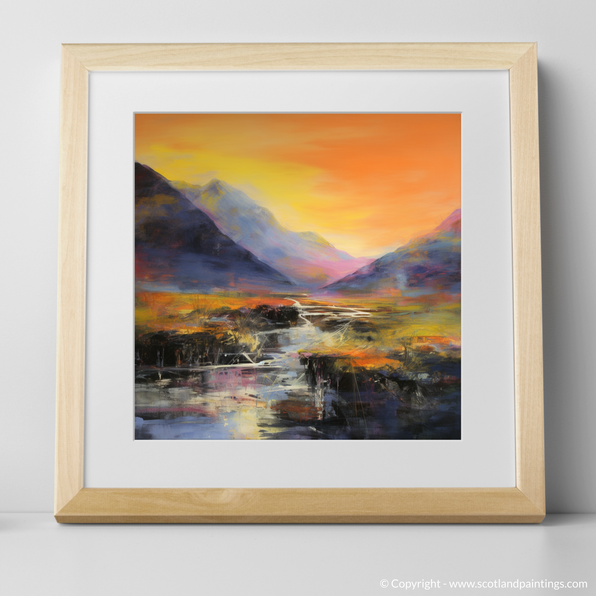 This captivating print is a striking interpretation of the natural grandeur found at River Coe, set against the dramatic backdrop of Glencoe. With bold, emotive strokes, the artwork evokes the sheer power of the landscape, while the abstract expressionist style conveys both the tumult and tranquility of this storied location.