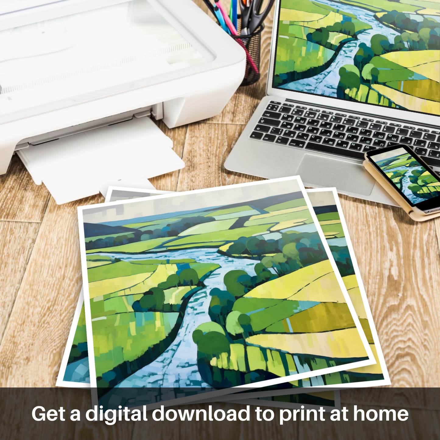 The print presents an interplay of bold, fluid blues that represent the meandering river, slicing through the landscape with organic ease. These blues are juxtaposed with an array of lush greens and vivid yellows, masterfully capturing the sun-kissed fields and the gentle roll of the hills that characterise this picturesque region.
