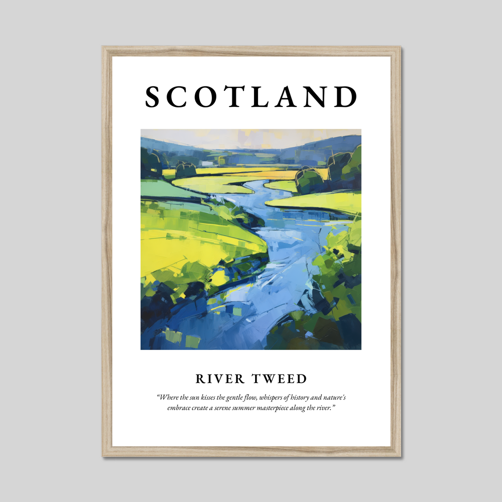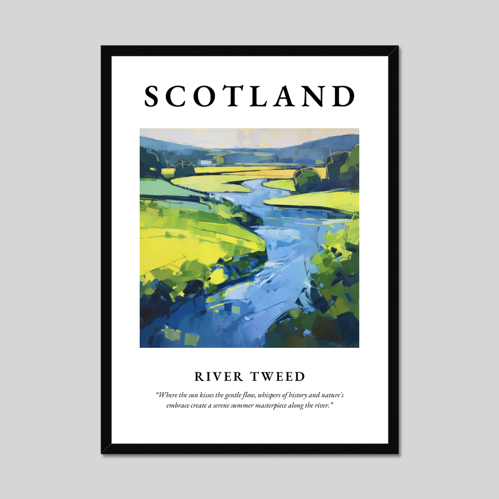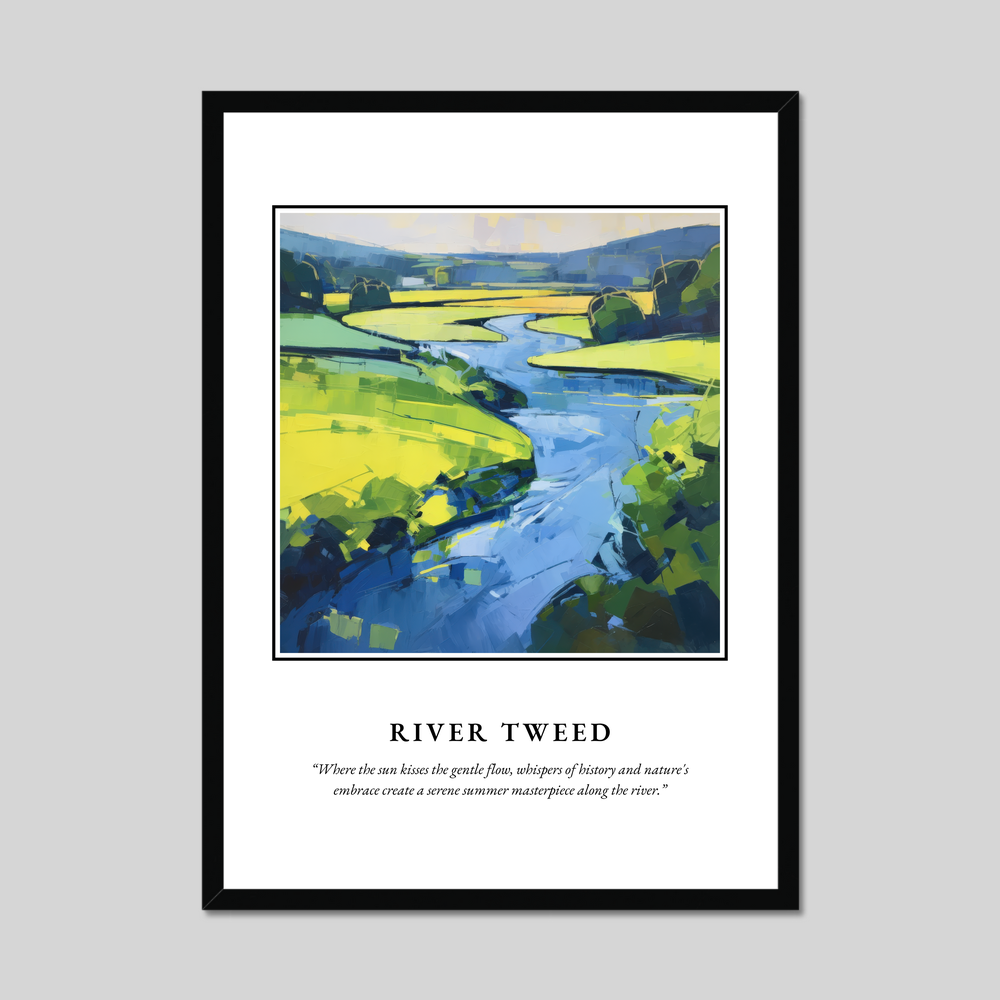 The River Tweed itself is a rich tapestry of history and nature. Renowned for its role in Scotland's cultural heritage, it meanders gracefully through an area known for its stunning vistas and rich biodiversity. Artists and poets alike have been drawn to this river, inspired by its gentle curves and the stories whispered by its banks. The abstract artwork in our poster captures this essence, interpreting the soul of the Tweed and transforming it into a visual symphony.