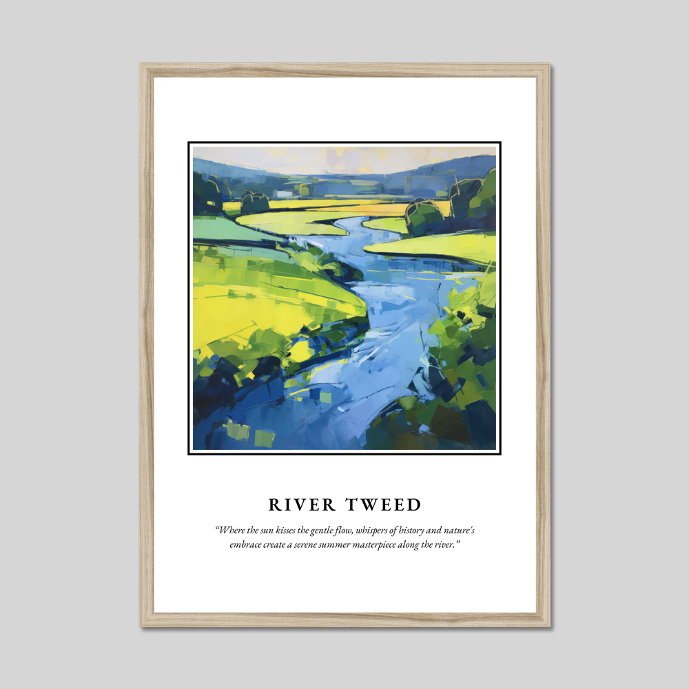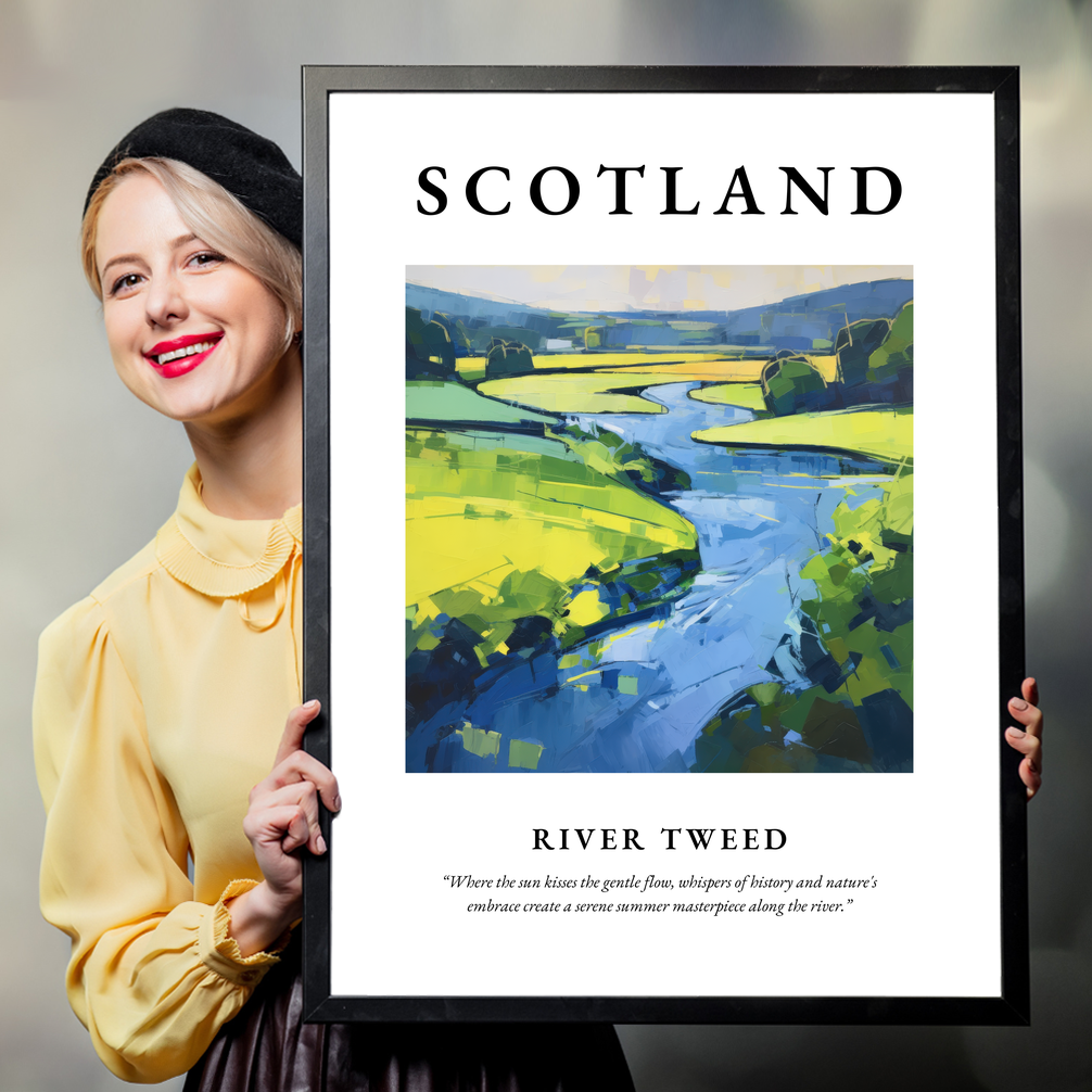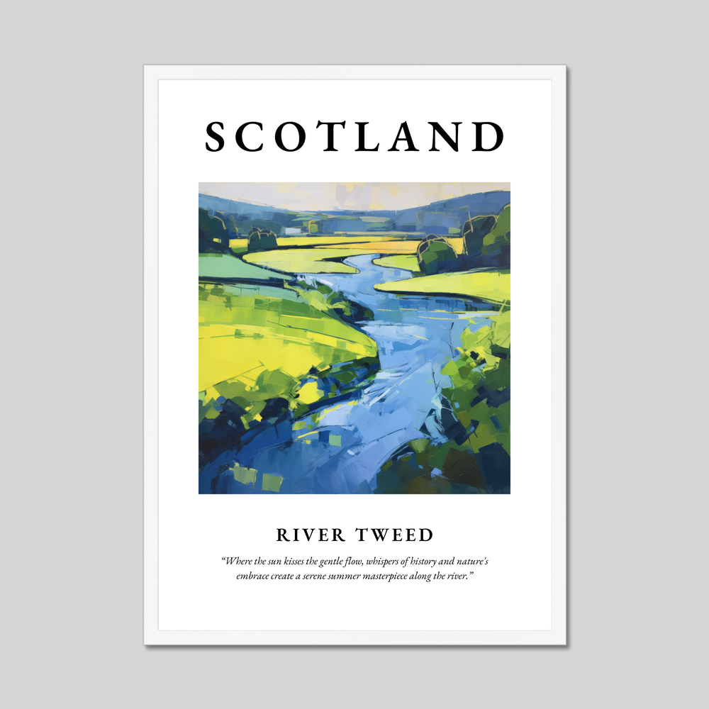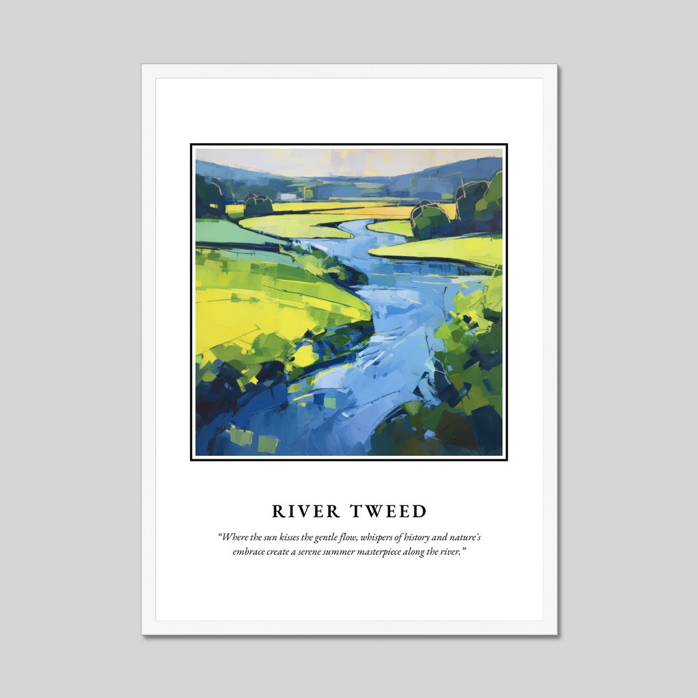 At the top, the striking word "SCOTLAND" commands attention, setting the stage for the captivating abstract painting below. The artwork breathes life into the River Tweed, using vibrant bursts of greens and blues to interpret the serene beauty and dynamic flow of the river. Beneath the painting, the evocative quote, “Where the sun kisses the gentle flow, whispers of history and nature's embrace create a serene summer masterpiece along the river,” perfectly encapsulates the tranquil yet powerful relationship between the land and water.