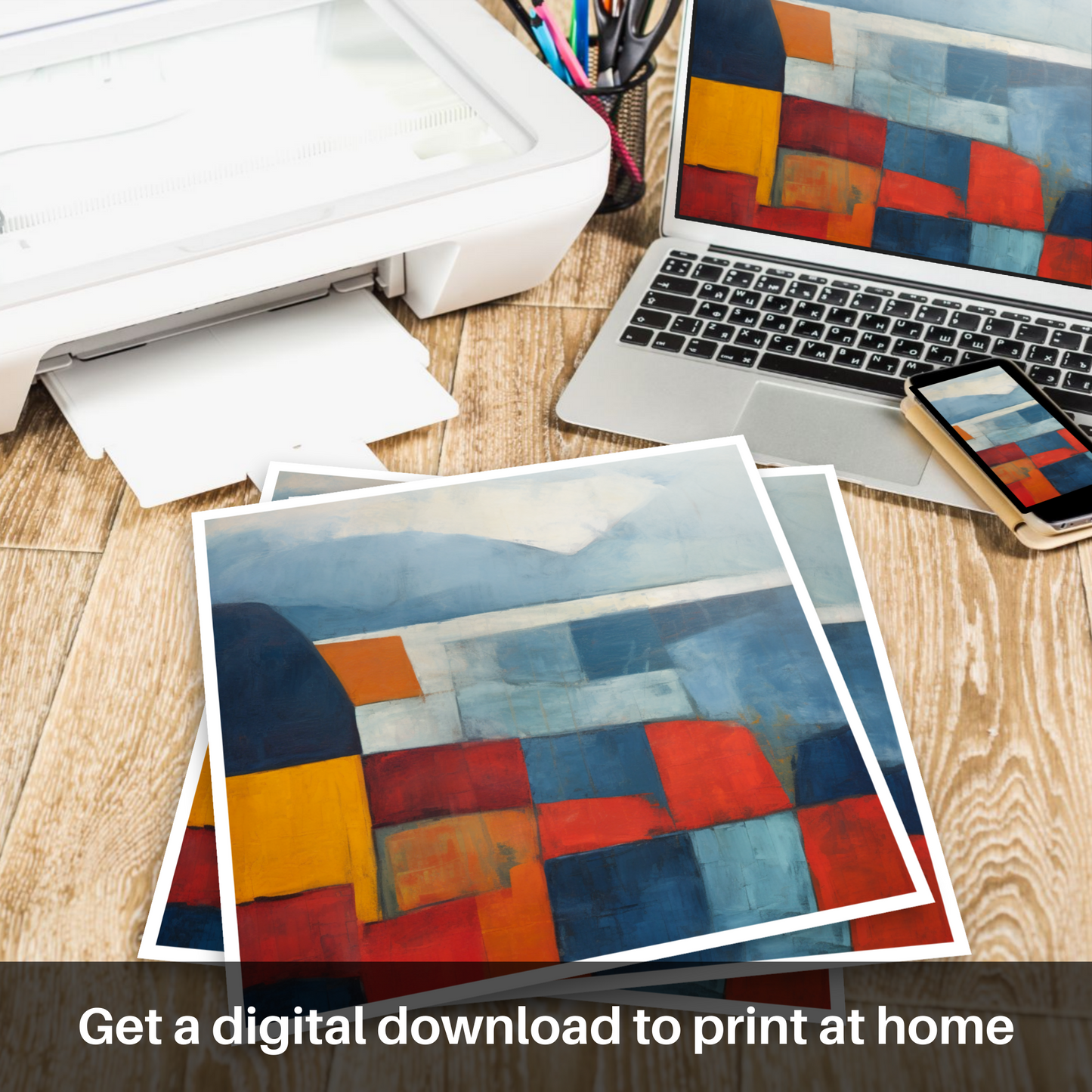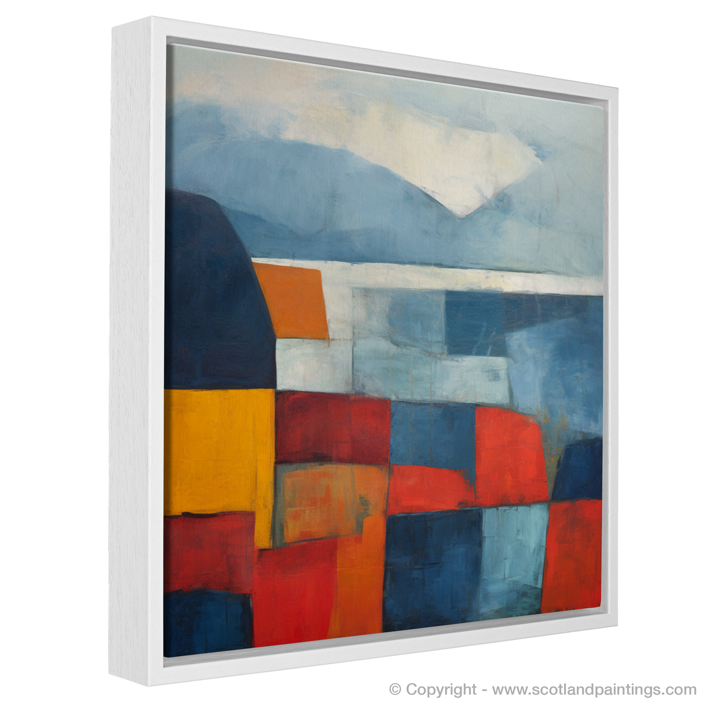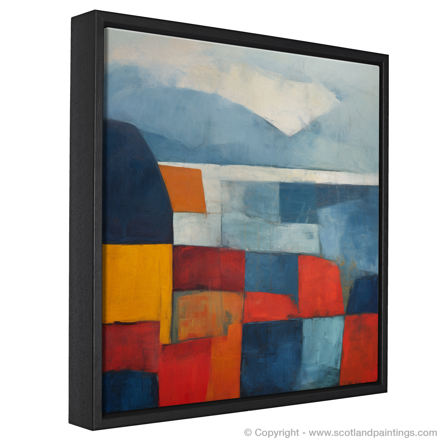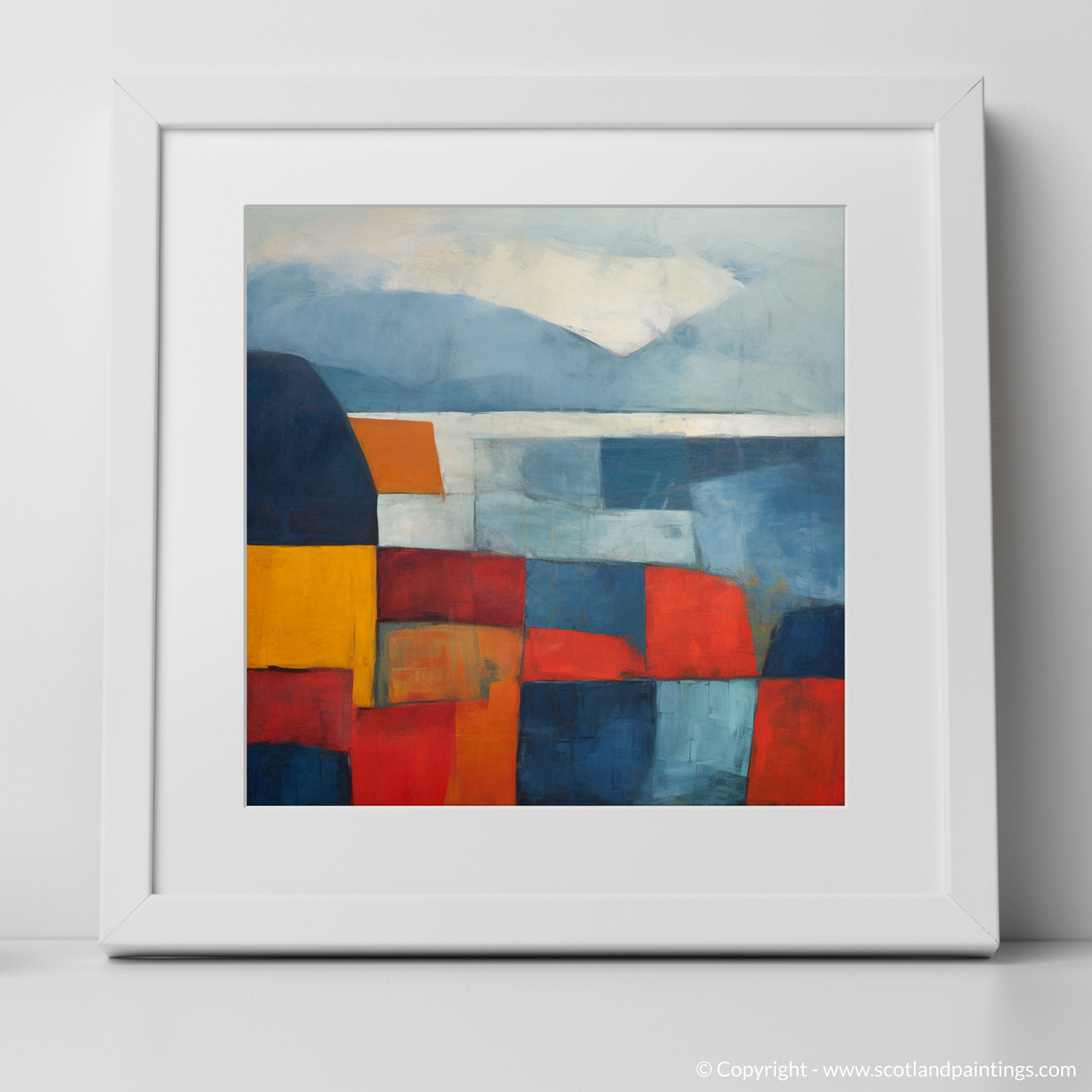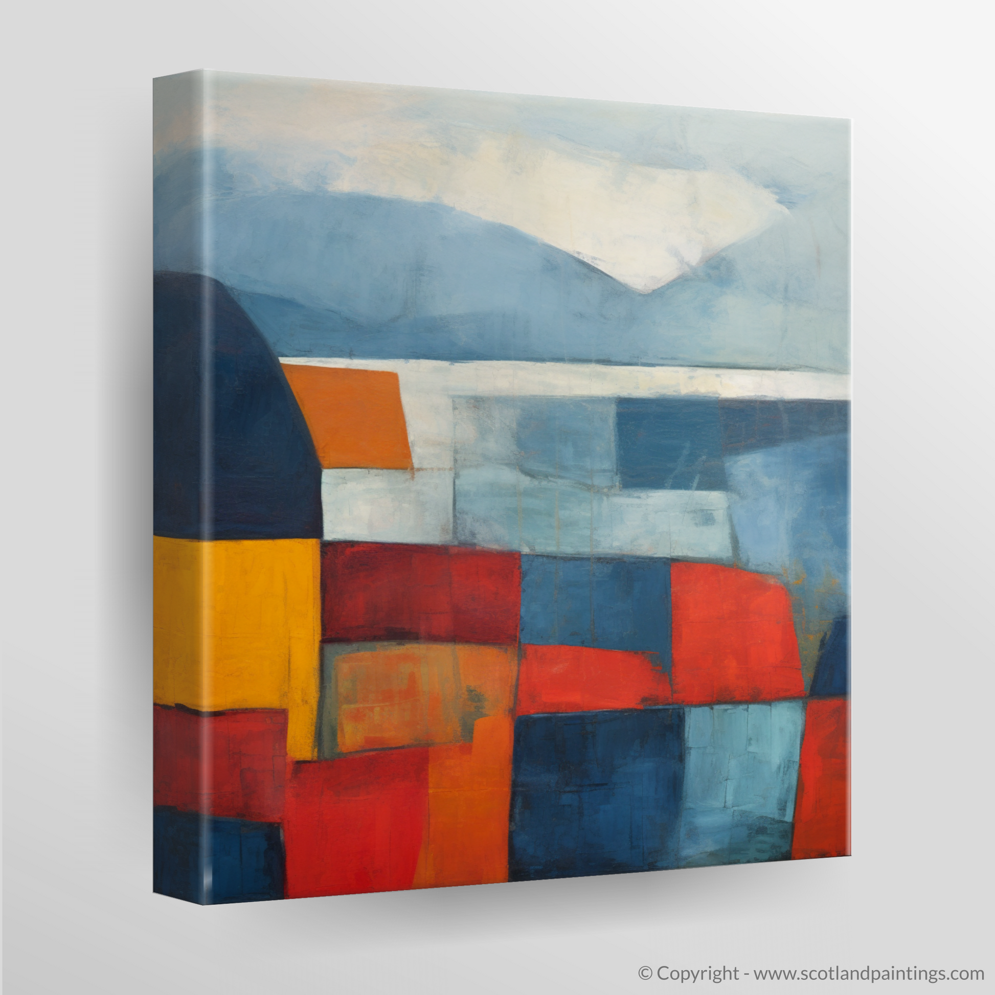 The lower segment of the artwork presents an abstract mosaic of geometric shapes, their bold colours and stark lines offering a stark contrast to the ethereal softness above. Rich reds and deep blues interlock with burnt oranges and midnight shades, mirroring the complex interplay of light and shadow that dances across the loch's surface. The varying tones and textures seem to embody the reflections of the Scottish sun as it dips below the horizon, casting a warm glow over the cool waters.