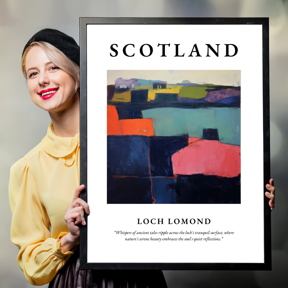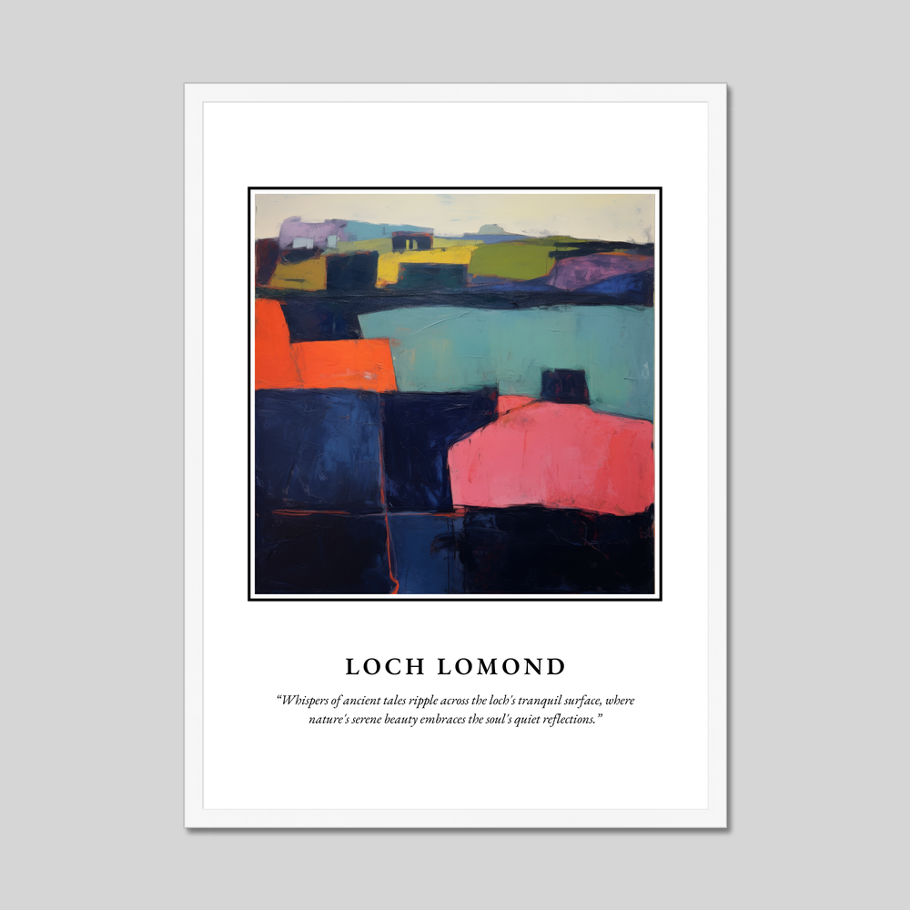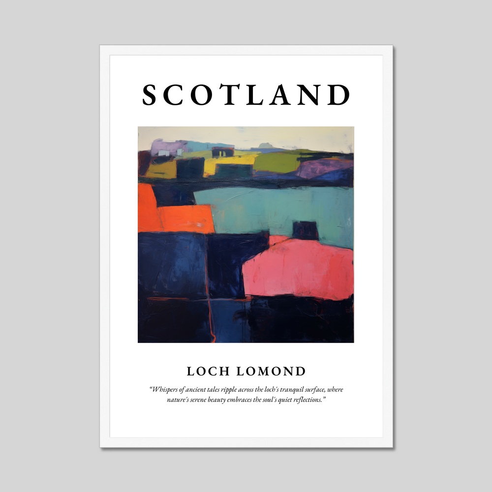 The abstract painting of Loch Lomond in the centre of the poster is a masterpiece of striking contrasts and vivid colours. Through an imaginative interplay of shapes and shades, this artwork captures the essence of the loch's serene yet powerful presence. Beneath the painting, the poetic quote “Whispers of ancient tales ripple across the loch's tranquil surface, where nature's serene beauty embraces the soul's quiet reflections,” perfectly complements the imagery, inviting viewers into a deeper contemplation of the natural world.