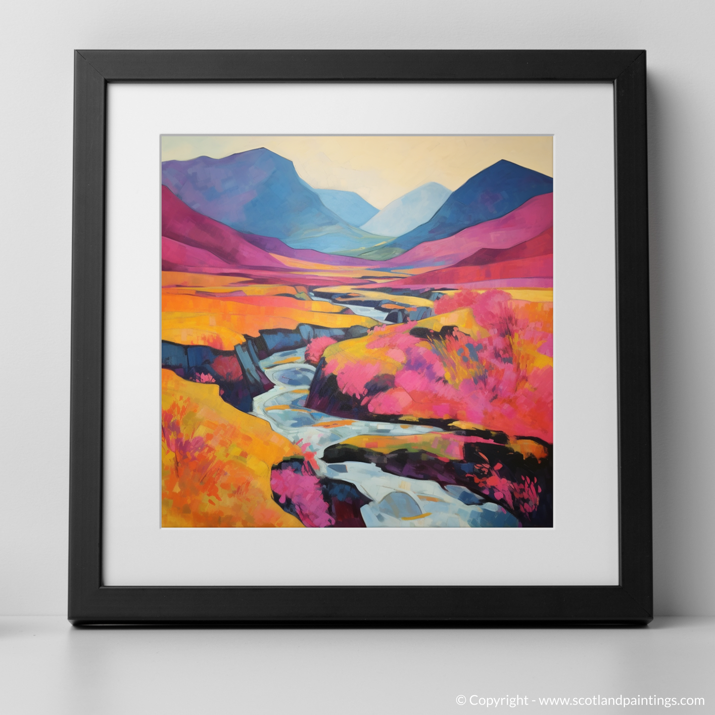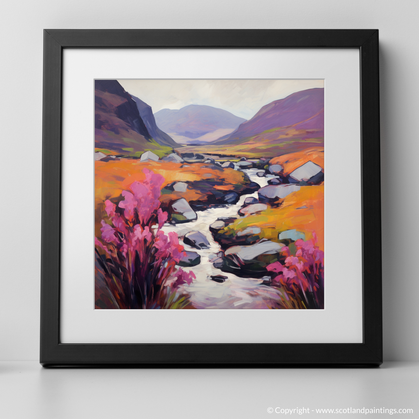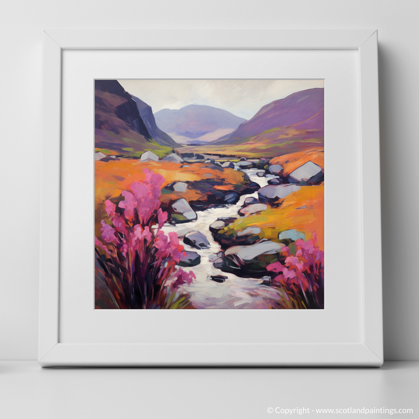 Heather blooms by the River Coe in Glencoe capture the rugged beauty and serene tranquillity of this renowned Scottish landmark. Known for its picturesque valleys surrounded by imposing mountains, Glencoe offers a tapestry of vibrant colours—particularly striking during blooming season. The vivid heather that carpets the landscape is beautifully reflected in the artwork, embodying the breathtaking hues that characterise this special place.