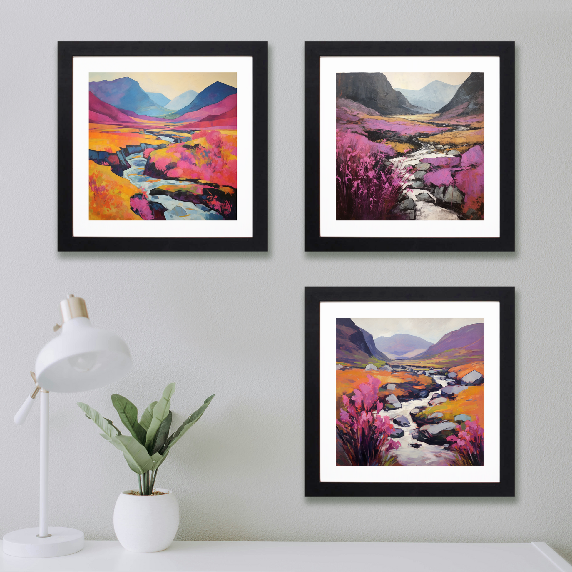 Introducing the exquisite Glencoe Collection from ScotlandPaintings.com—a captivating set of three framed prints showcasing the enchanting Heather blooms by the River Coe in Glencoe. Each print promises to transport you to the serene and majestic landscapes of Scotland, where vibrant heather overlays the natural beauty of the valleys and streams. This framed set, with its harmonious fusion of rich purples, gentle pinks, and earthy tones, captures the essence of Glencoe’s breathtaking scenery.