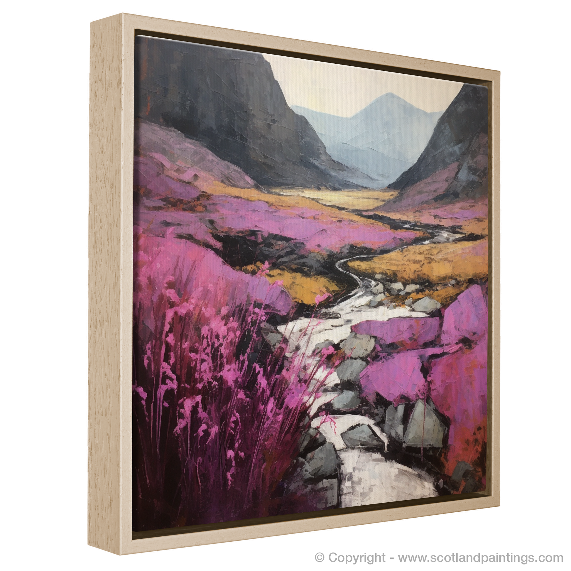 This captivating print captures the essence of the heather blooms along the River Coe, set within the majestic landscape of Glencoe. It is an abstract interpretation that sees nature through a prism of vibrant hues and bold textural strokes. A meandering river cuts through the valley, its reflective waters offering a serene path that guides the viewer's eye towards the distant mountains shrouded in mist.