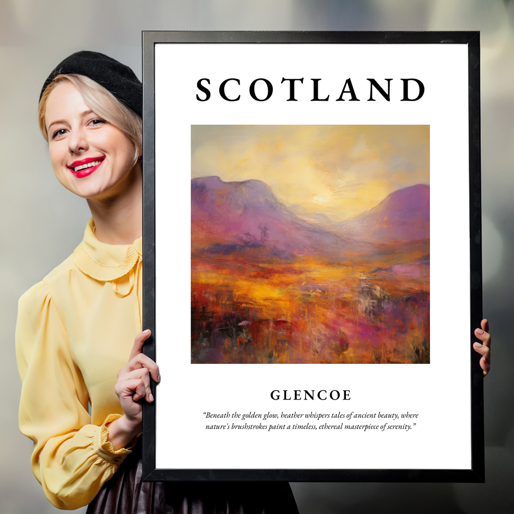 At the top, the bold lettering of “SCOTLAND” sets the stage for a visual journey into the heart of this majestic landscape. The abstract painting of Glencoe is a captivating blend of vibrant purples and golden hues, capturing the mystic allure and rugged elegance of one of Scotland's most iconic valleys. Below the painting, the evocative quote, “Beneath the golden glow, heather whispers tales of ancient beauty, where nature's brushstrokes paint a timeless, ethereal masterpiece of serenity,” invites the viewer into a deeper connection with the scene depicted.