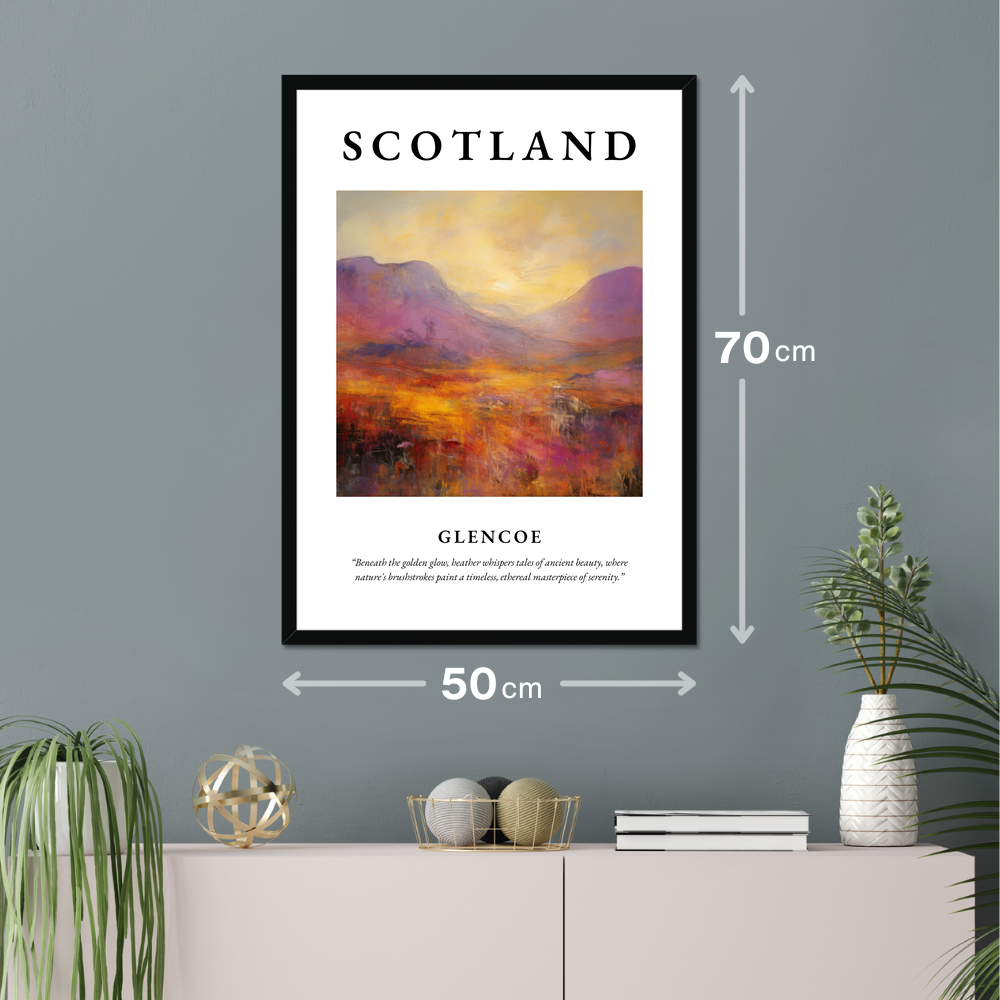 Elevate your living space with our exquisite framed poster print, measuring a generous 50cm x 70cm. Featuring the breathtaking beauty of Glencoe, this piece captures the essence of Scotland in the striking style of Abstract Expressionism. Choose from a sleek black, pristine white, or a natural wood-effect frame to perfectly complement your home decor.