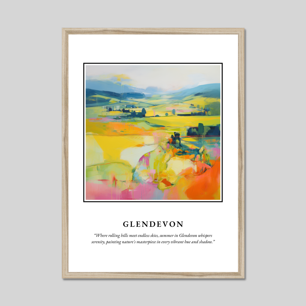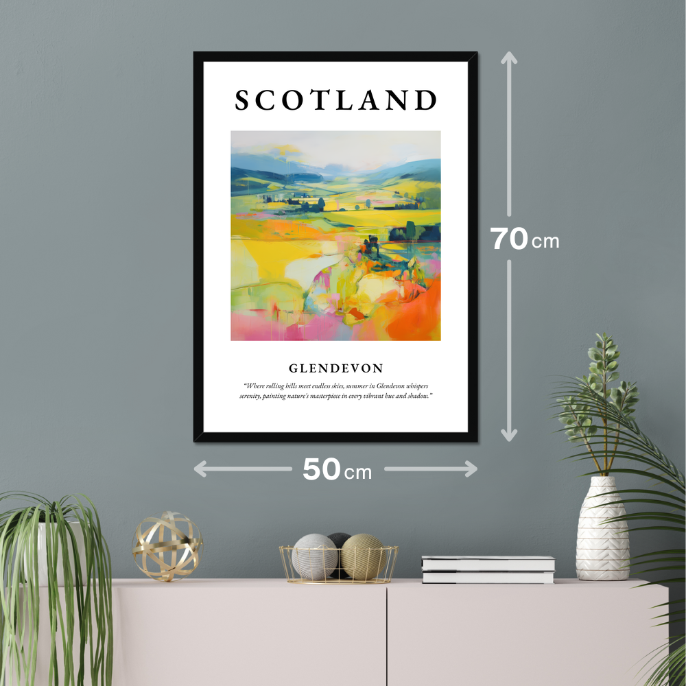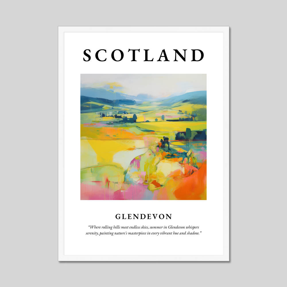 The poster features a rich tapestry of Abstract Expressionism, where vibrant hues and dynamic brushstrokes bring the rolling hills of Glendevon to life. Each splash of colour whispers of sunny Scottish summers, making it perfect for art enthusiasts and those with a deep connection to this enchanting locale. The eloquent words beneath the painting, "Where rolling hills meet endless skies, summer in Glendevon whispers serenity, painting nature's masterpiece in every vibrant hue and shadow," echo the idyllic nature of this captivating scene.