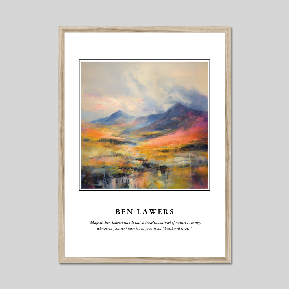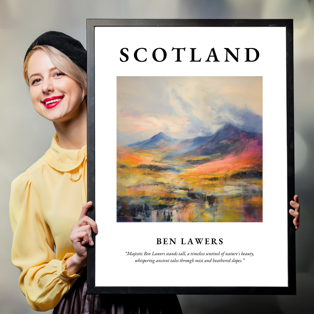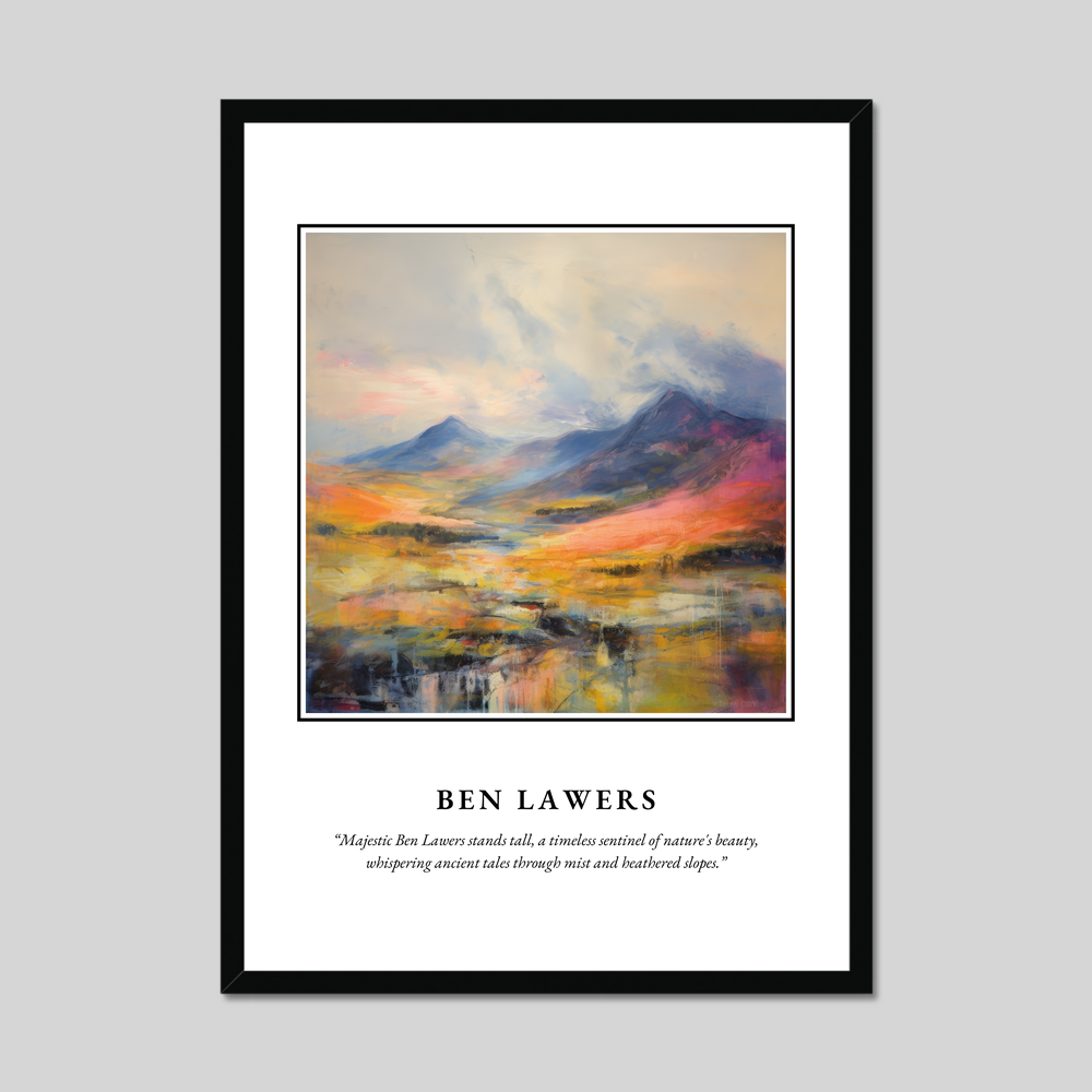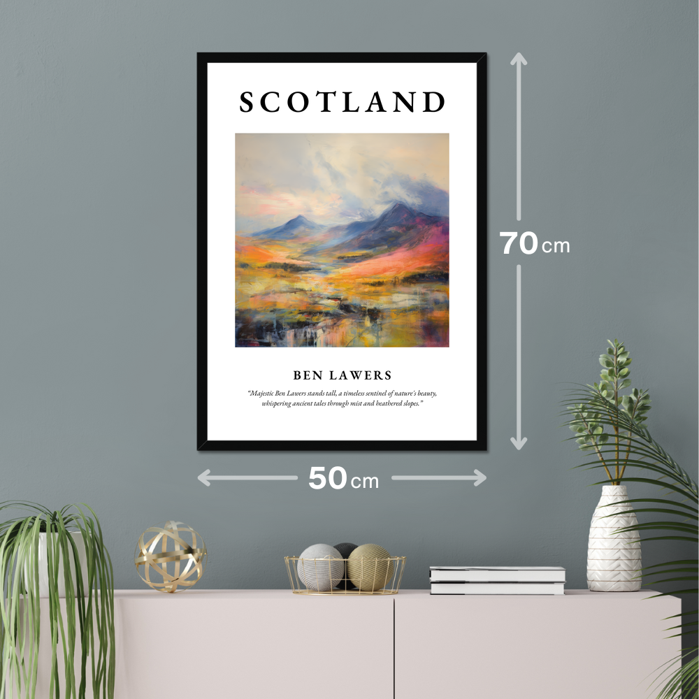 Elevate your space with a striking piece from our "Scottish Mountains" collection, featuring the iconic Ben Lawers. This framed poster print measures an impressive 50cm x 70cm, making it a captivating centrepiece for any room in your home. Choose from a sleek black, classic white, or natural wood-effect frame to perfectly complement your décor.