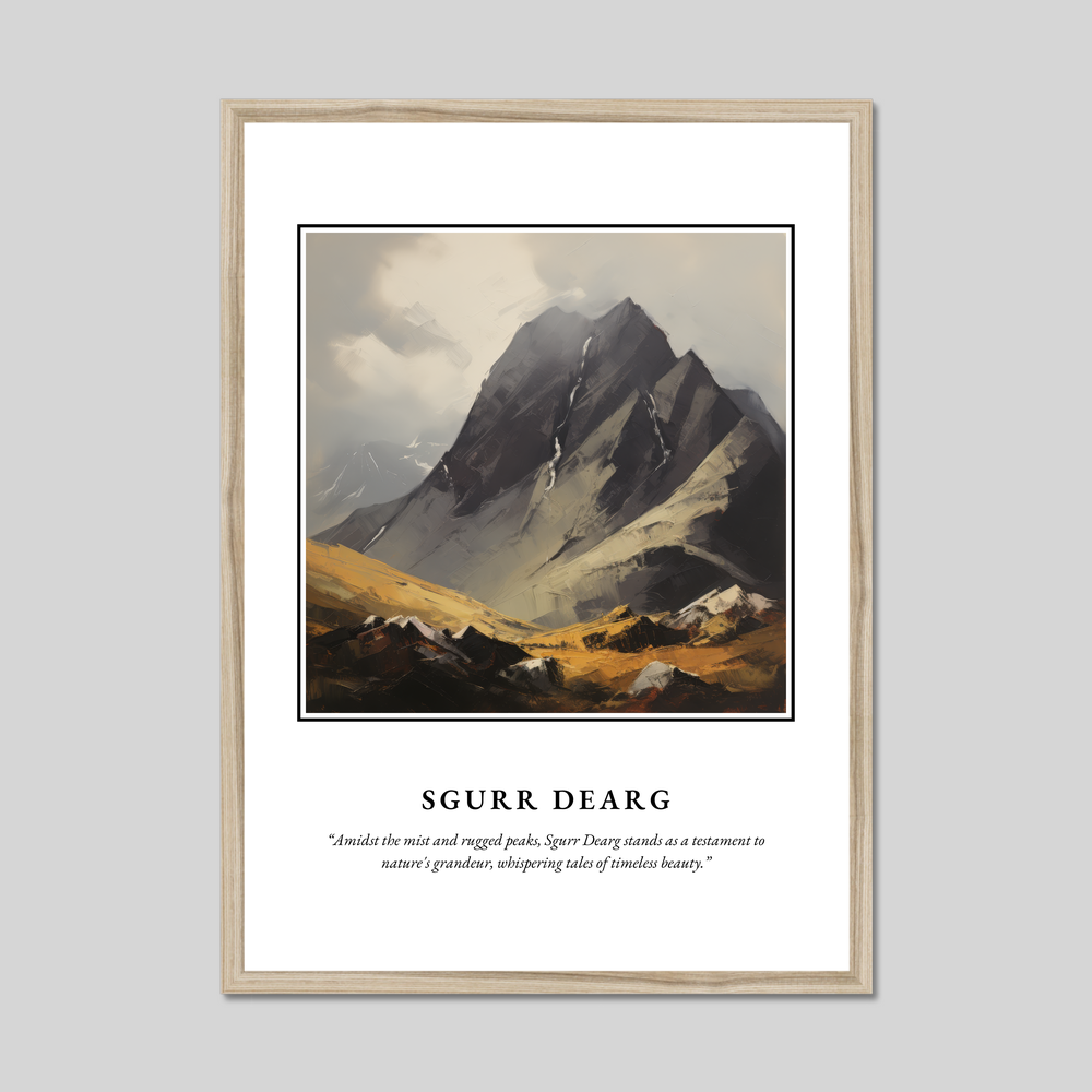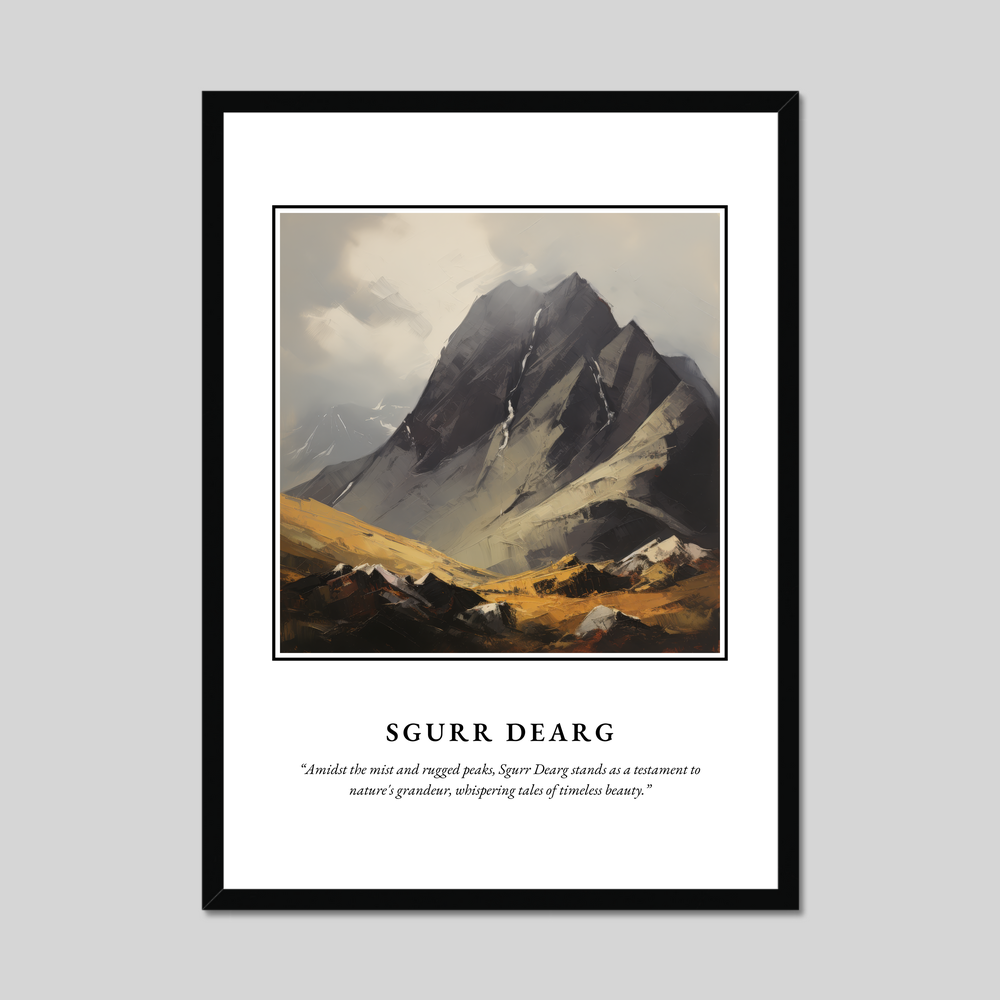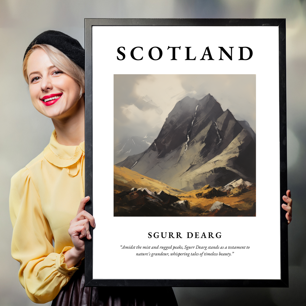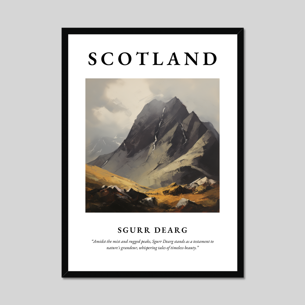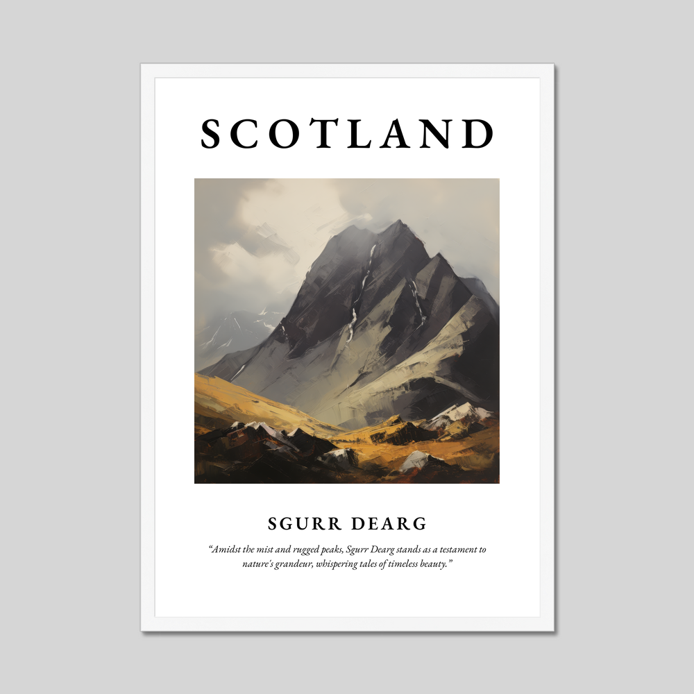 The poster features the bold inscription “SCOTLAND” at the top, immediately drawing the eye to the breathtaking expressionist depiction of Sgurr Dearg. This painting captures the essence of the mountain’s rugged and misty grandeur, with bold brushstrokes and a dramatic interplay of shadows and light that beautifully convey the mountain’s formidable yet enchanting presence. Beneath the image, the evocative quote, “Amidst the mist and rugged peaks, Sgurr Dearg stands as a testament to nature's grandeur, whispering tales of timeless beauty,” further immerses you in the scene’s mystique.
