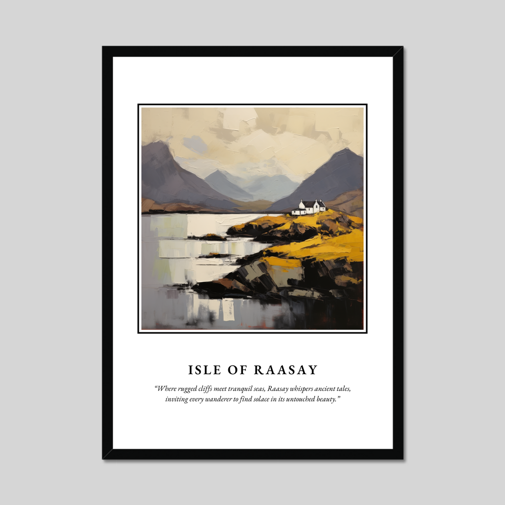 Raasay, a gem nestled between the Isle of Skye and the Scottish mainland, is a tranquil retreat brimming with natural beauty and rich history. Known for its jagged peaks and lush, verdant valleys, the island offers a perfect escape for nature lovers and wanderers alike. The painting’s depiction of this landscape captures the island’s essence, hinting at the rich stories and tranquil peace that travellers often seek. Whether reminiscing about past visits or dreaming of future adventures, this framed poster invites a piece of Scotland's soul into your living space.