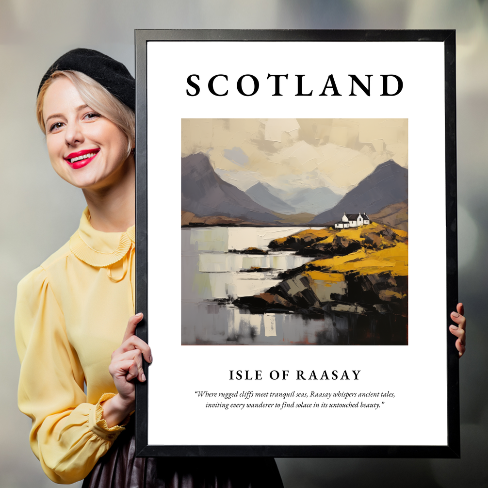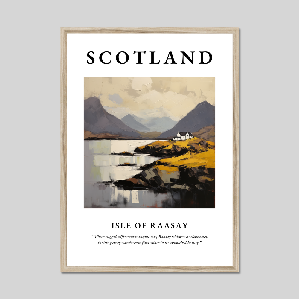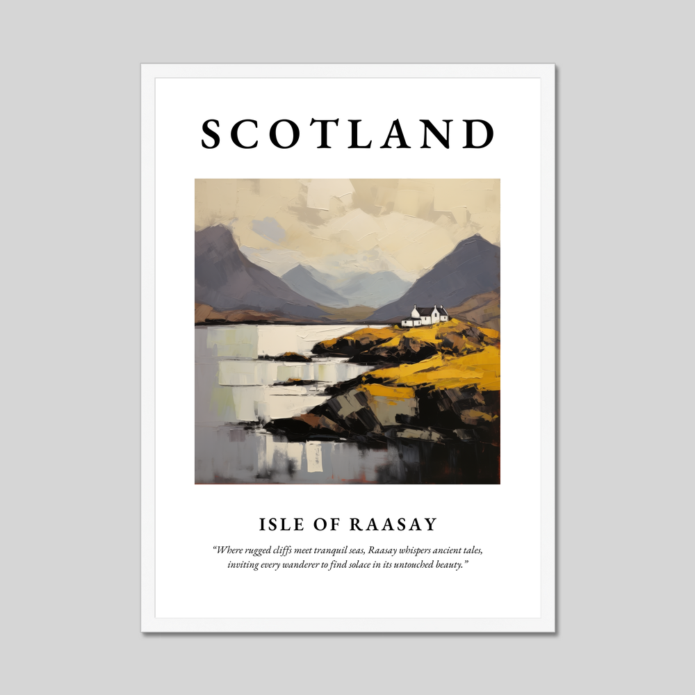 The poster proudly displays the word "SCOTLAND" at the top in bold lettering, drawing your eyes to the captivating painting below. In the expressive strokes of the Expressionism style, the landscape unfolds with vivid emotion, depicting rugged cliffs that embrace the tranquil sea, interspersed with the iconic image of white cottages standing resolutely against the dramatic backdrop of towering mountains. Beneath this enchanting scene, the quote “Where rugged cliffs meet tranquil seas, Raasay whispers ancient tales, inviting every wanderer to find solace in its untouched beauty,” prompts reflection and transports viewers to a place where nature's raw beauty is effortlessly captured.