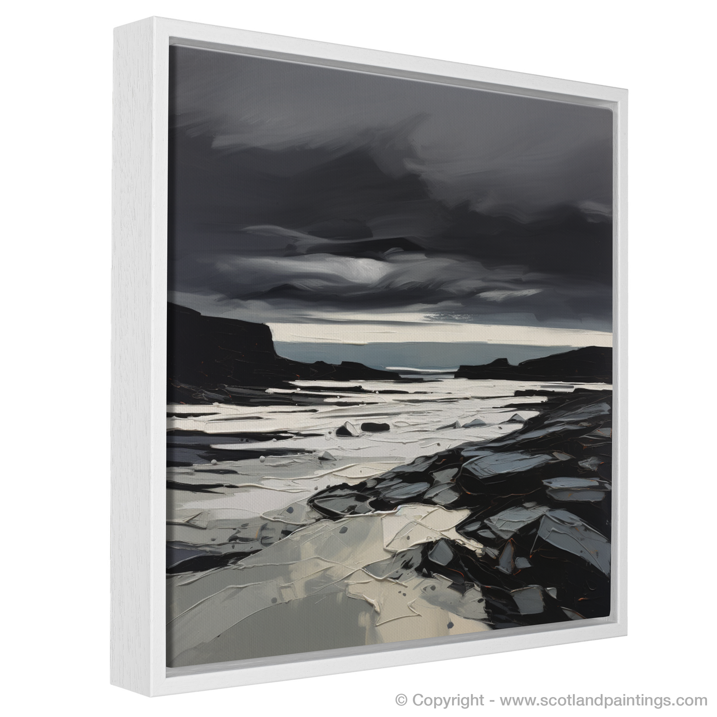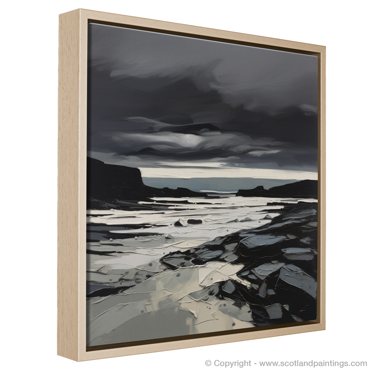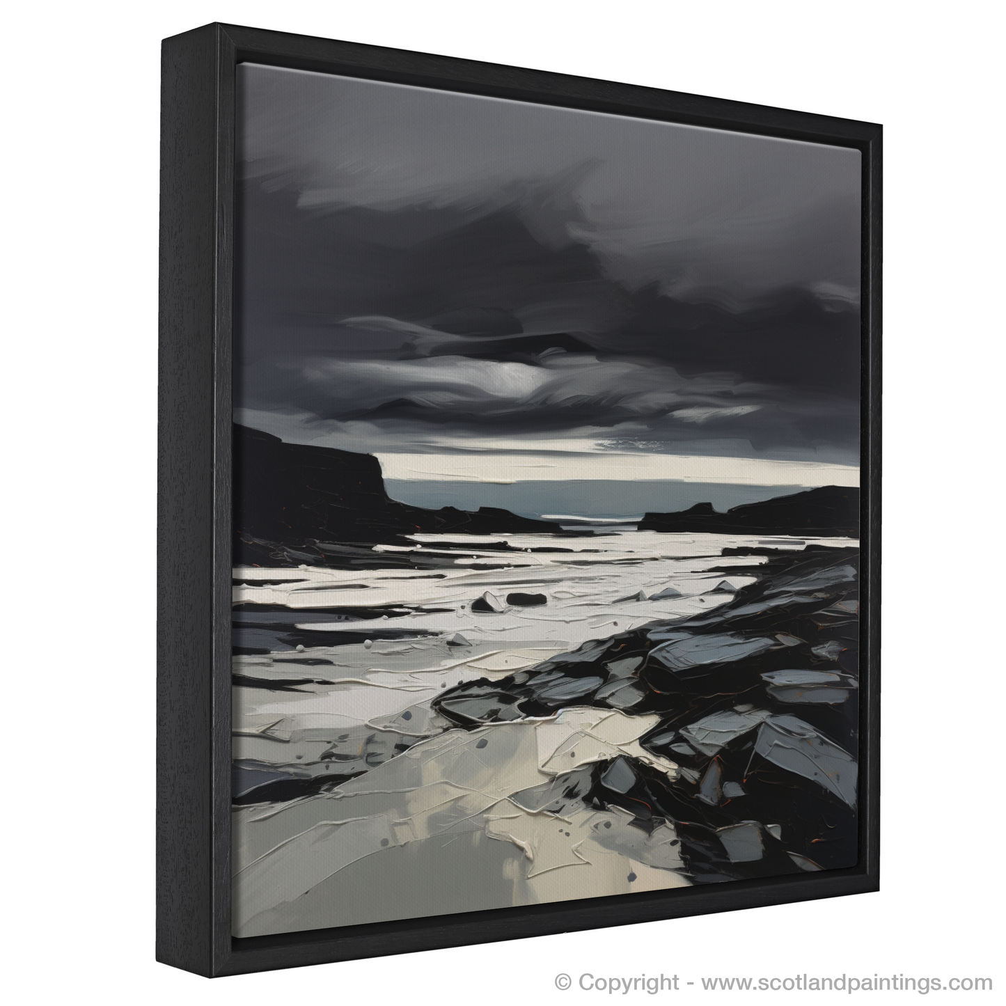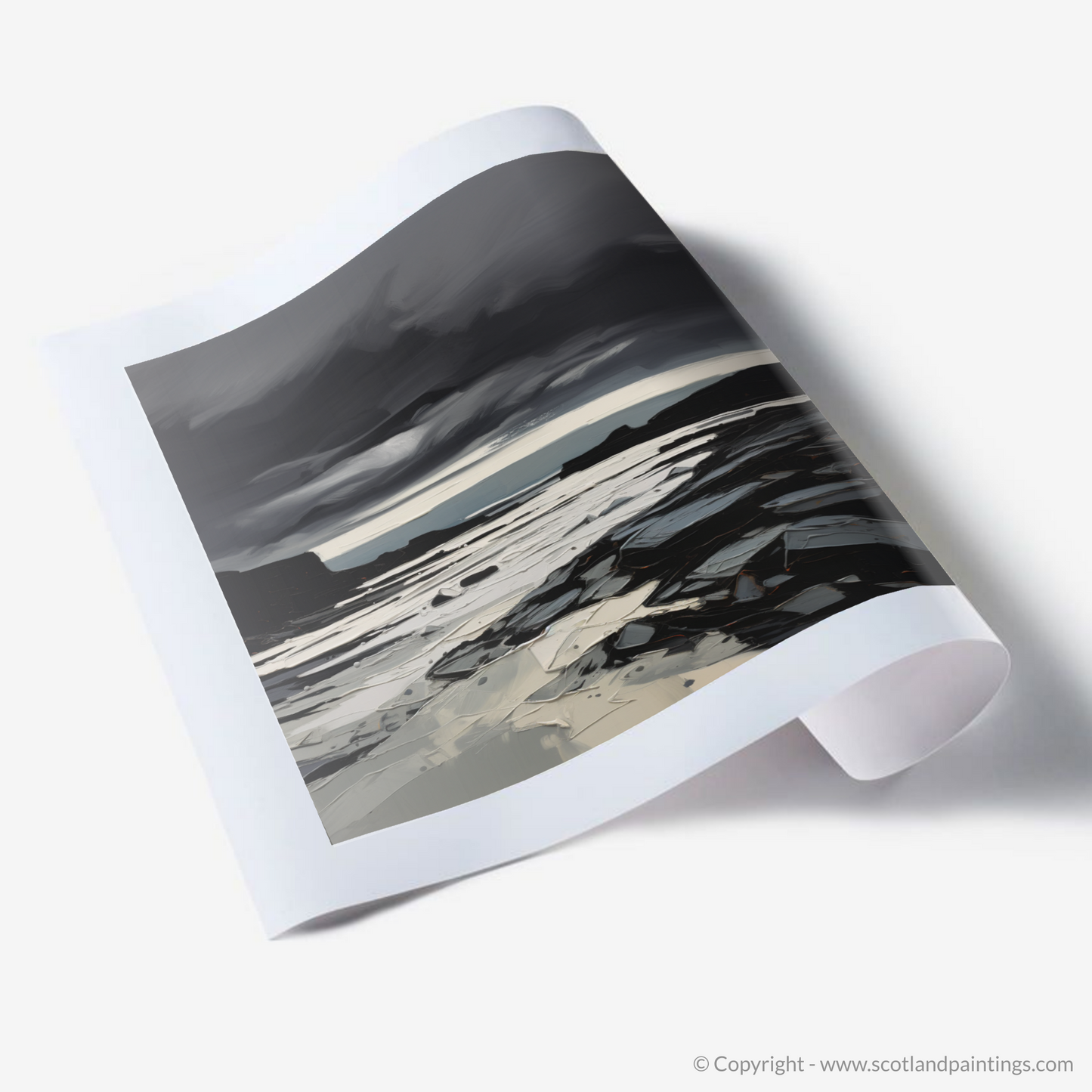 Experience the raw and evocative beauty of the Scottish coast with our expressive print, depicting a dramatic moment at Scarista Beach. Dominated by a brooding, storm-filled sky, thick with tumultuous clouds rendered in shades of charcoal, slate, and onyx, the artwork captures the intense atmosphere of a tempestuous sea-scape.