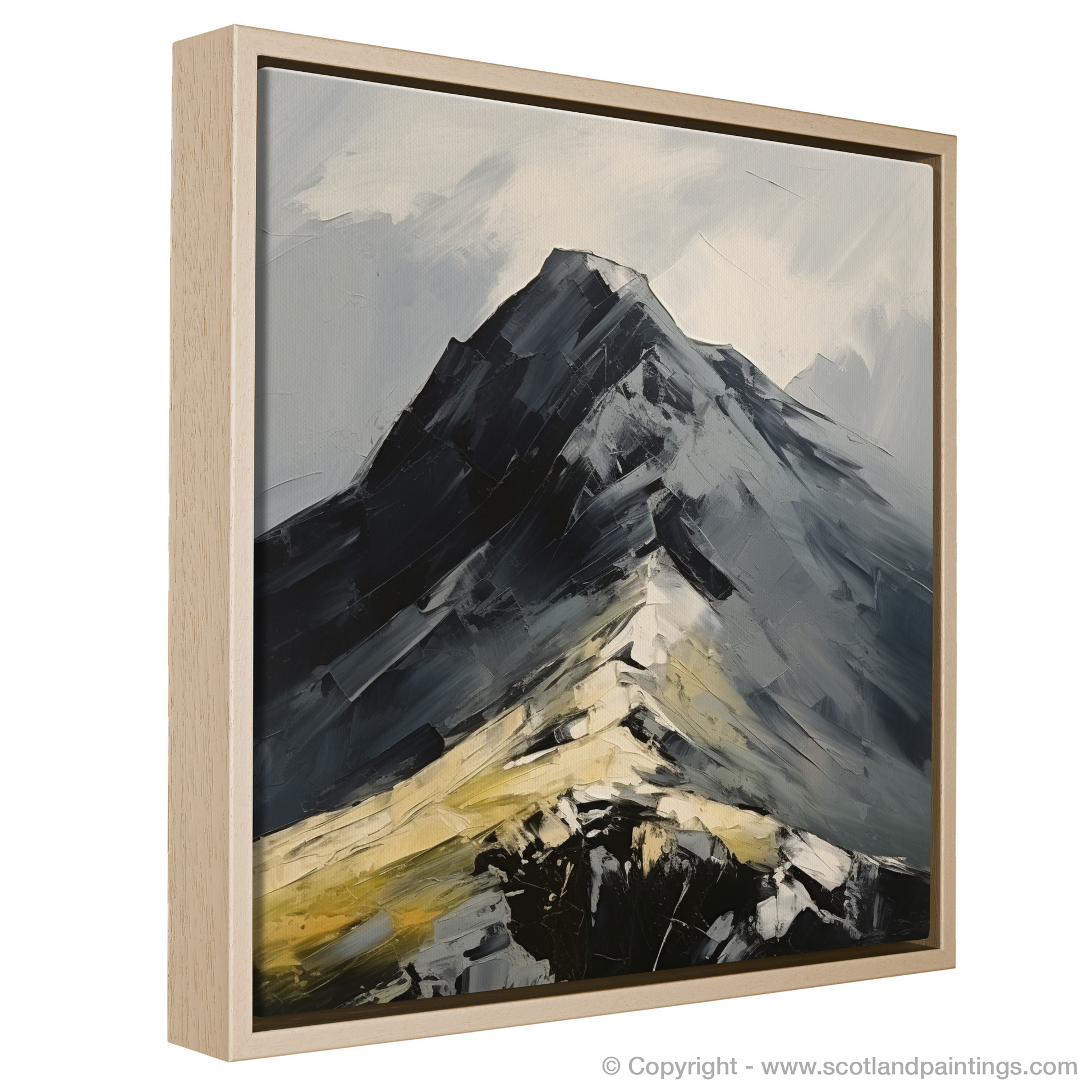 Capturing the rugged essence of Beinn Ìme, this striking print is a testament to the raw beauty of the Scottish Munros. Bold brushstrokes and a dynamic palette evoke the tumultuous spirit of the highlands, with deep, moody hues of slate grey and midnight blue forming the craggy façade of the mountain. Swathes of creamy white and subtle gold suggest lingering snow in hidden crevices, and fleeting sunlight breaking through the brooding Scottish skies.