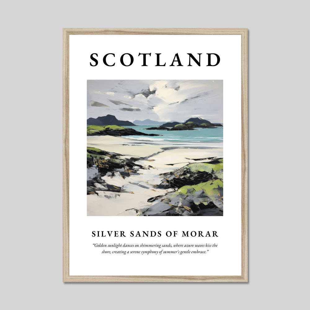 The bold “SCOTLAND” lettering proudly introduces the serene vista below, where the whimsical brushstrokes capture the ethereal quality of the Silver Sands of Morar. Azure waves gently lap at the luminous sands, mirroring the golden sunlight that dances across the scene. This fusion of colours and textures creates a vivid symphony of summer's gentle embrace. Below the artwork, a poetic quote pays homage to nature’s masterpiece, adding depth and meaning to your space.
