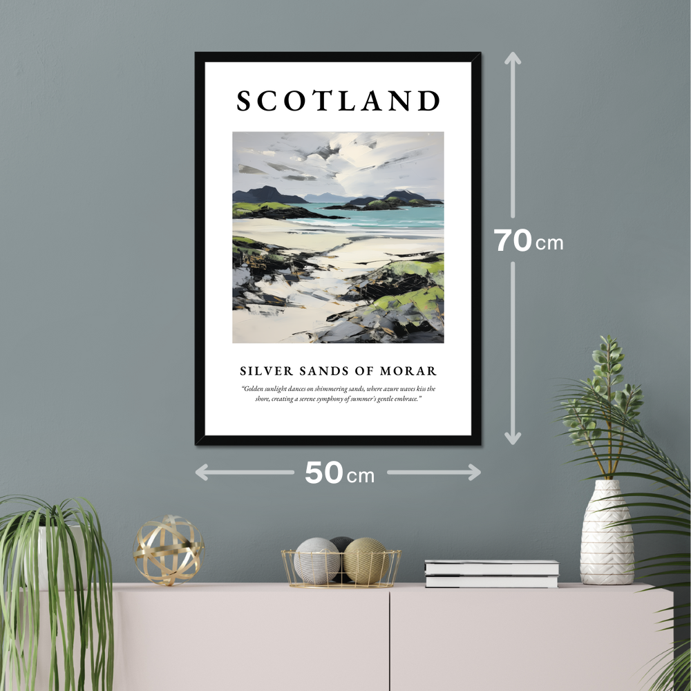 Celebrate the captivating beauty of Scotland’s landscape with our latest framed poster print, an exquisite piece from our “Scotland in Summer” collection. This large 50cm x 70cm poster features a breathtaking expressionist painting of the Silver Sands of Morar, making it the perfect adornment for any wall. Available in a choice of black, white, or natural wood-effect frames, this poster harmoniously complements a wide array of interior styles.