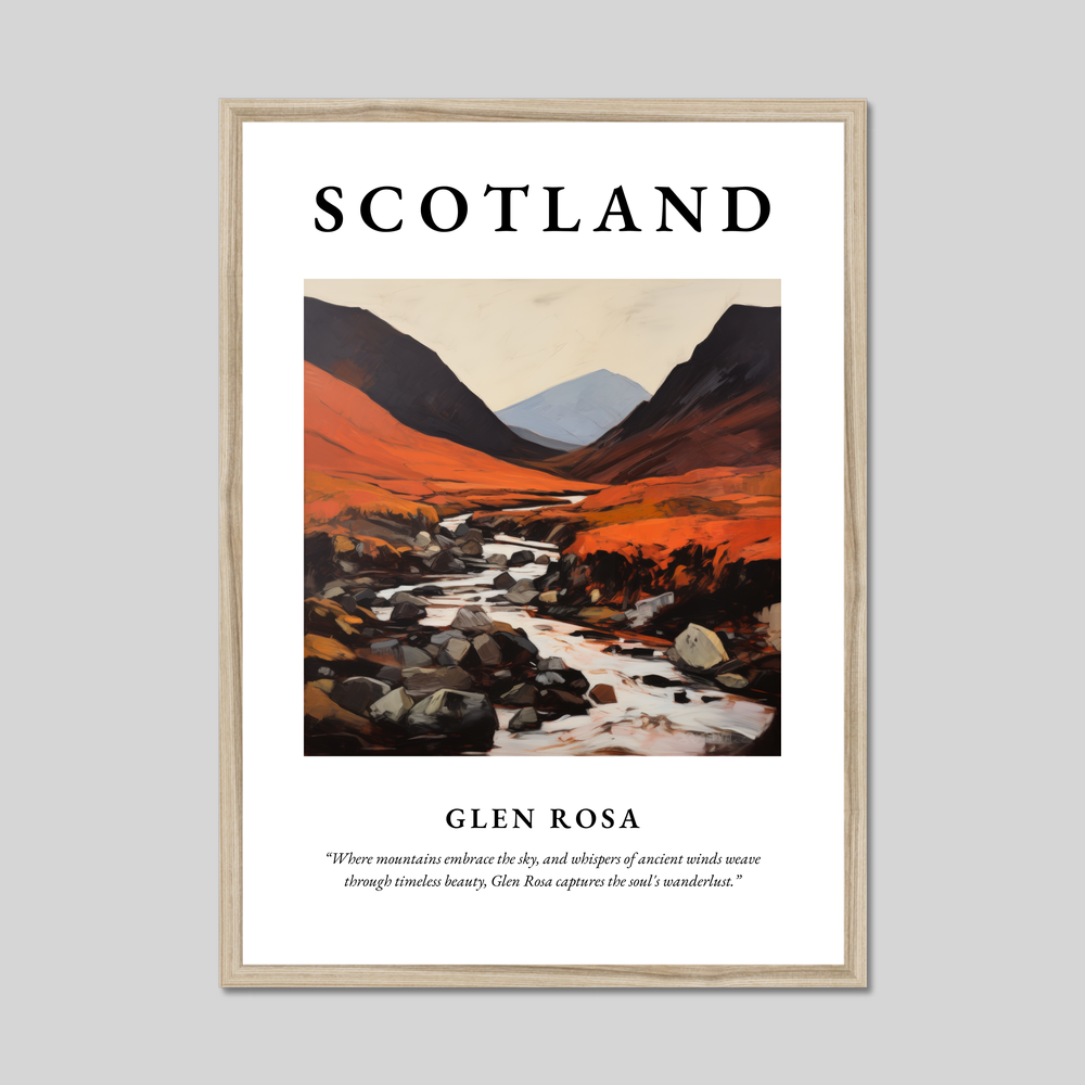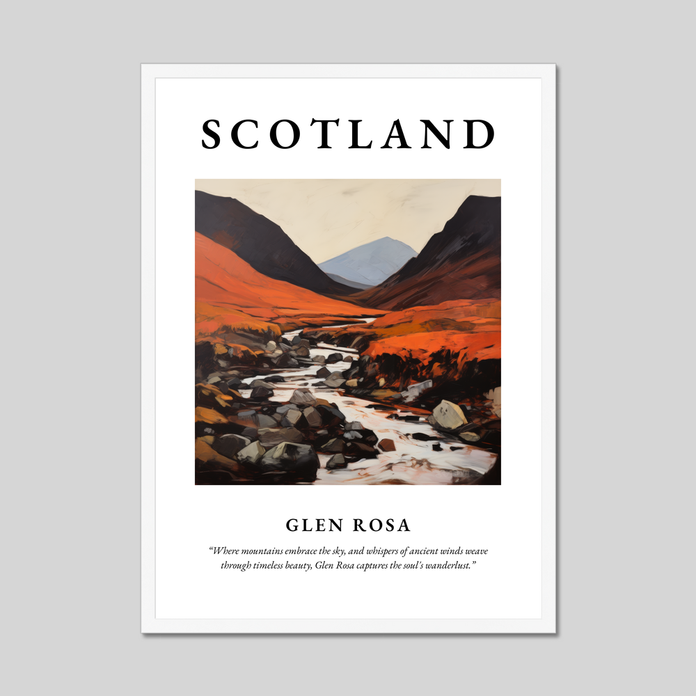 Available in a sleek black, crisp white, or natural wood-effect frame, each option complements the bold, expressive style of the artwork. The word "SCOTLAND" stands proudly at the top, guiding you into the vivid portrayal of Glen Rosa below. In the painting, dynamic brushstrokes and a vibrant colour palette encapsulate the raw beauty and emotion typical of Expressionism, inviting both art lovers and admirers of Scottish landscapes to explore its depths.