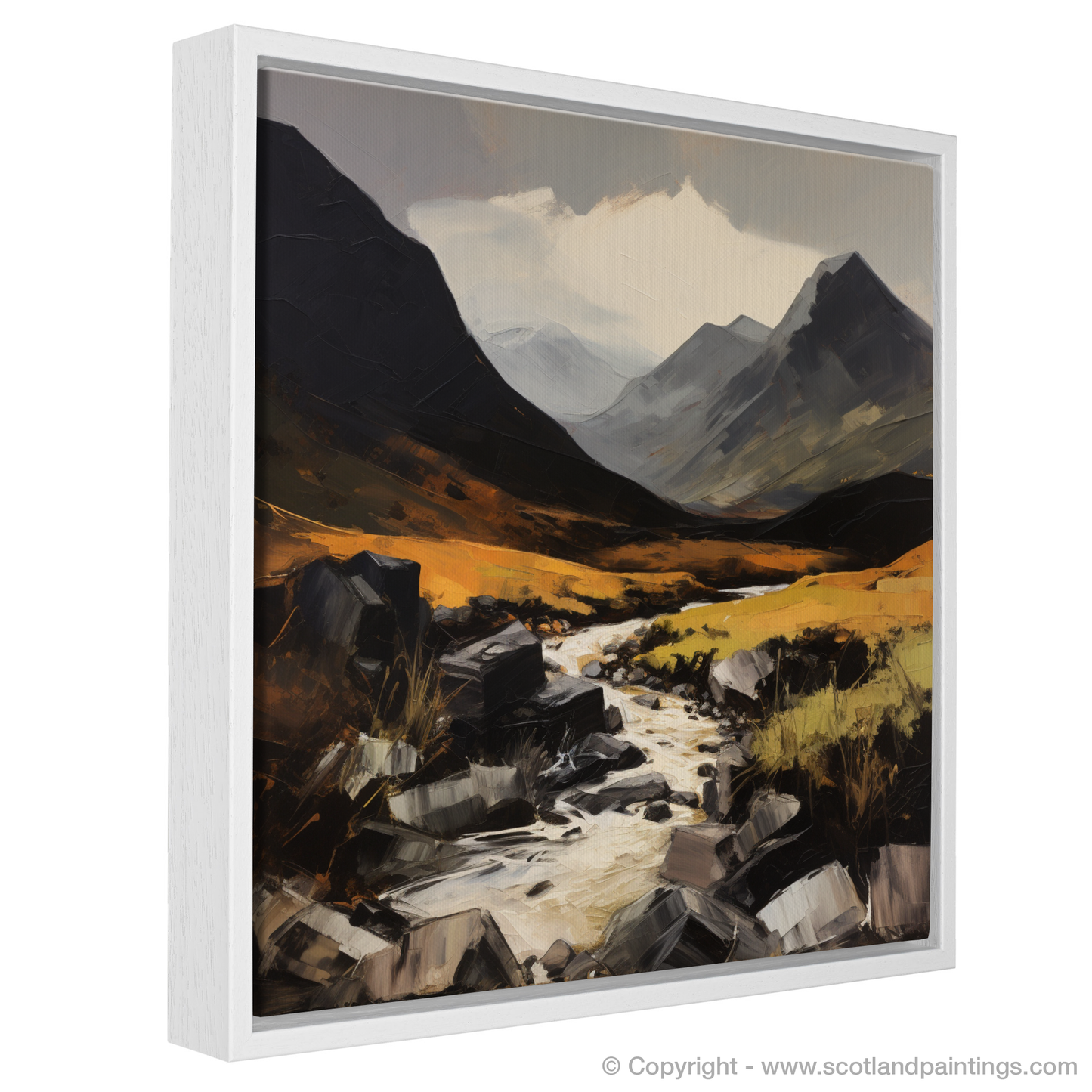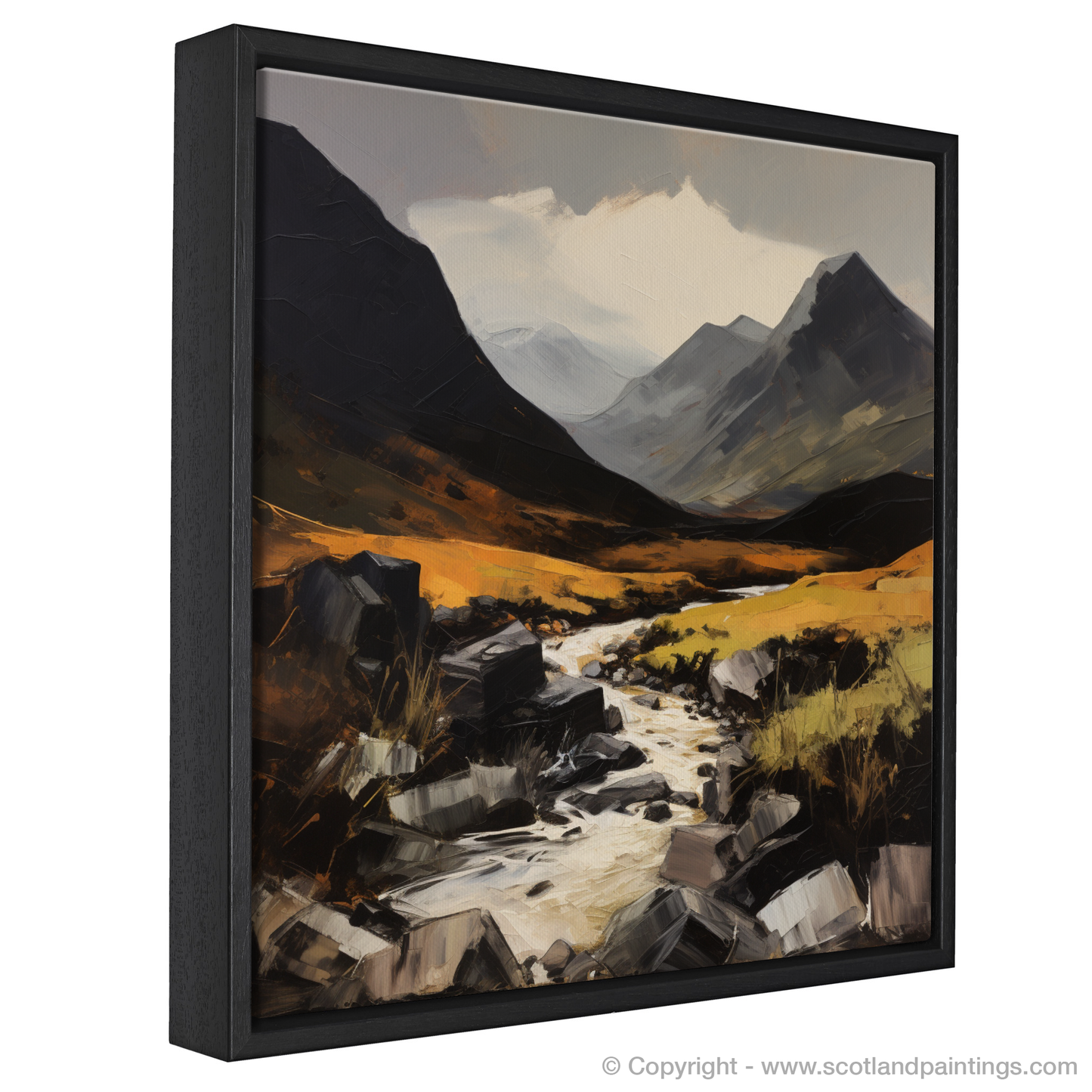 This captivating print is inspired by the rugged beauty of Glen Rosa on the Isle of Arran, capturing the essence of the landscape with a dynamic expressionist flair. Bold, impasto strokes ebb and flow across the canvas, creating a sense of movement and depth that brings the scene to life. Stark contrasts of light and shadow dance over craggy boulders and a meandering stream that cuts through the valley floor, reflecting the luminous sky above.