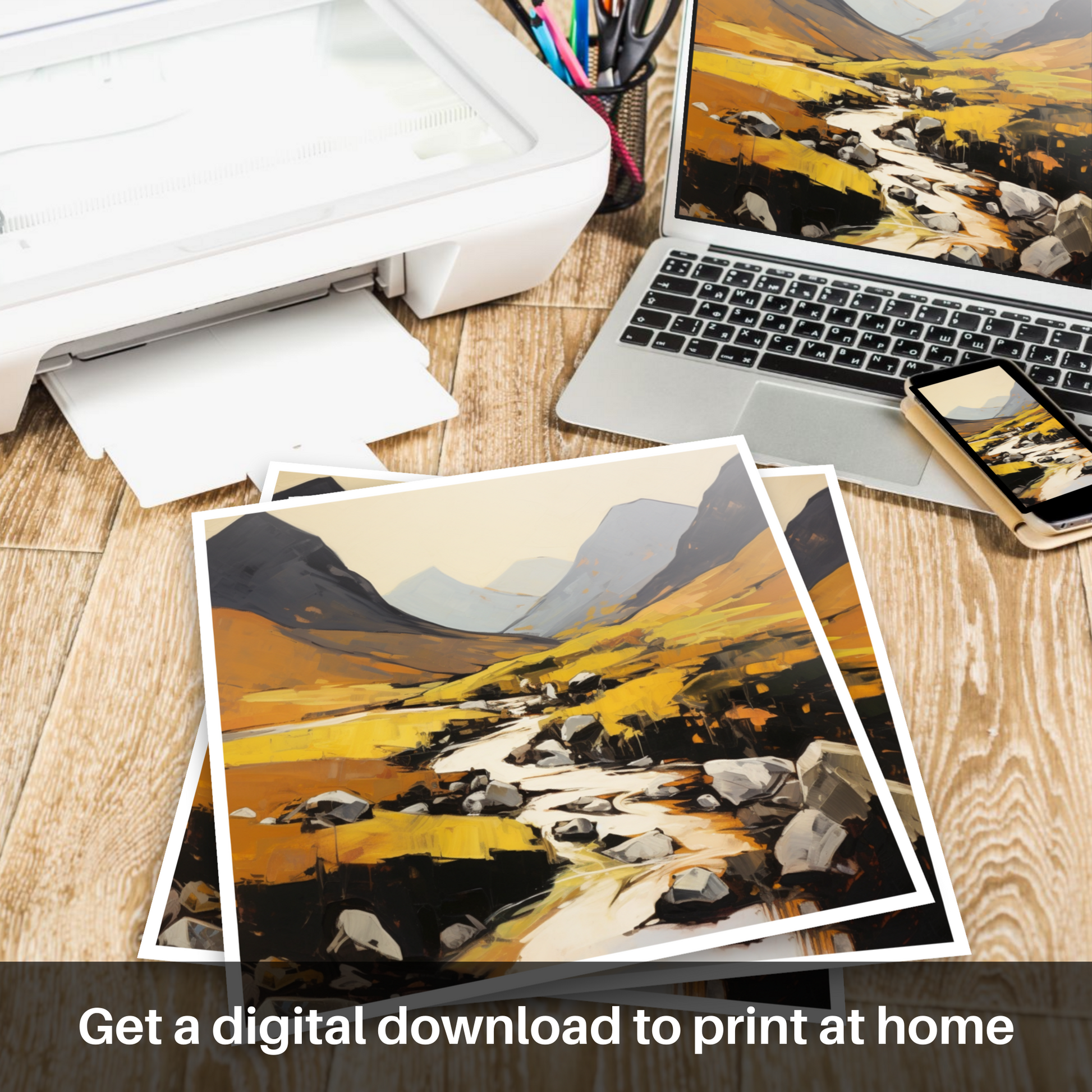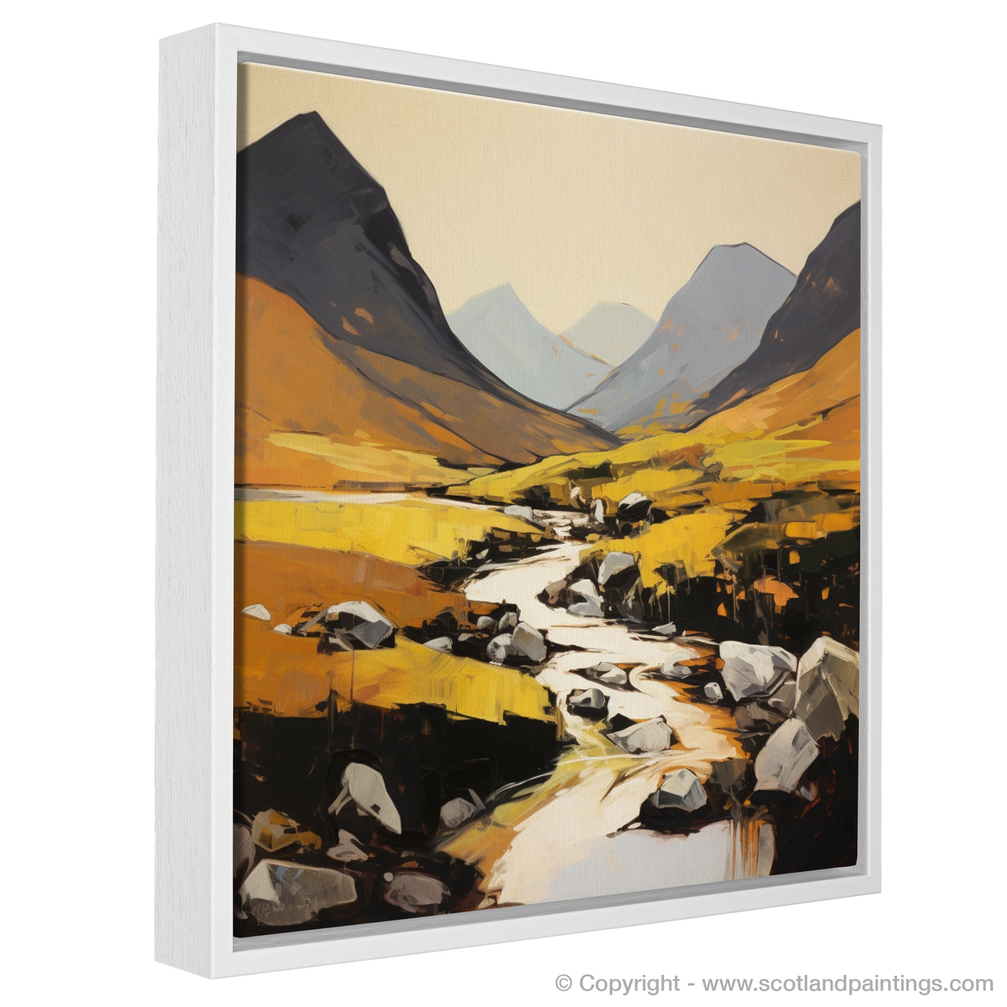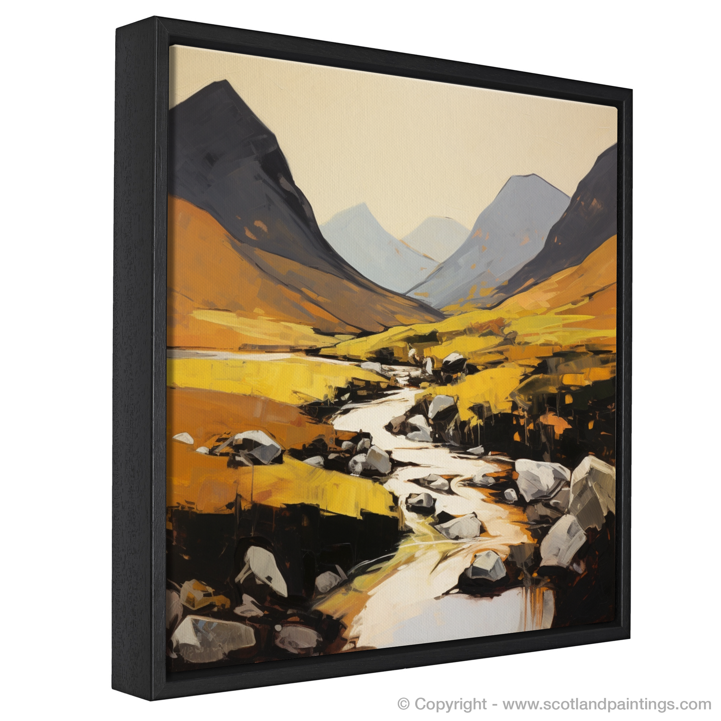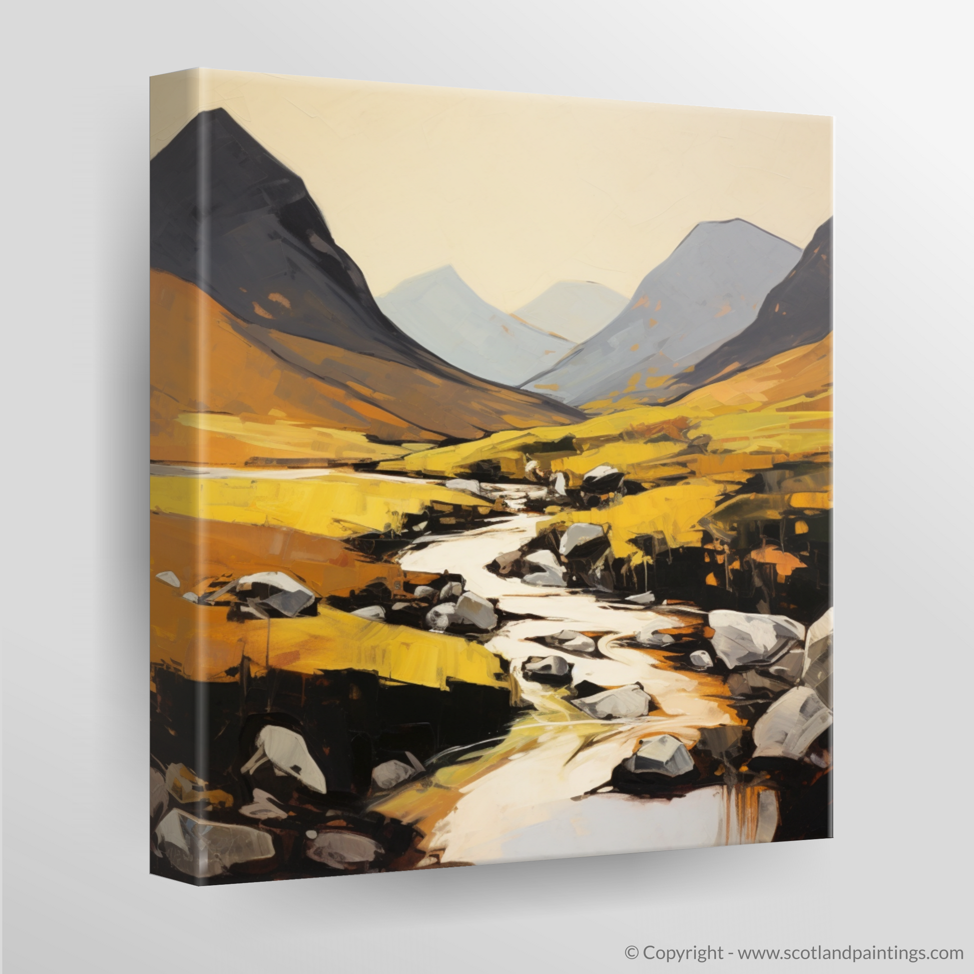In this piece, the sweeping contours of the glen reveal themselves in strokes of stark contrast and harmonious colours. The expansive canvas is dominated by undulating shades of warm ochres and amber, interspersed with the cool shadows of the towering mountains. These earthy tones suggest the untamed beauty of the glen's natural flora, glowing under a soft, implied light which seems to shift and play across the landscape.