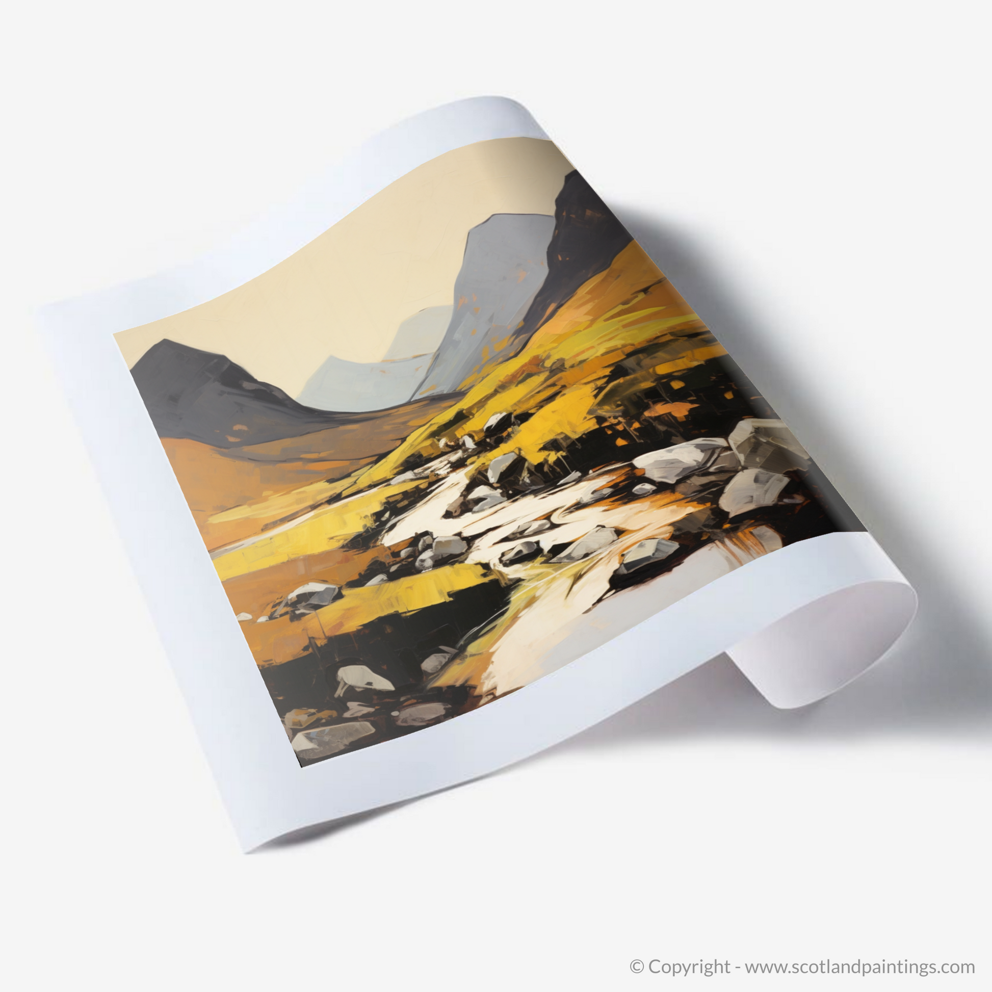 Discover the rugged beauty of Scotland's landscapes through this evocative expressionist print, capturing the raw vitality of Glen Rosa on the Isle of Arran. The artist employs a symphony of bold, emotive brushstrokes to transport viewers into a scene alive with movement and energy.