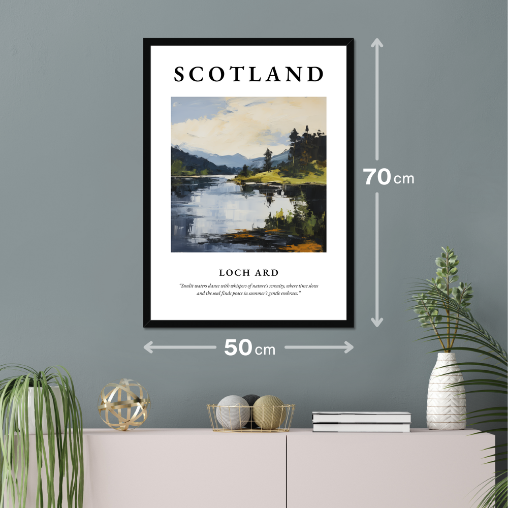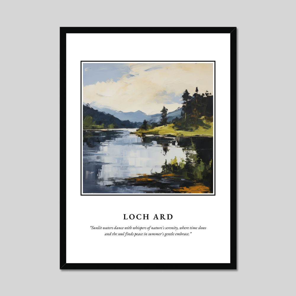 Introducing a breathtaking expression of Scotland's serene beauty, this framed poster print captures the essence of Loch Ard with vibrant intensity. Measuring 50cm x 70cm, this striking piece is a testament to the captivating charm of Scotland's landscapes, ideal for those who hold a place in their heart for this enchanting country. Whether you've wandered the paths near Loch Ard, dream of visiting, or simply appreciate the emotive power of Expressionism, this poster is a fitting tribute to the soul of Scotland.