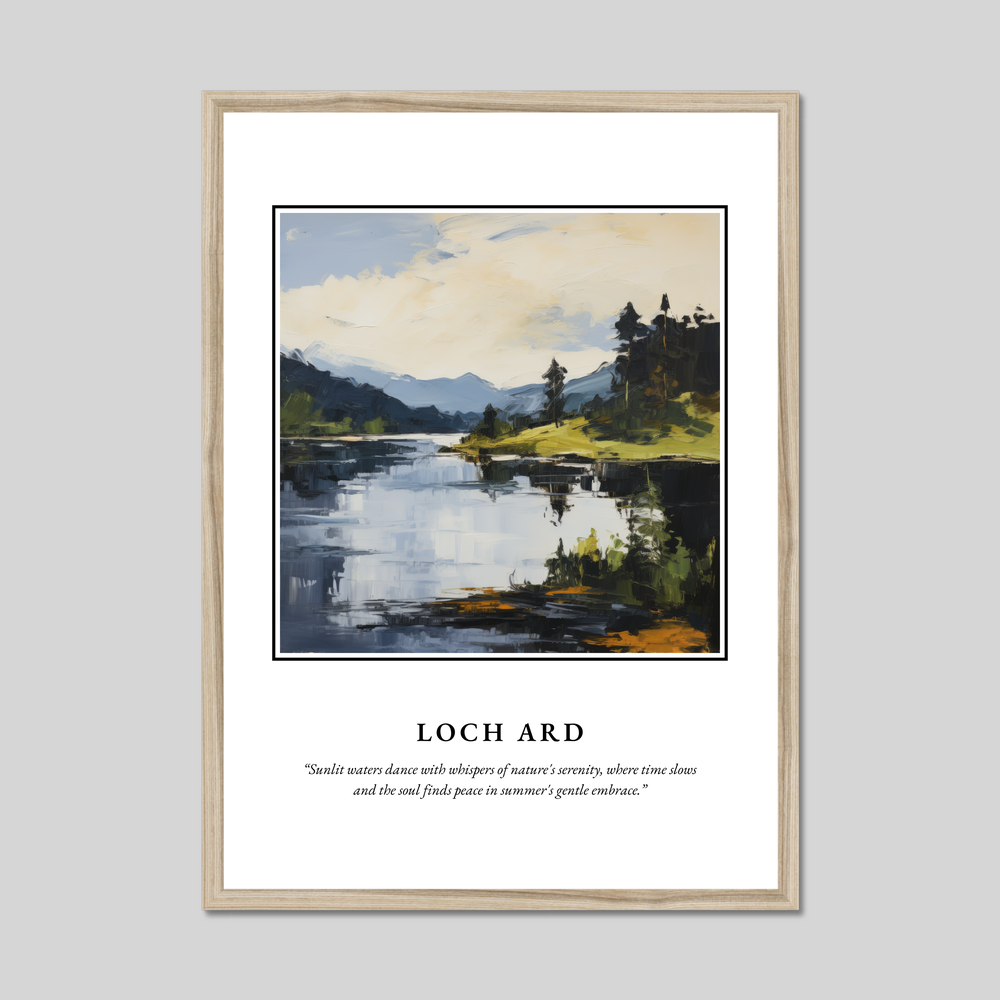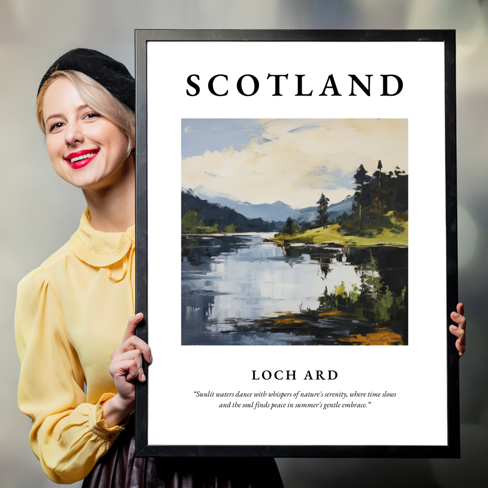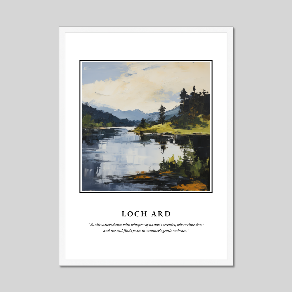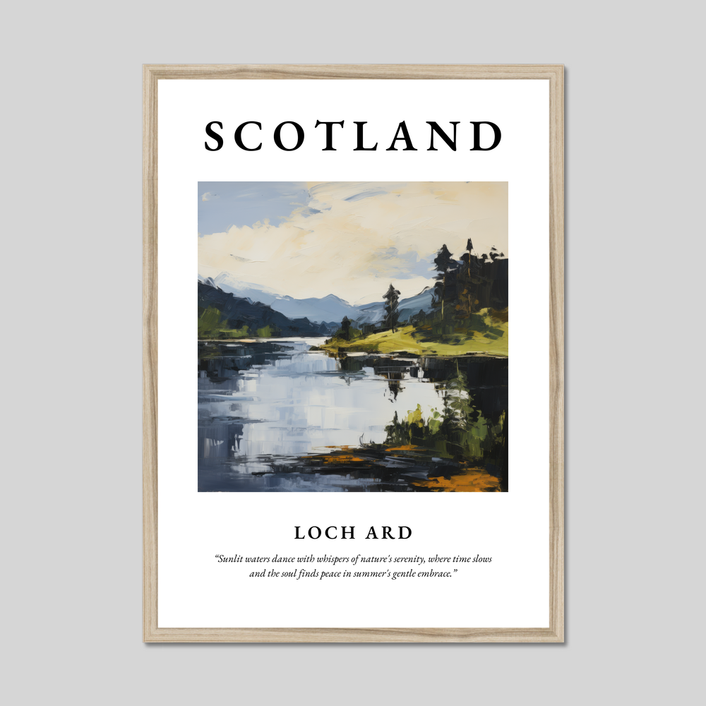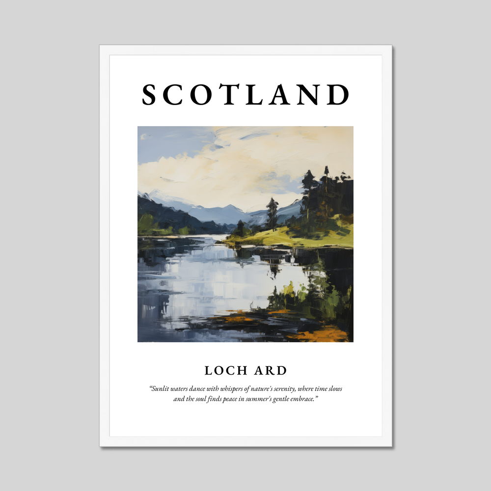 The top of the poster proudly displays “SCOTLAND” in bold lettering, reminiscent of the land's robust spirit. Below, the expressive painting of Loch Ard unfolds, translating the vivid whispers of the Highlands into a dance of colour and form. The gentle swirls and bold strokes bring the landscape to life, capturing the light's play on water and hills in a reflection of nature’s tranquility. Beneath the painting lies an evocative quote: "Sunlit waters dance with whispers of nature's serenity, where time slows and the soul finds peace in summer's gentle embrace." This sentiment echoes the experience of those who have felt the quietude and majesty of Loch Ard.