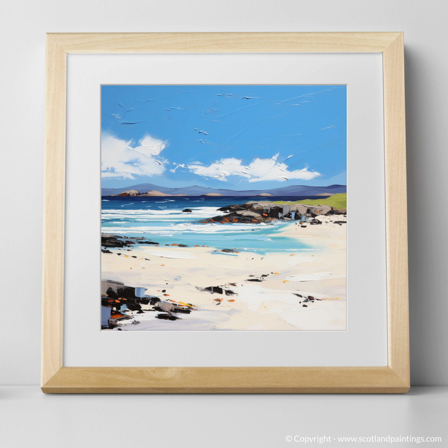 Capture the essence of Scottish summertime with a vibrant print inspired by the picturesque Scarista Beach on the Isle of Harris. Bold brushstrokes and vivid colours encapsulate the dynamic beauty of the Hebrides, transporting you to a world where the azure sky meets the clear waters of the Atlantic.