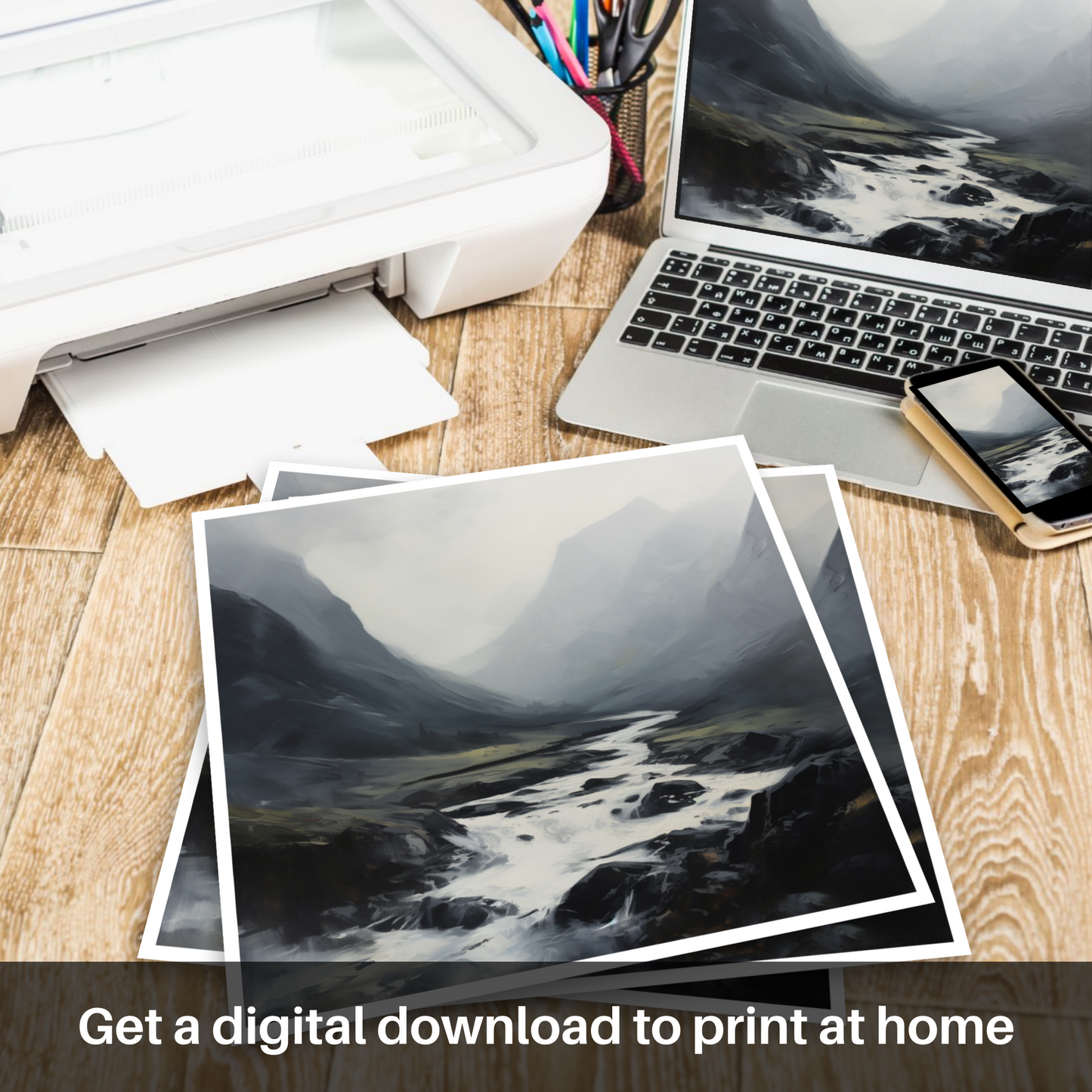This expressionistic piece is not merely a visual treat; it is an invitation to ponder the powerful silence and solitude that such a natural wonder inspires. Whether adorning a living space, study, or hallway, this print promises to evoke contemplation and admiration for the raw beauty of Glencoe’s majestic landscape.