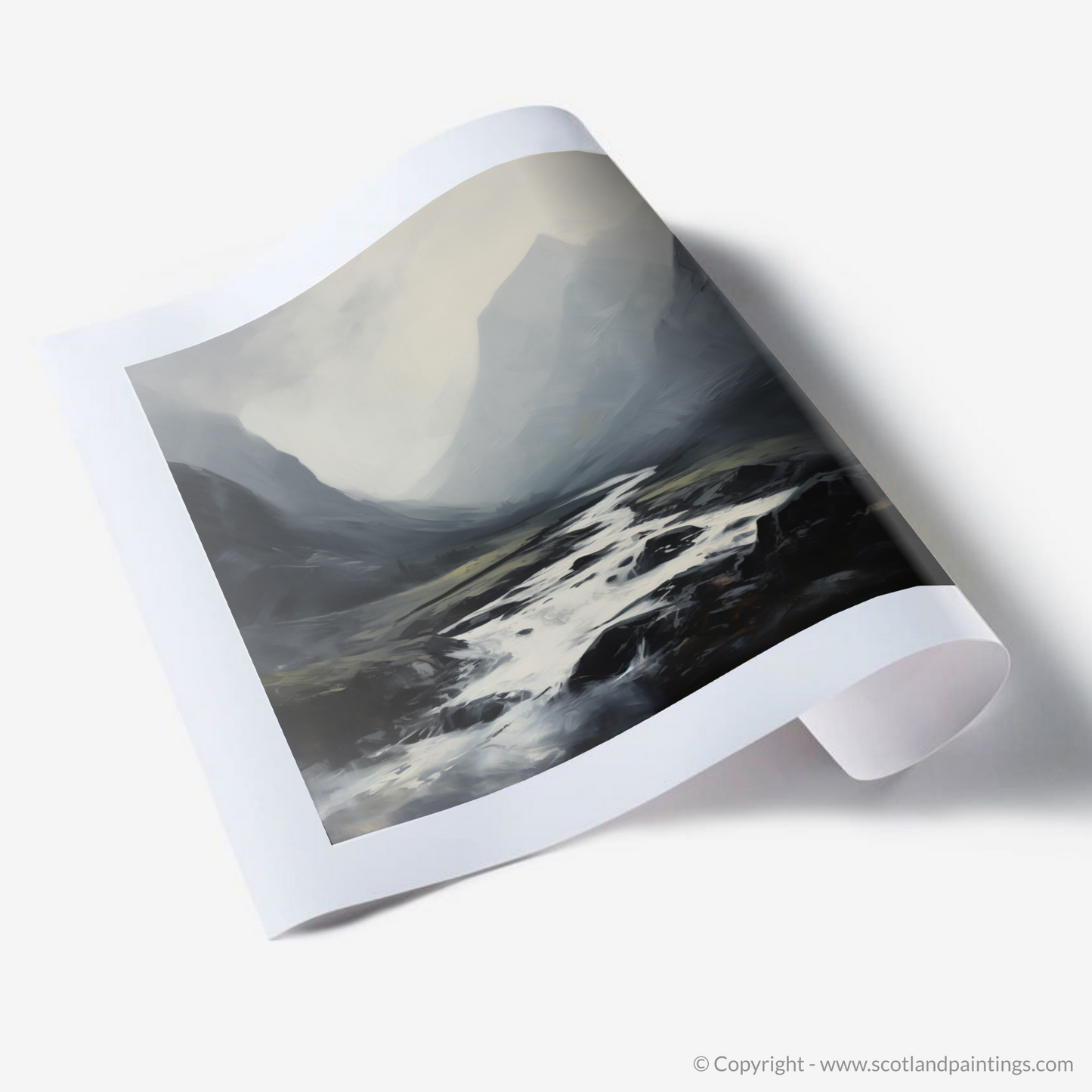 Capturing the ethereal beauty of Glencoe, this evocative print brings the mesmerising spectacle of rolling fog amidst the rugged Scottish Highlands into your space. Dramatic shades of grey, black, and white meld together, creating a visual symphony that embodies the raw intensity and moody atmosphere unique to this enchanting landscape.