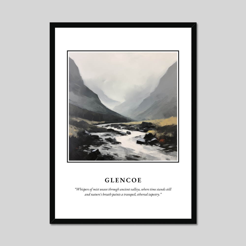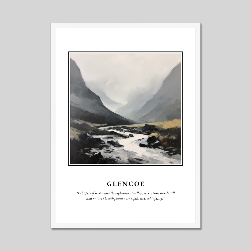 This expressionist portrayal of Glencoe captures the valley's ethereal atmosphere with sweeping brushstrokes and a haunting blend of colours. The mists are vivid whispers of grey and white, meandering through rugged valleys, capturing the essence of a landscape where time pauses and nature whispers. Beneath this mesmerising image, the evocative quote ties the visual and the ethereal together, adding layers of depth to your décor.