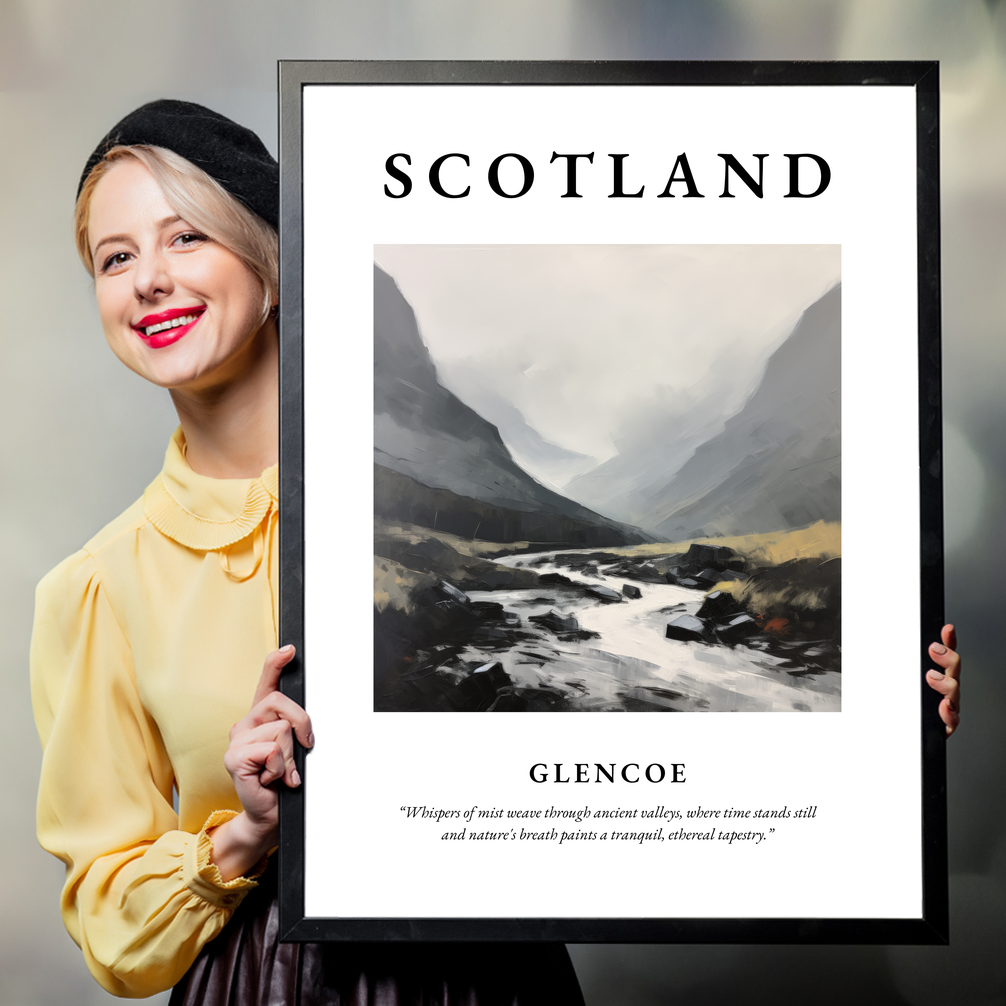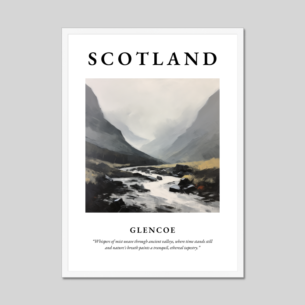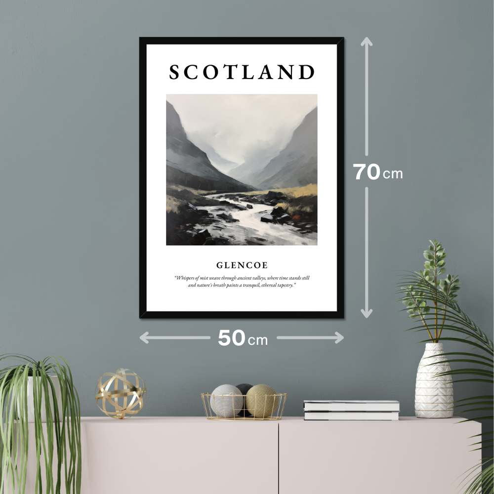 Transform your living space with the captivating allure of Scotland's natural beauty, encapsulated in our expansive 50cm x 70cm framed poster print. Featuring the majestic Glencoe, this stunning piece is a perfect fusion of expressionist art and the timeless mystique of the Scottish Highlands. The bold typography of "SCOTLAND" crowns the artwork, reflecting national pride and setting the stage for the breathtaking scene below.