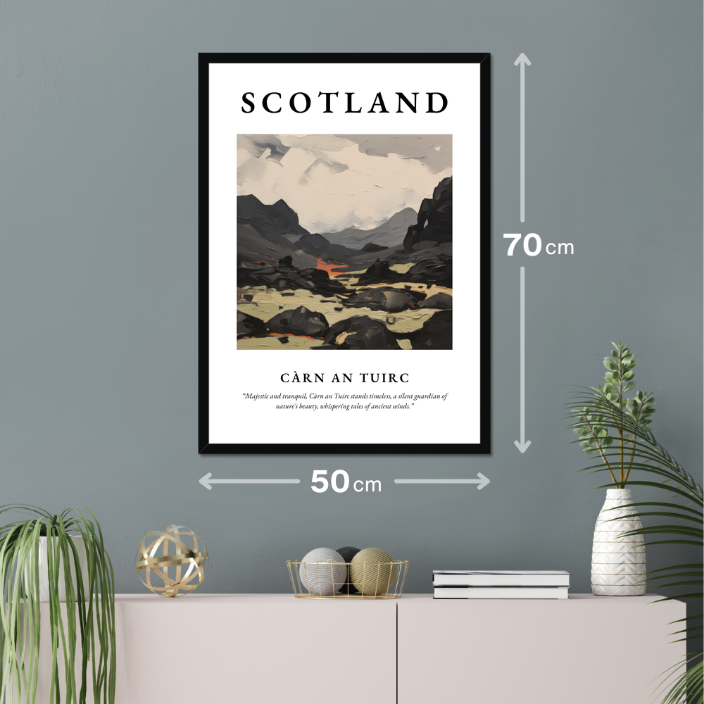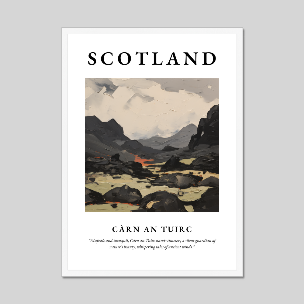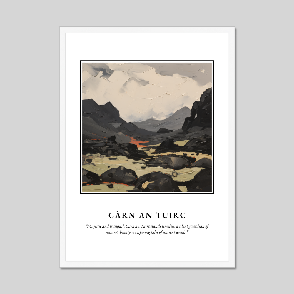 Just below the evocative painting, a poignant quote reads: "Majestic and tranquil, Càrn an Tuirc stands timeless, a silent guardian of nature's beauty, whispering tales of ancient winds." This sentiment invites reflection and a deeper appreciation of the untamed majesty that the poster encapsulates. Despite its grand size, this affordable piece offers a commanding presence without overwhelming your budget—ideal for covering large wall spaces with artistic flair.