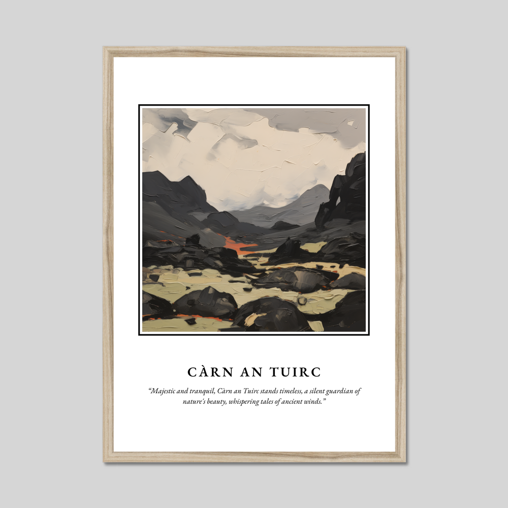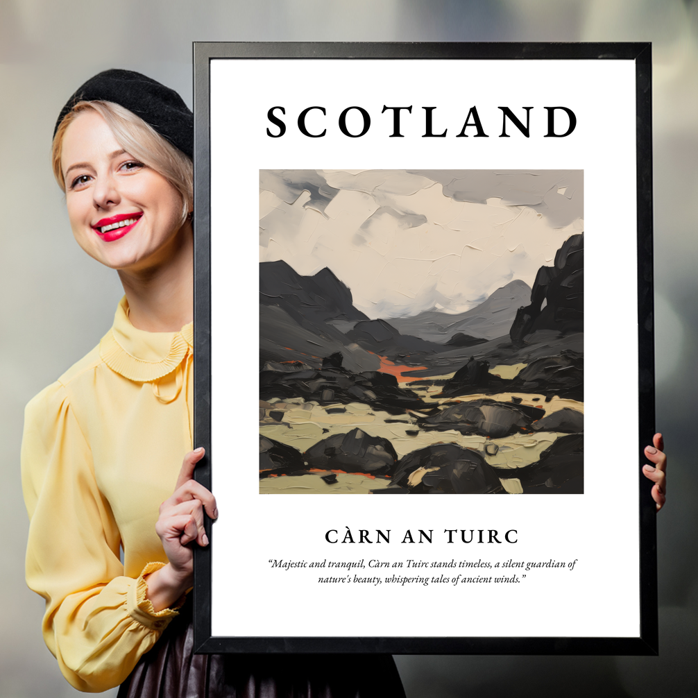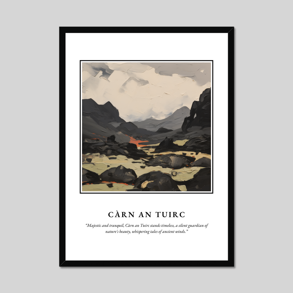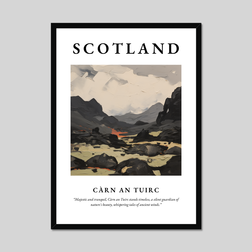 Just below the evocative painting, a poignant quote reads: "Majestic and tranquil, Càrn an Tuirc stands timeless, a silent guardian of nature's beauty, whispering tales of ancient winds." This sentiment invites reflection and a deeper appreciation of the untamed majesty that the poster encapsulates. Despite its grand size, this affordable piece offers a commanding presence without overwhelming your budget—ideal for covering large wall spaces with artistic flair.