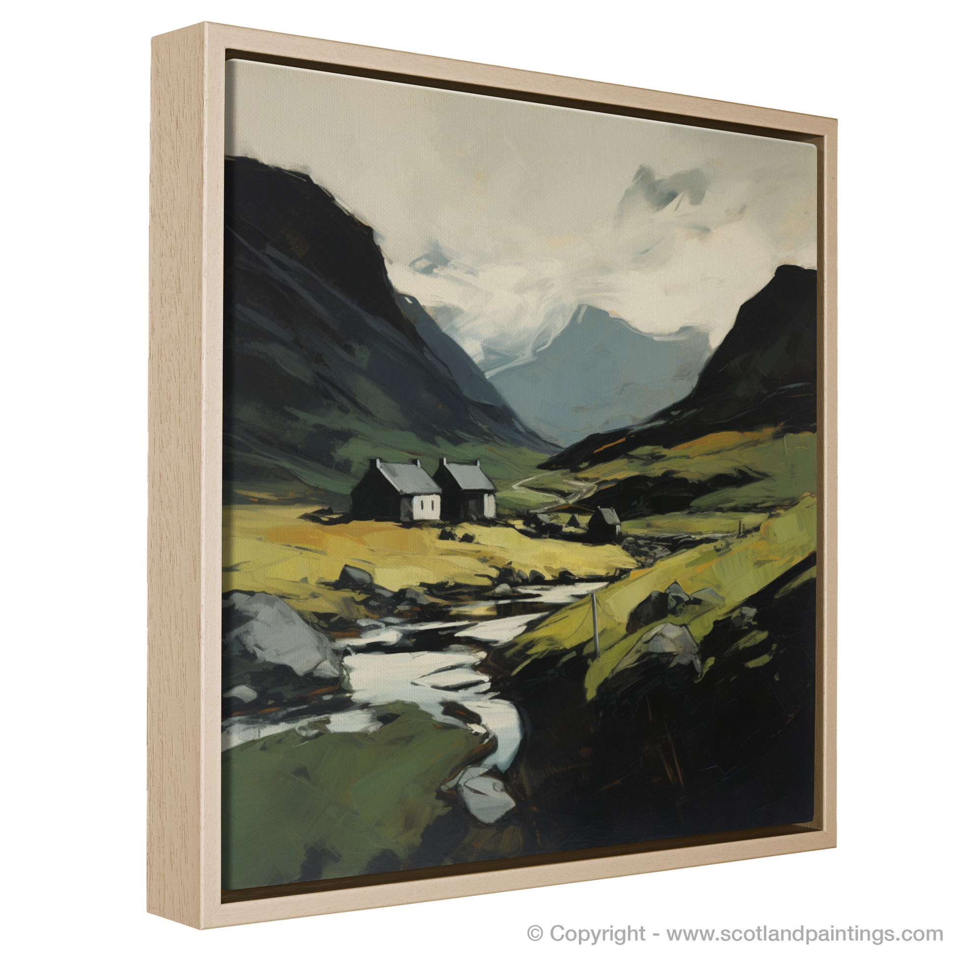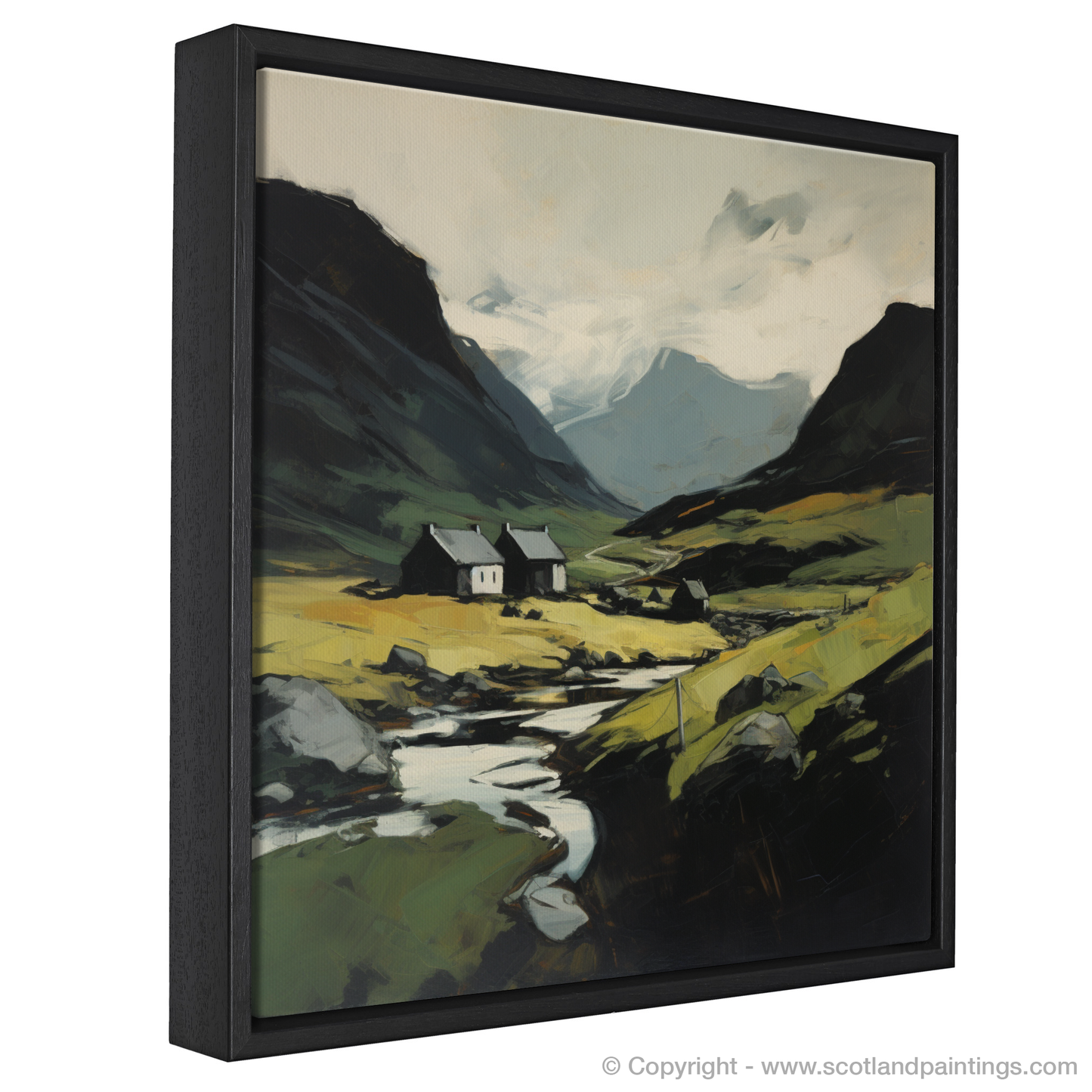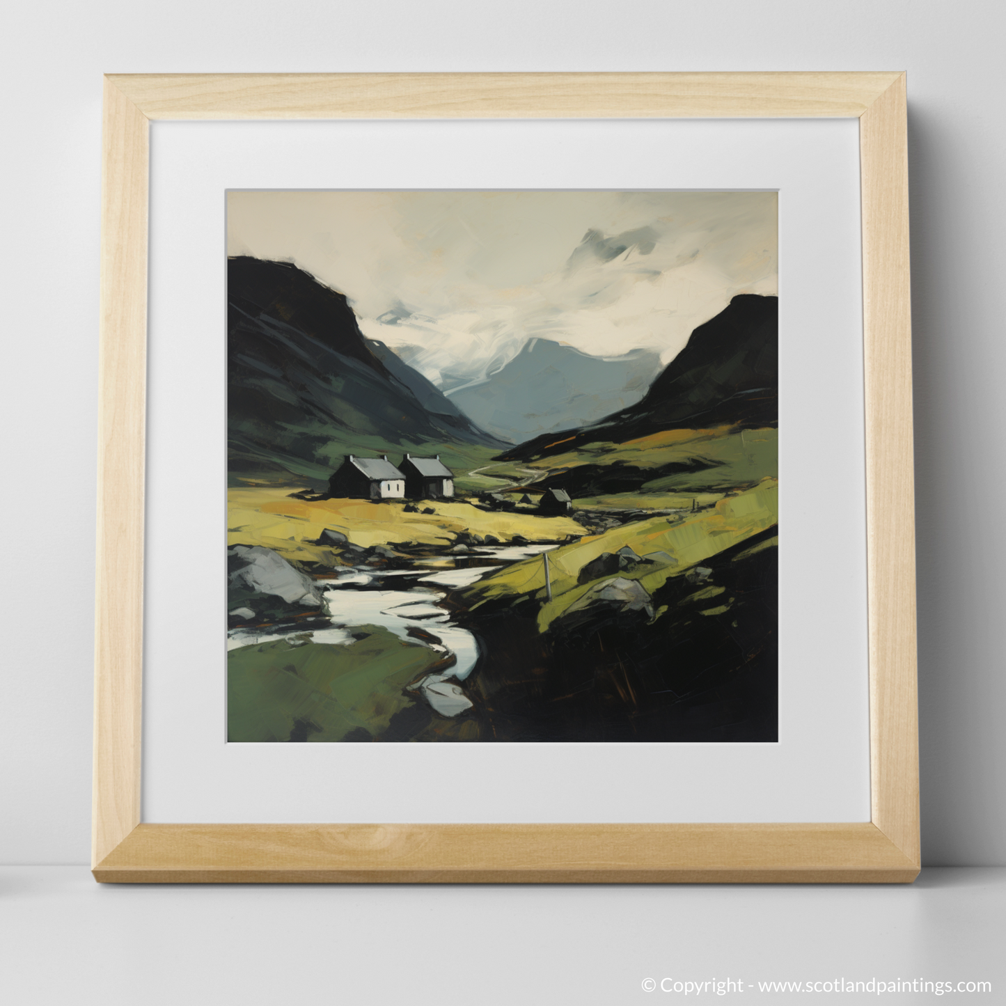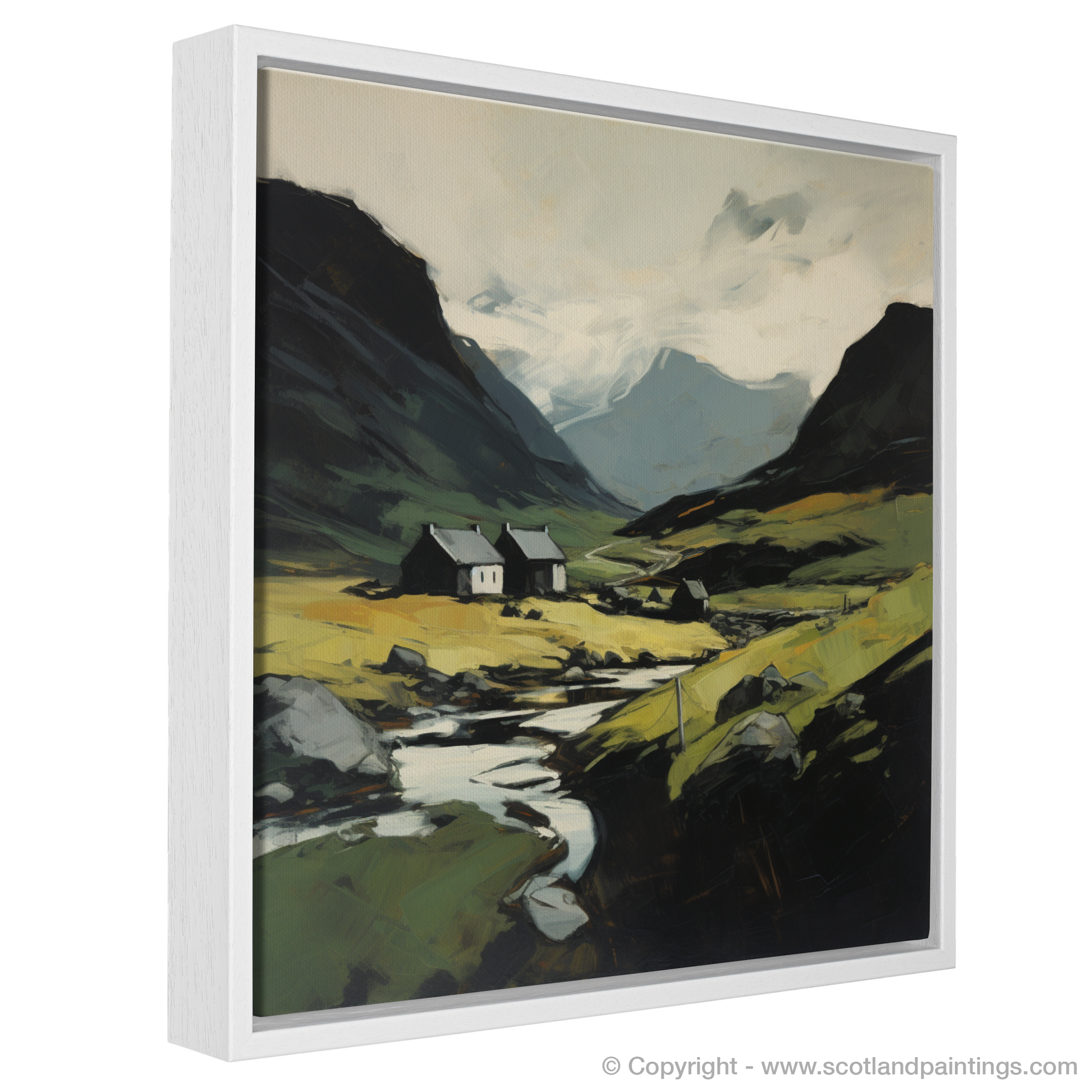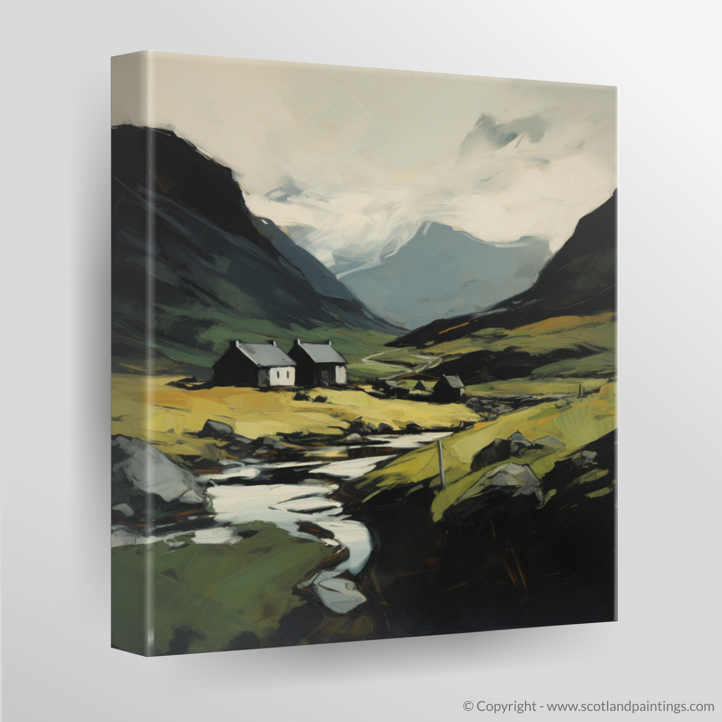 The composition is centred around a cluster of quaint white cottages, nestled serenely in the valley, their simplicity forming a striking contrast against the complexity of nature. Golden hues infuse the foreground, suggesting the wild grasses and heaths that flourish in the open glens, gilded by the transient Scottish sun.