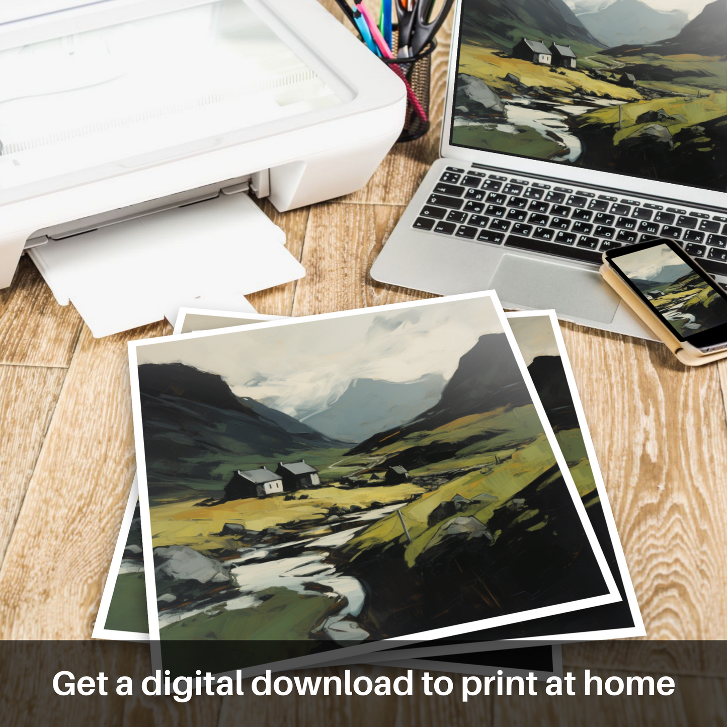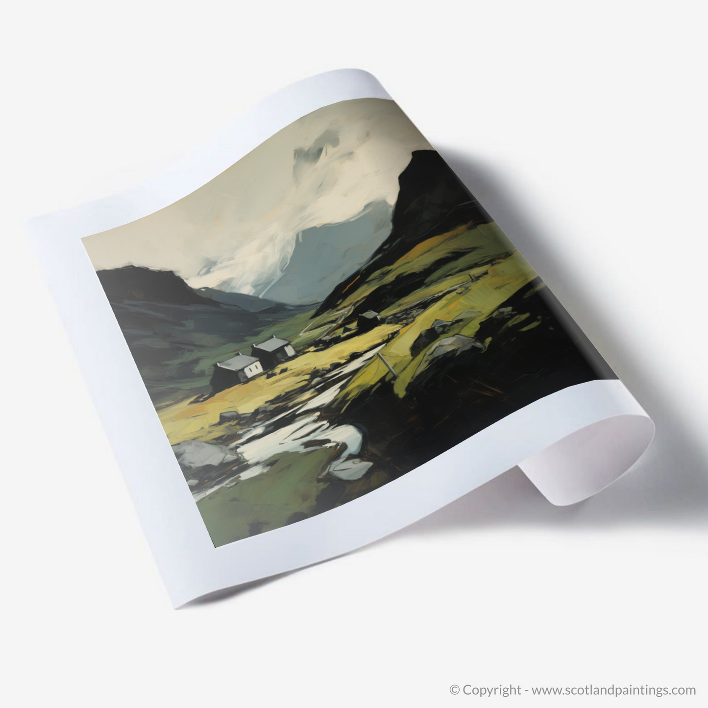 Capture the raw beauty of the Scottish highlands with this evocative expressionist print inspired by Càrn an Tuirc. Bold brushstrokes blend with a moody palette to depict a timeless landscape, where the interplay of light and shadow brings the rugged terrain to life.